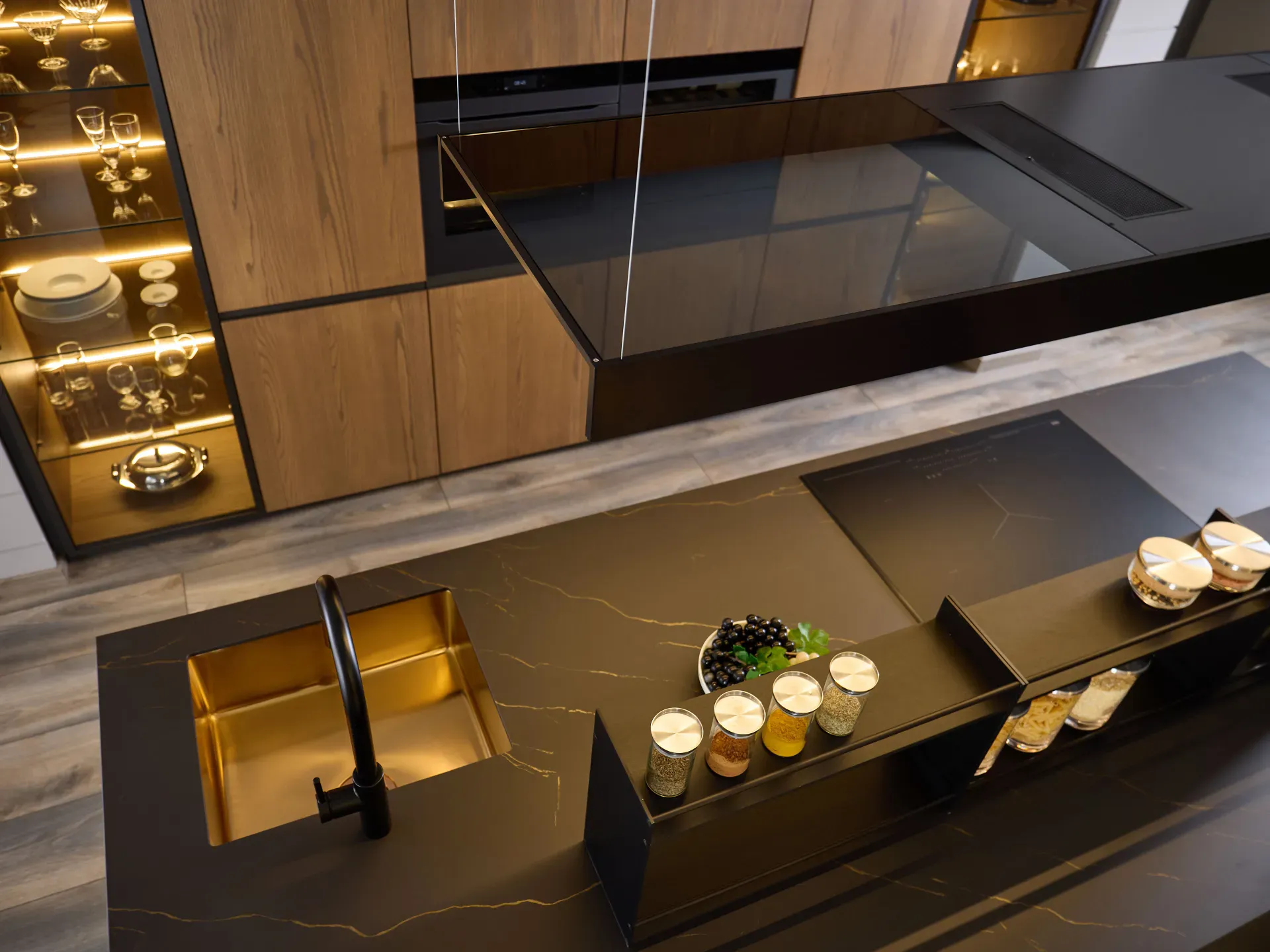 Numa Six 01 outlet è una cucina dal design raffinato che combina il nero opaco con il calore del legno. Il fulcro del progetto è l'isola con lavello e piano cottura, realizzata interamente in HPL Ambassador 466, una superficie caratterizzata da eleganti venature dorate che decorano in continuità piano, fianchi, ante e cassetti. Questo total look nero opaco con accenti oro crea un effetto visivo continuo tra tutte le superfici, conferendo alla cucina un'estetica estremamente lussuosa e curata nei minimi dettagli.