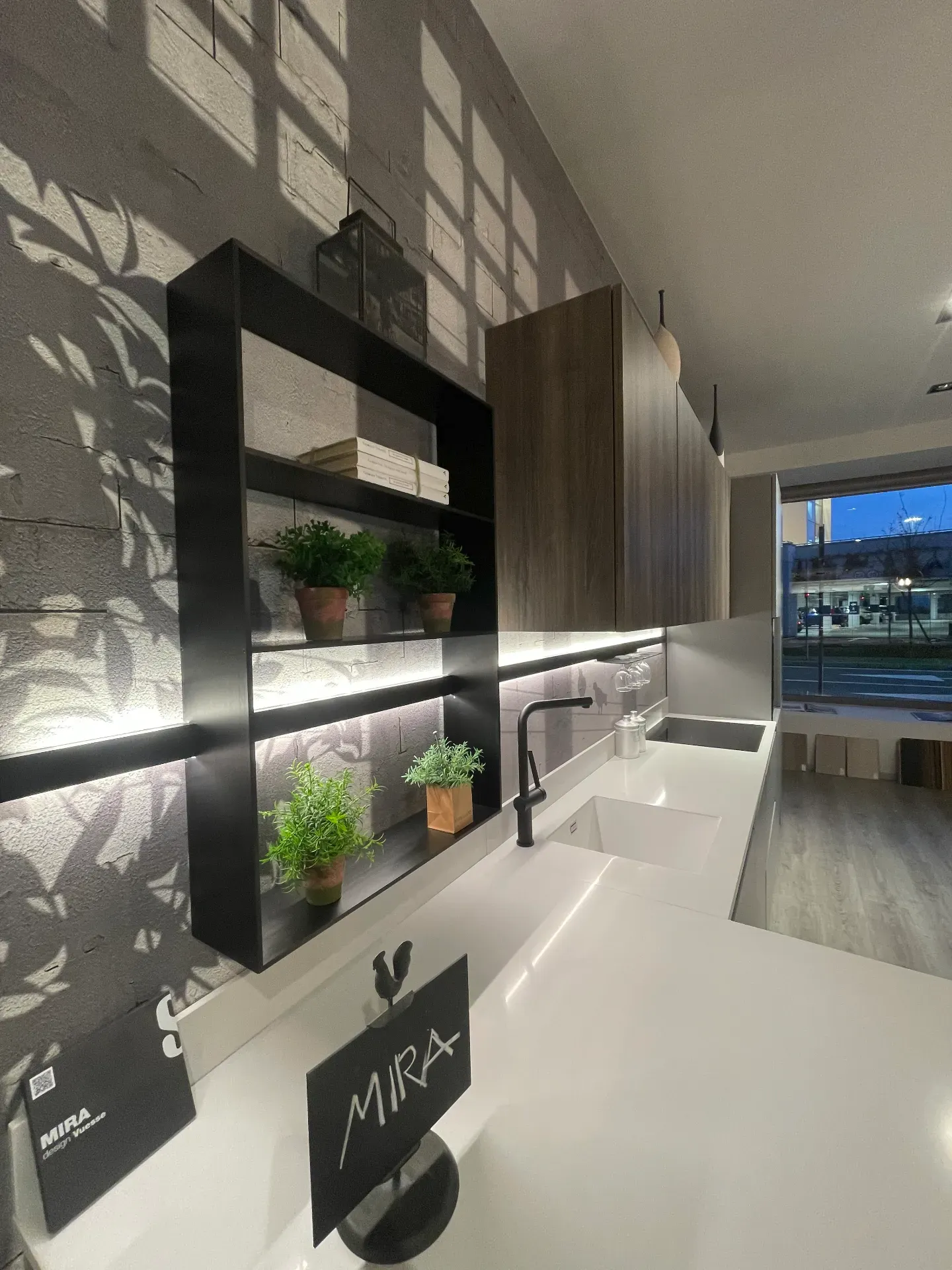 La cucina Scavolini modello Mira si distingue per le sue linee pulite e le superfici raffinate, con ante caratterizzate da un elegante inserto in acciaio che dona sofisticata personalità all intera composizione.