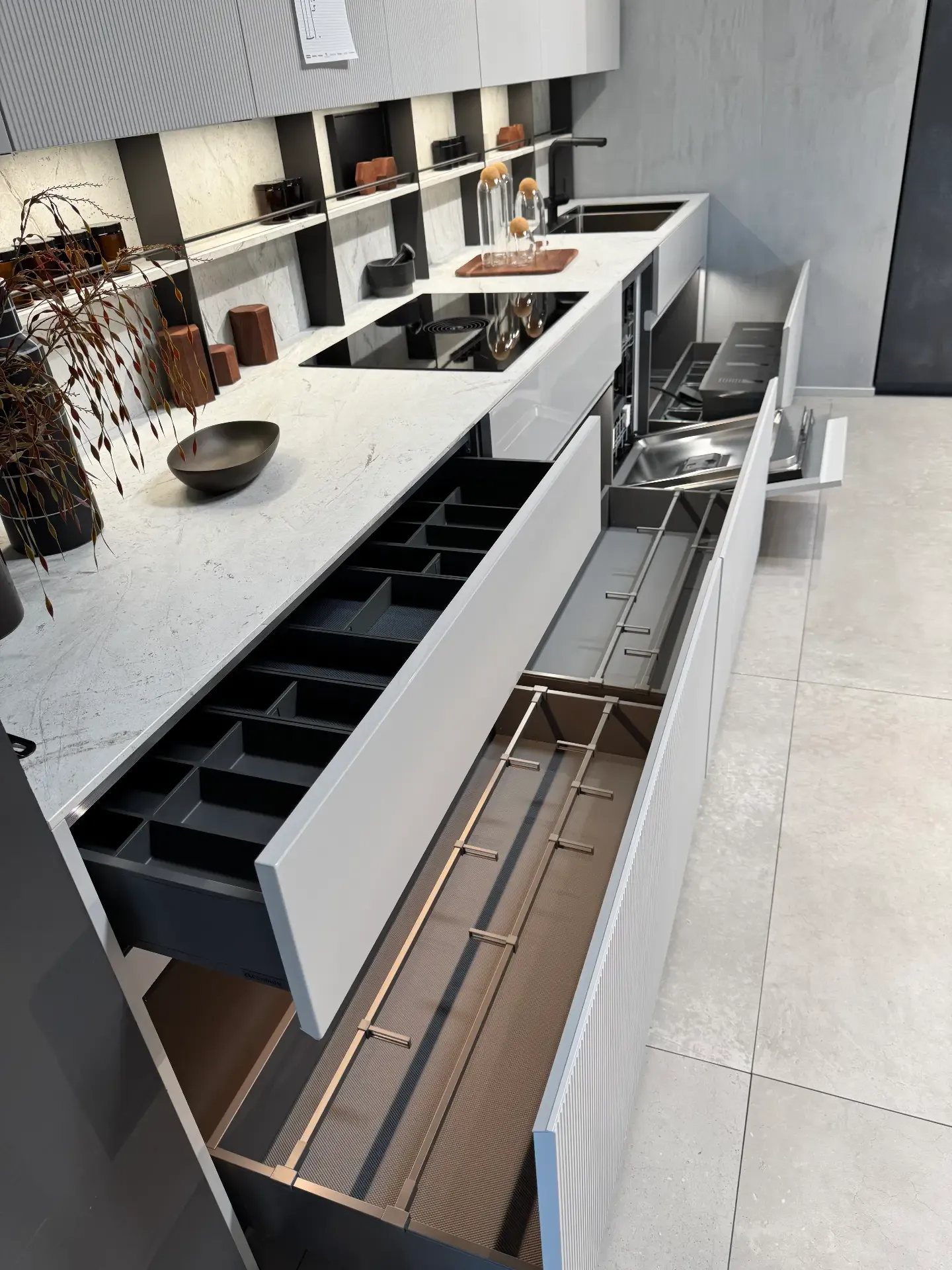 Questa cucina Kelly è disposta lineari, ma potremo indicarti anche ulteriori assetti, sempre disegnate per te ed in materiali pregiati.