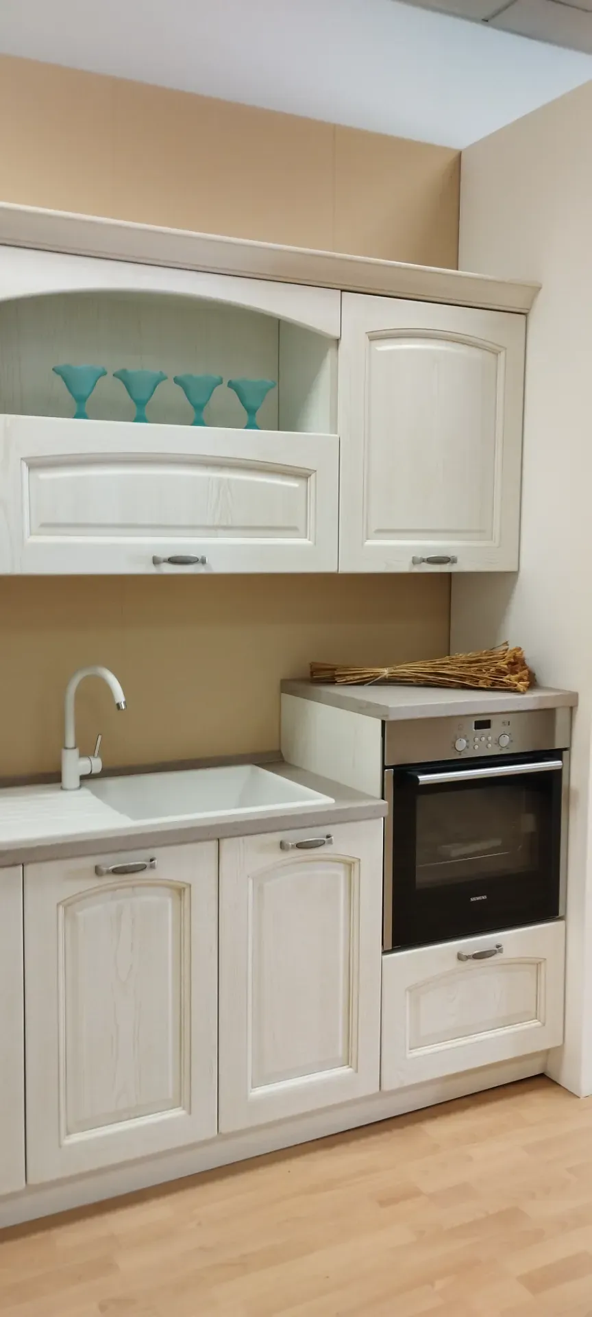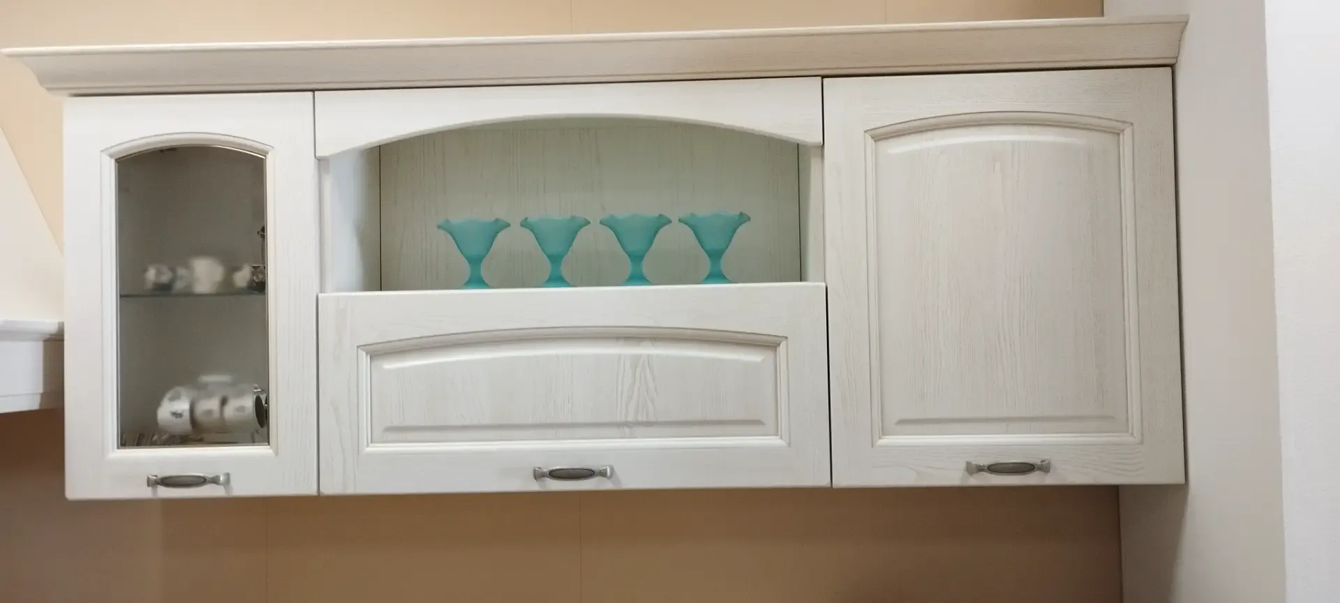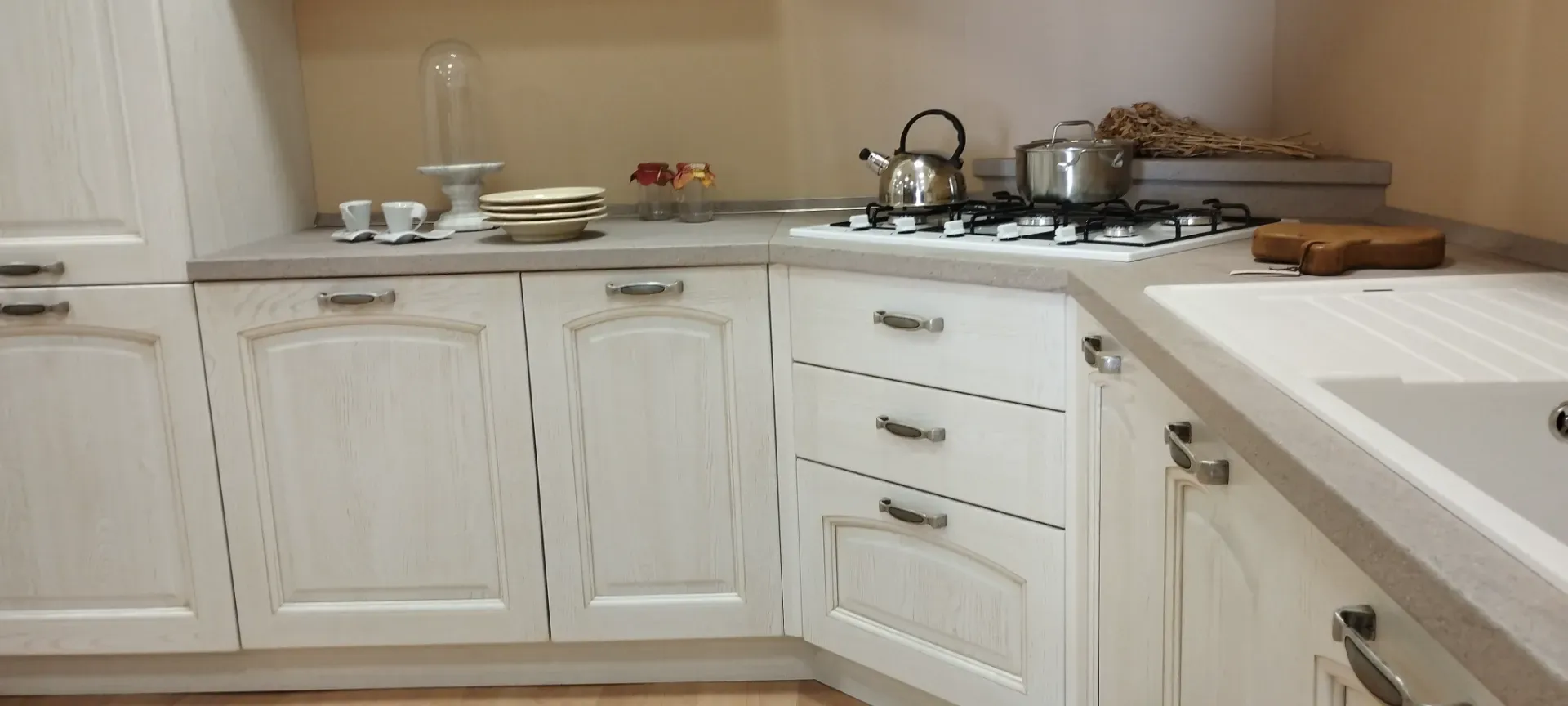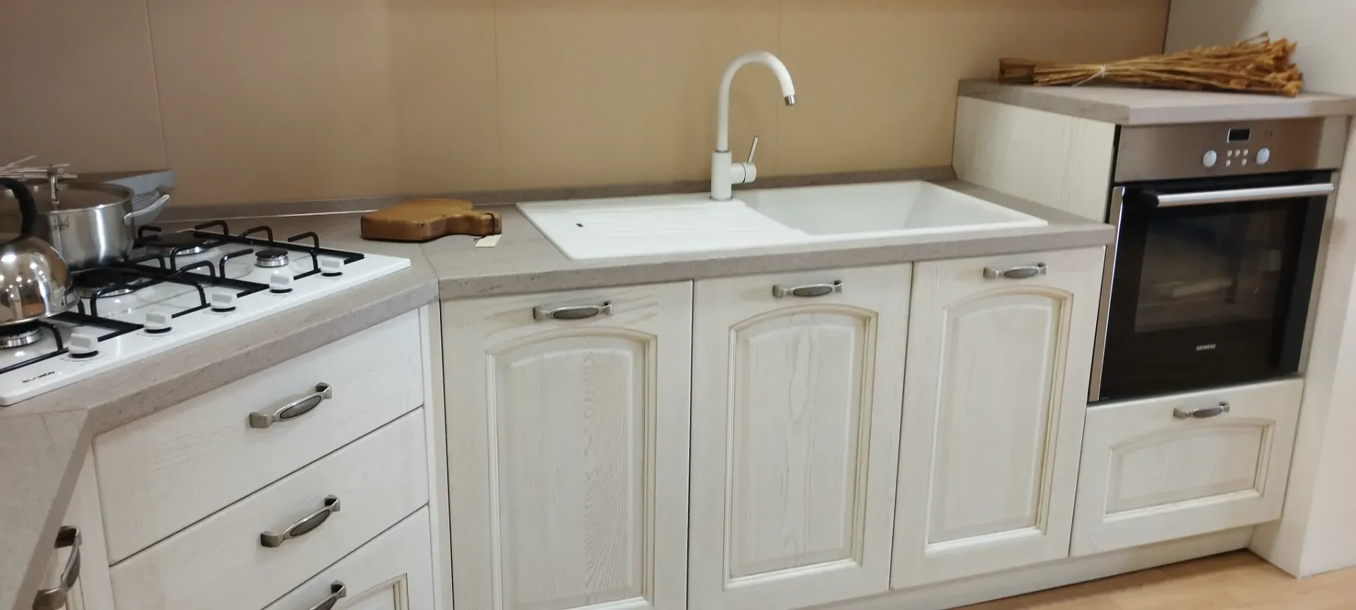 Arredo3 ha scelto di realizzare in legno la cucina Emma ora scontata, materiale resistente nel tempo ma anche esteticamente apprezzabile e elegante.