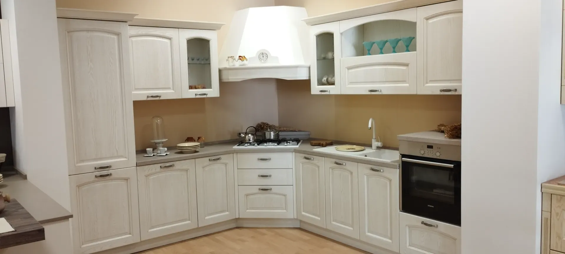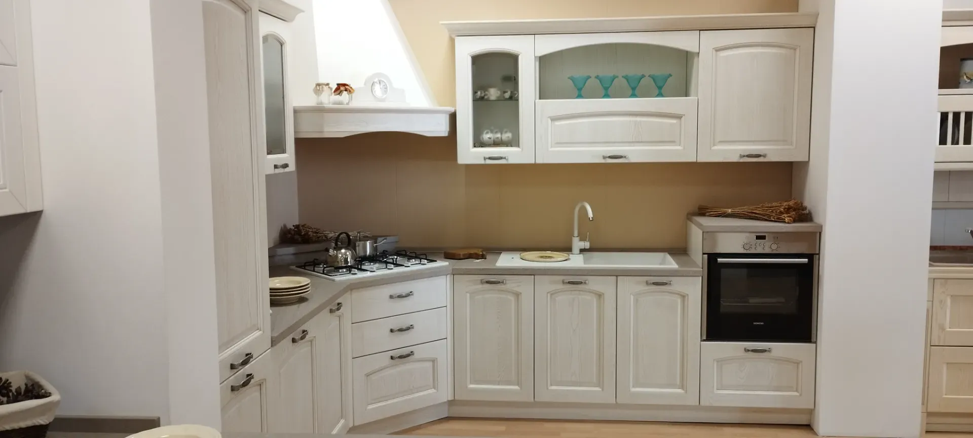 Ultimare al meglio la tua cucina con il modello dei tuoi sogni non sarà complicato grazie a questa Cucina Arredo3 in Legno Ad angolo scontata a soli 8900 Euro. Con Emma ad un prezzo imperdibile scontato del 40% avrai ciò che desideri ad un prezzo minore rispetto a quello da listino.