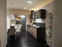 Cucina angolare, con colonna lavanderia/dispensa, dotata di illuminazione interna pensili e ripiani interni, base piano cottura h 60 e top sp 18 cm con ante scorrevoli decorate, pensili con anta in vetro decorato stile industrial. dimensioni 440x272 cm