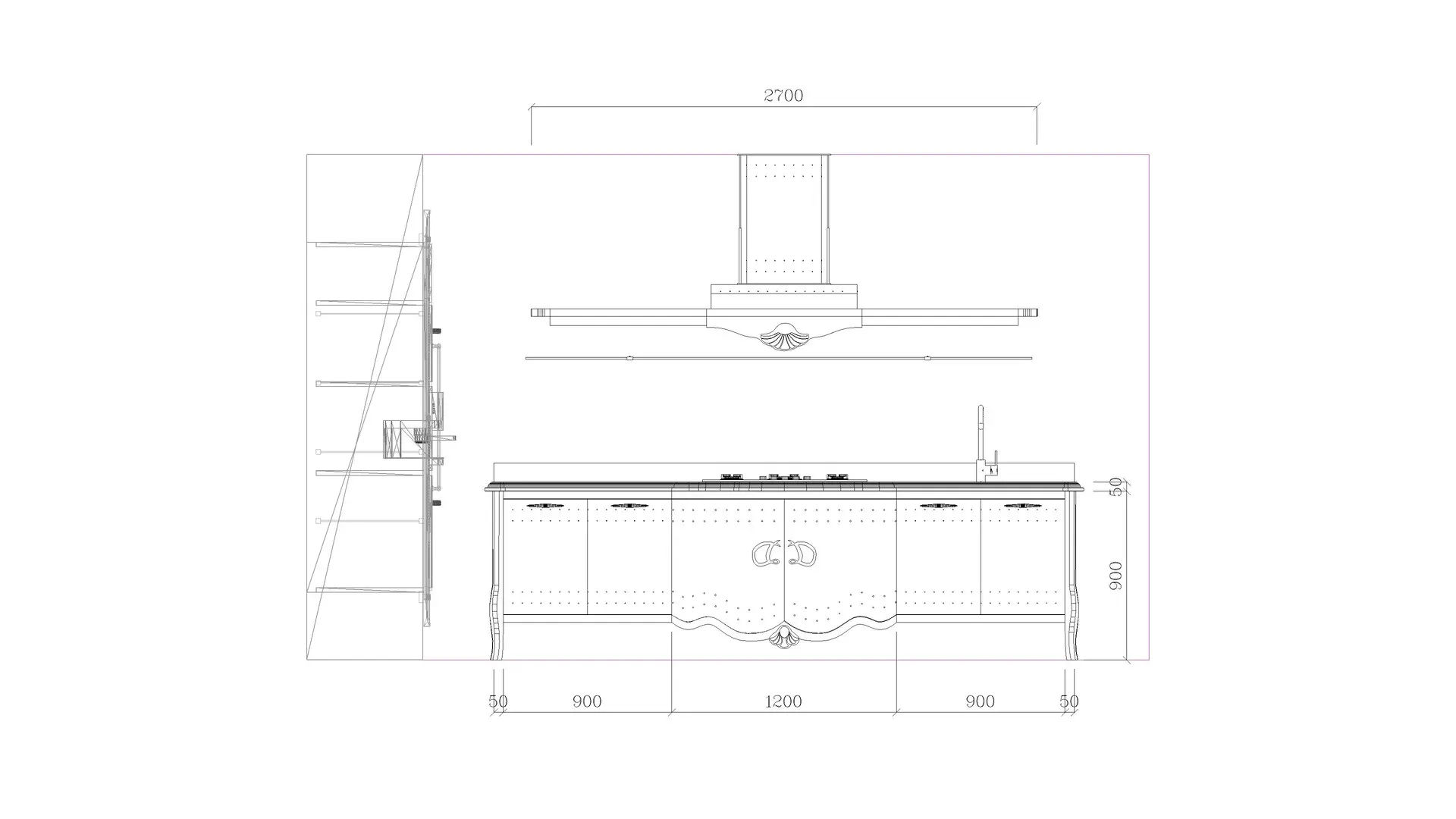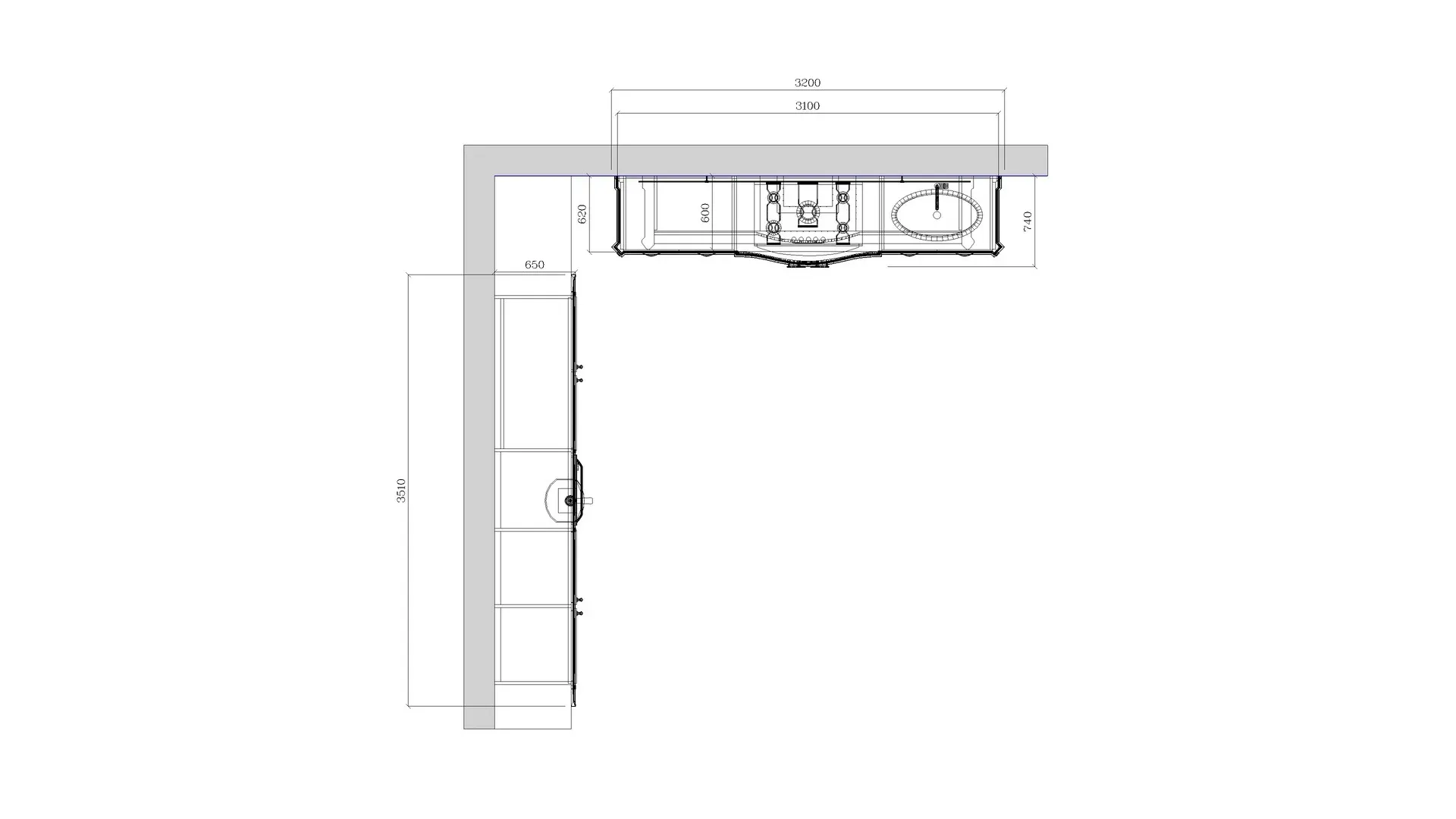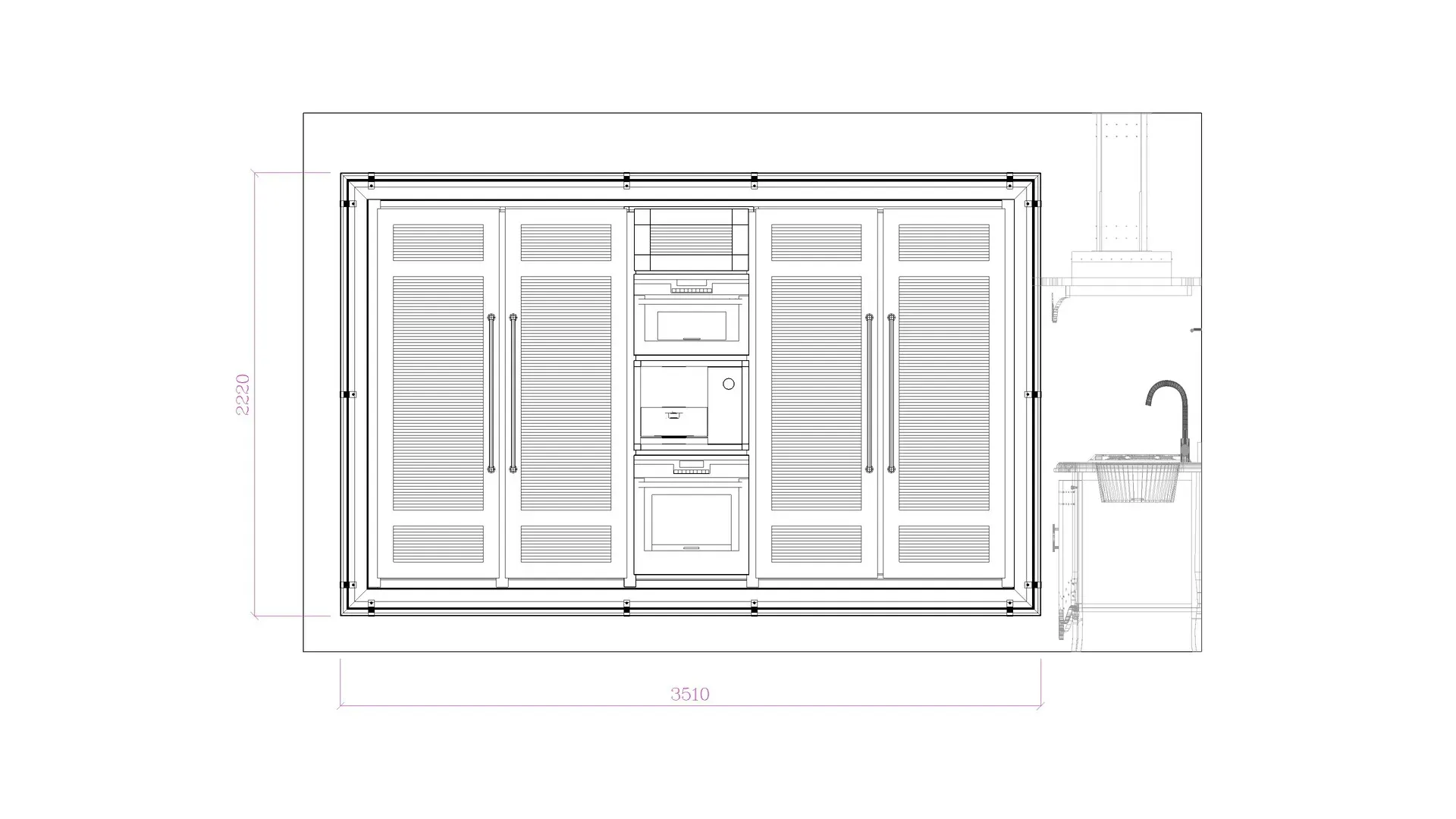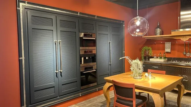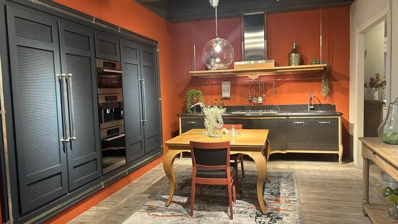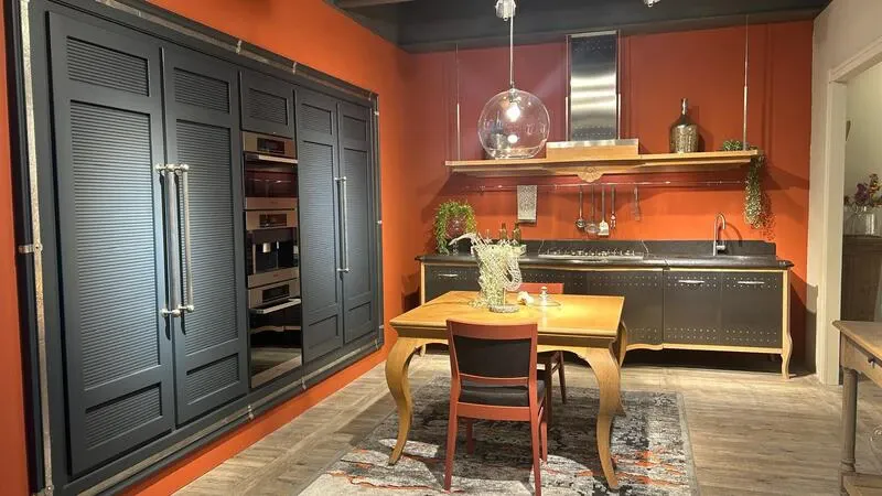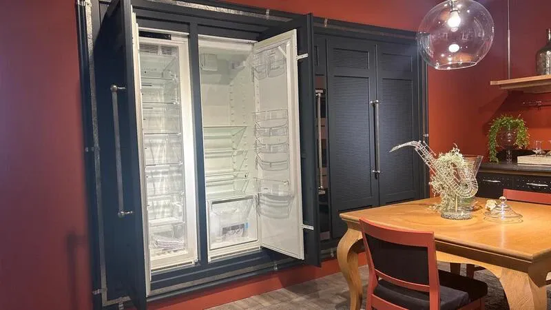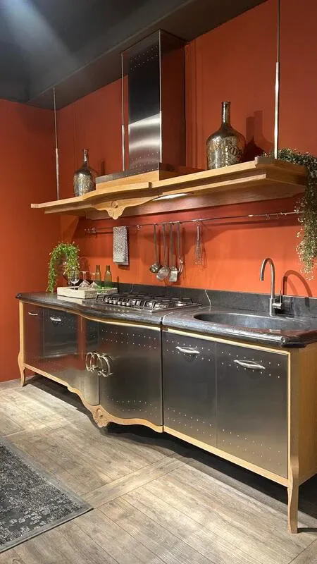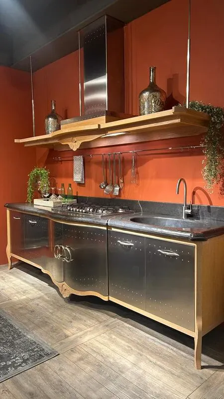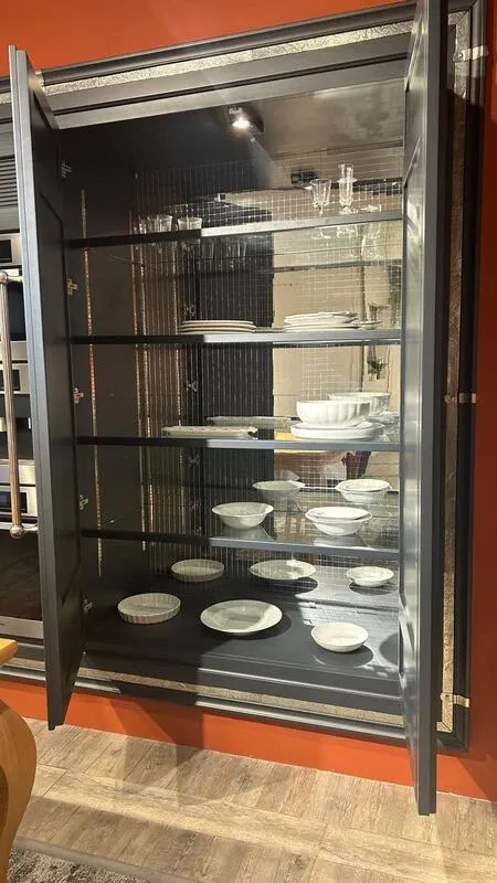 composizione da expo , sviluppata ad angolo su 2 parete ma facilmente modificabile . La grande dispensa nasconde frigo congelatore , forno micro, macchina caffè e grande dispensa .