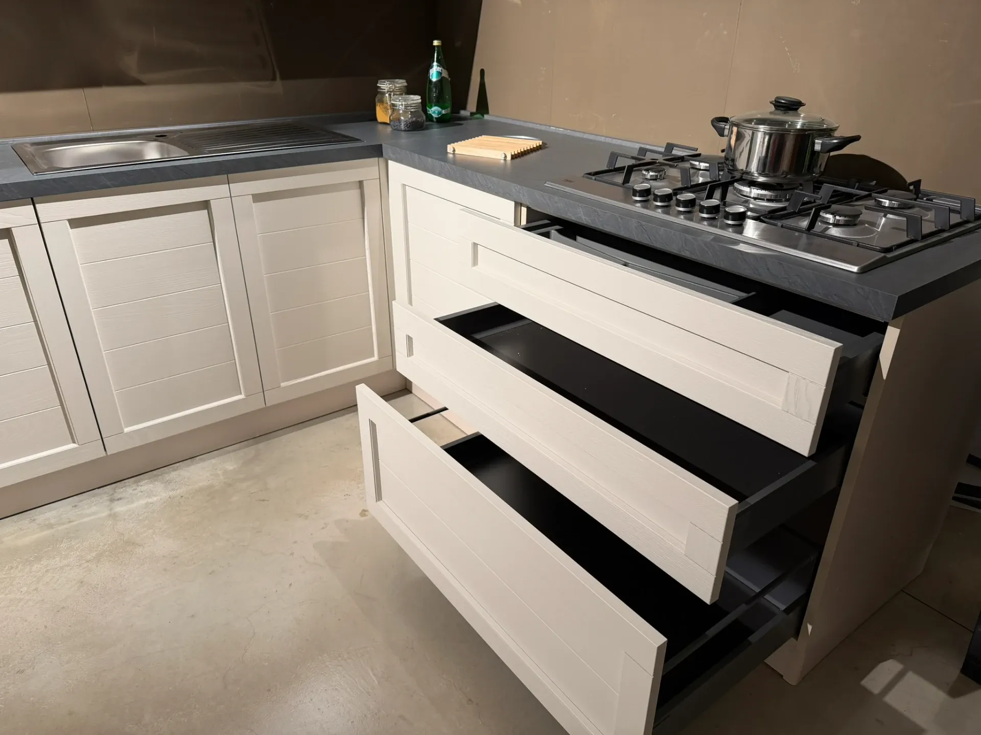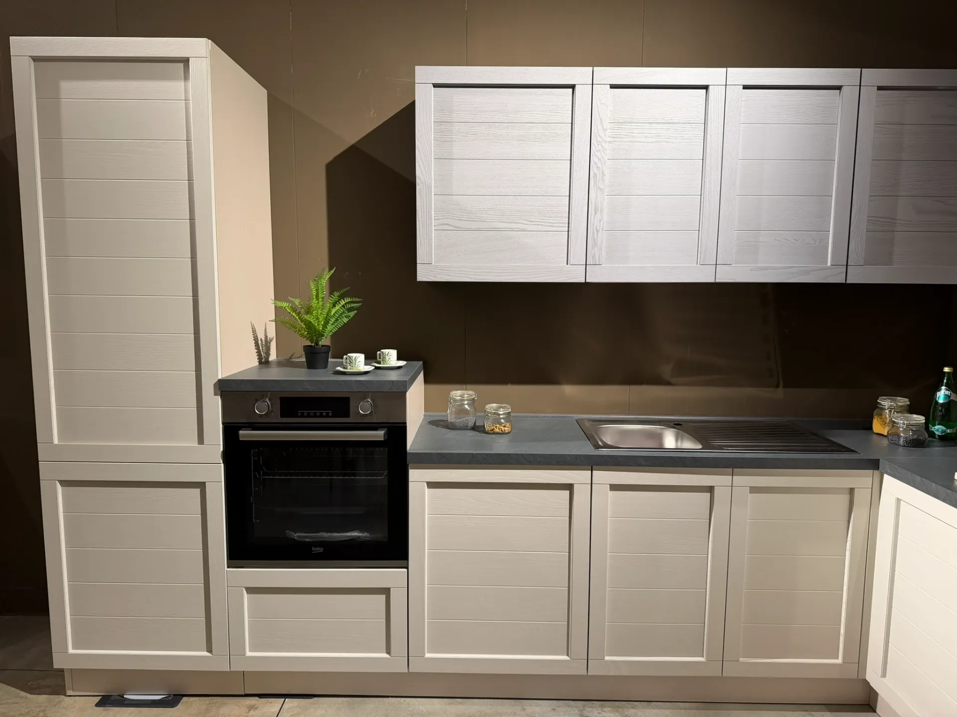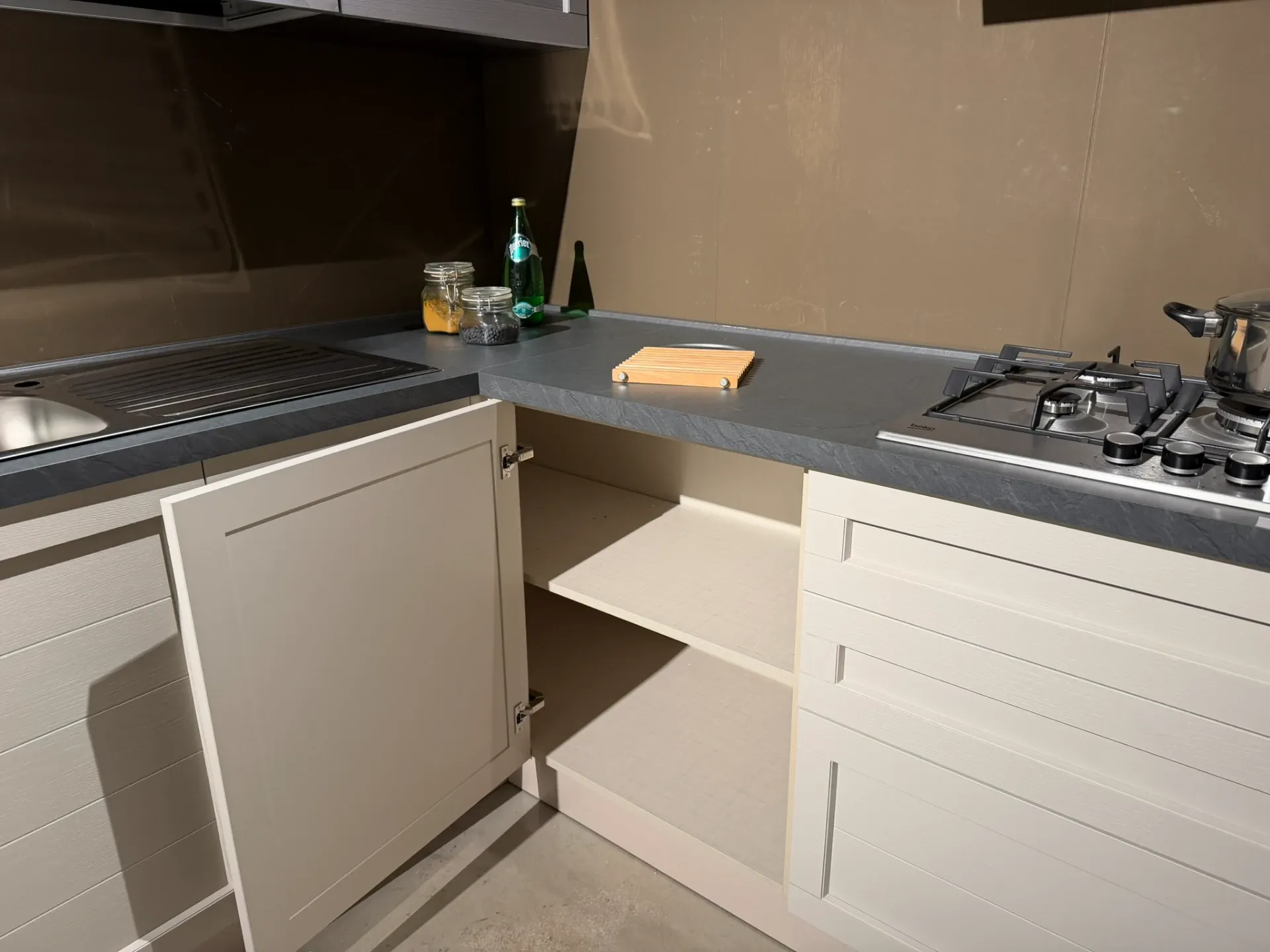 Le ante in legno massello di frassino non solo garantiscono una robustezza senza pari, ma aggiungono anche un fascino naturale che si sposa perfettamente con qualsiasi stile d'arredo. Il top in laminato da 4 cm, oltre a essere resistente e facile da pulire, offre una superficie ampia e versatile per tutte le attività culinarie.