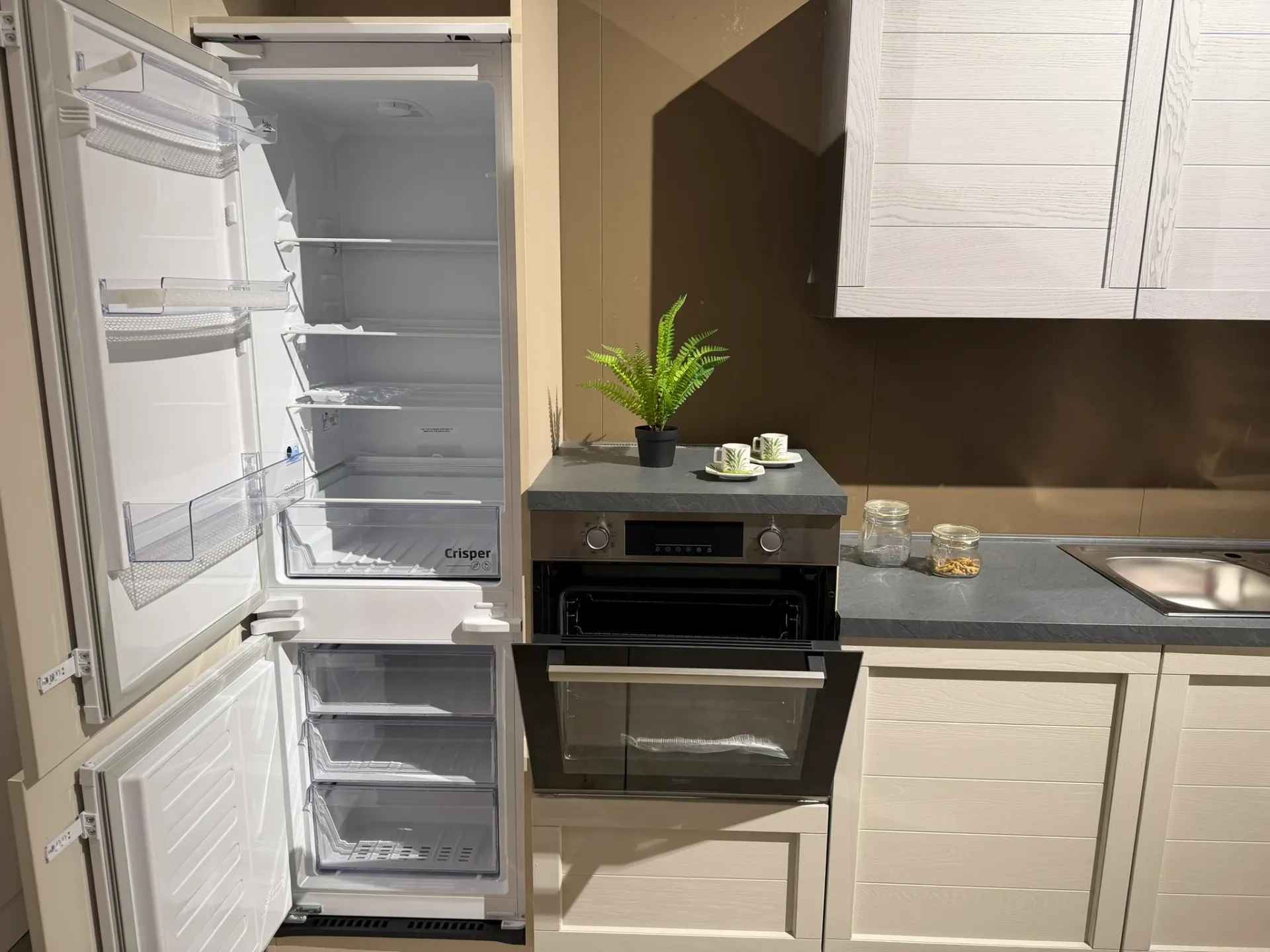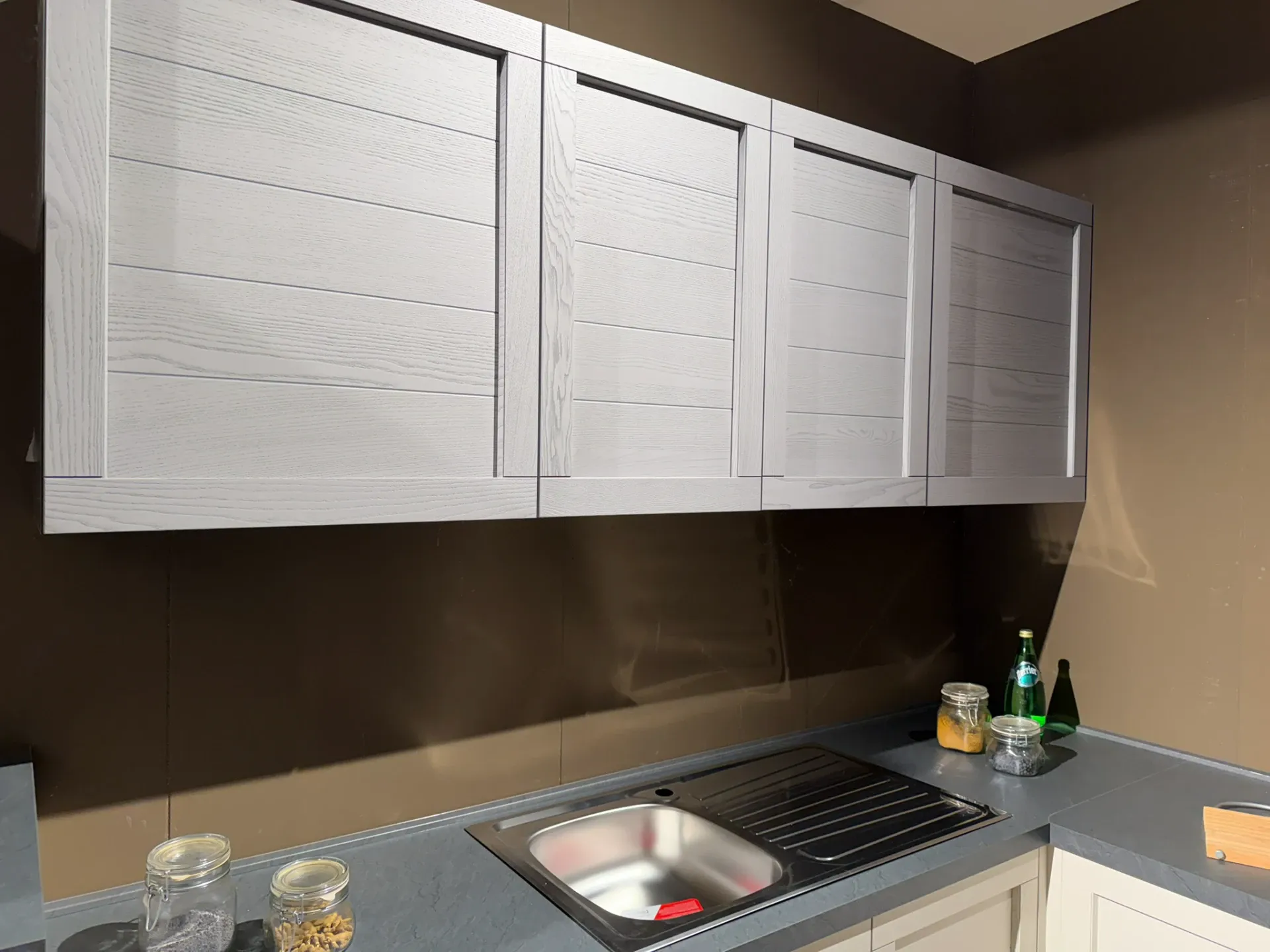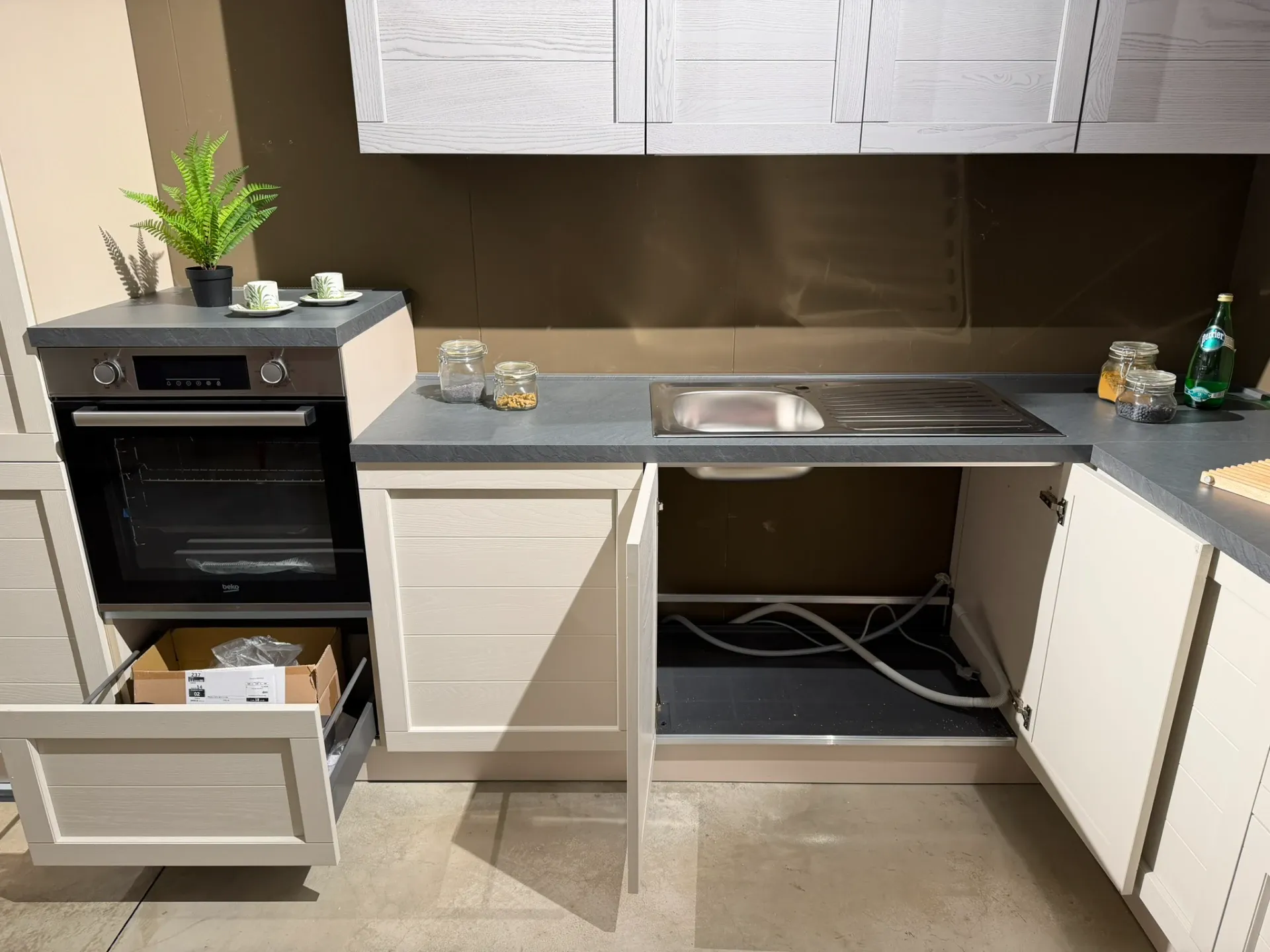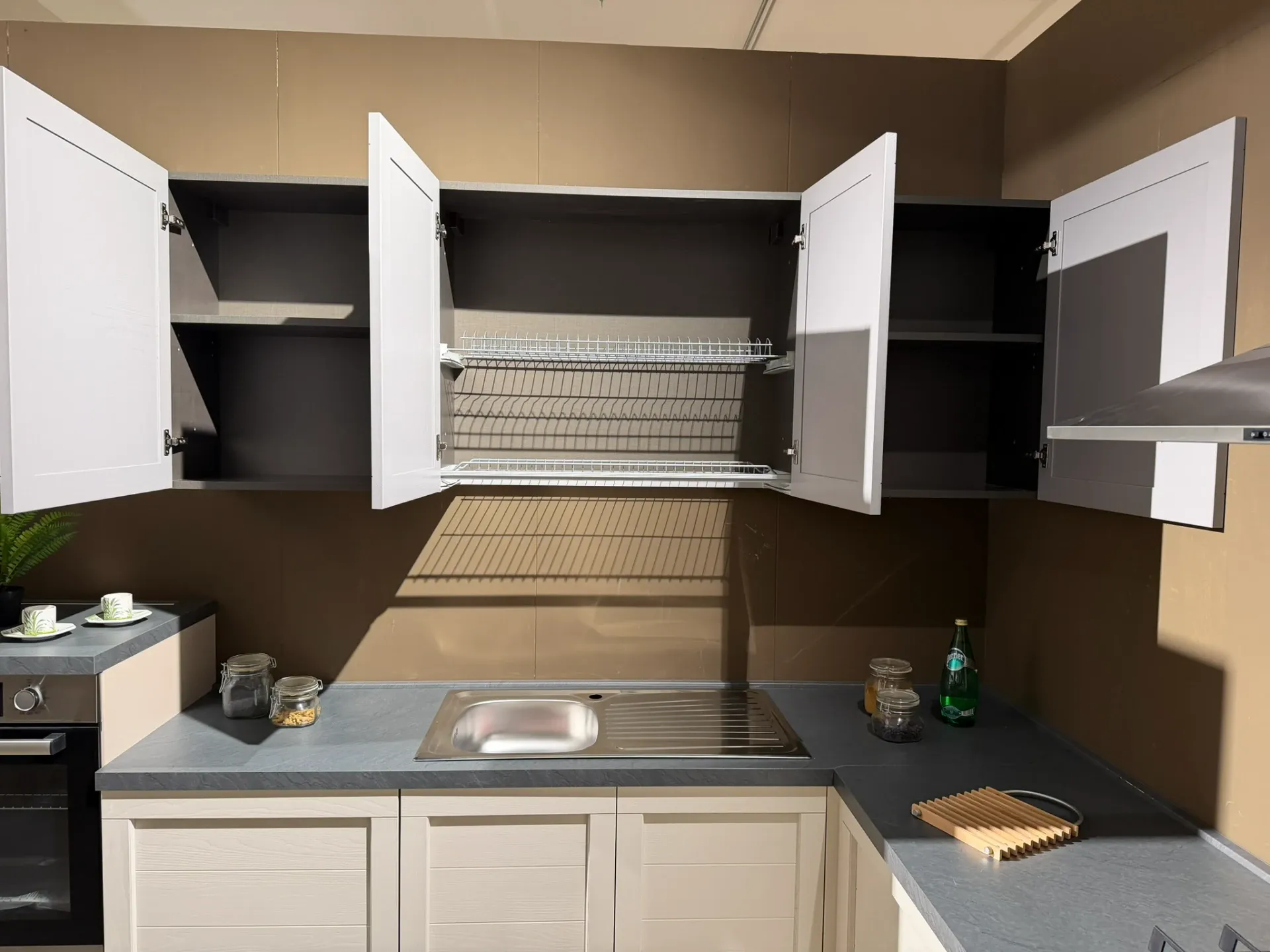 Le ante in legno massello di frassino non solo garantiscono una robustezza senza pari, ma aggiungono anche un fascino naturale che si sposa perfettamente con qualsiasi stile d'arredo. Il top in laminato da 4 cm, oltre a essere resistente e facile da pulire, offre una superficie ampia e versatile per tutte le attività culinarie.