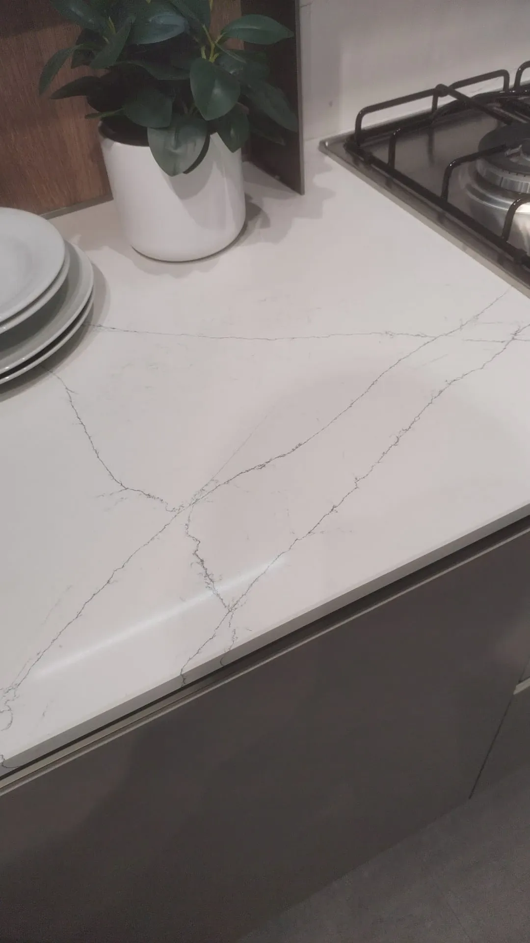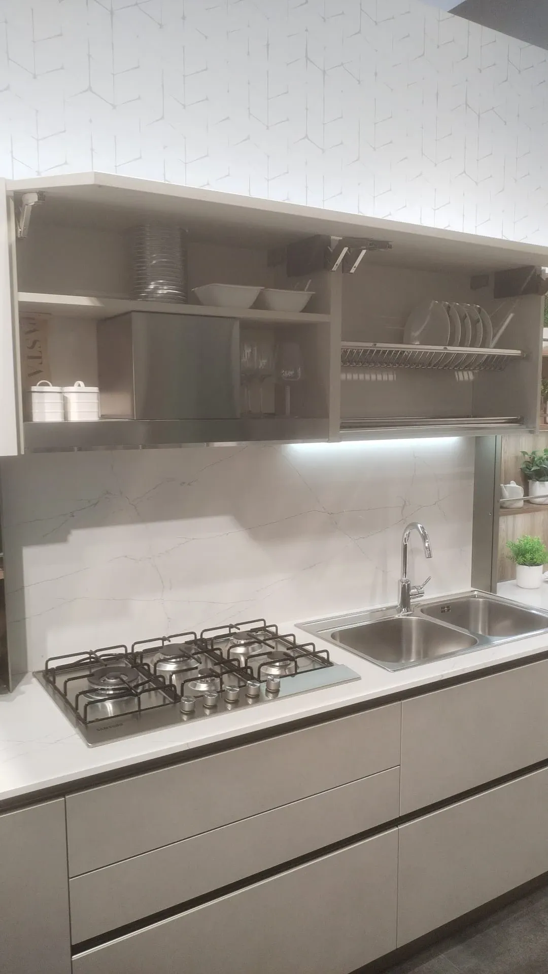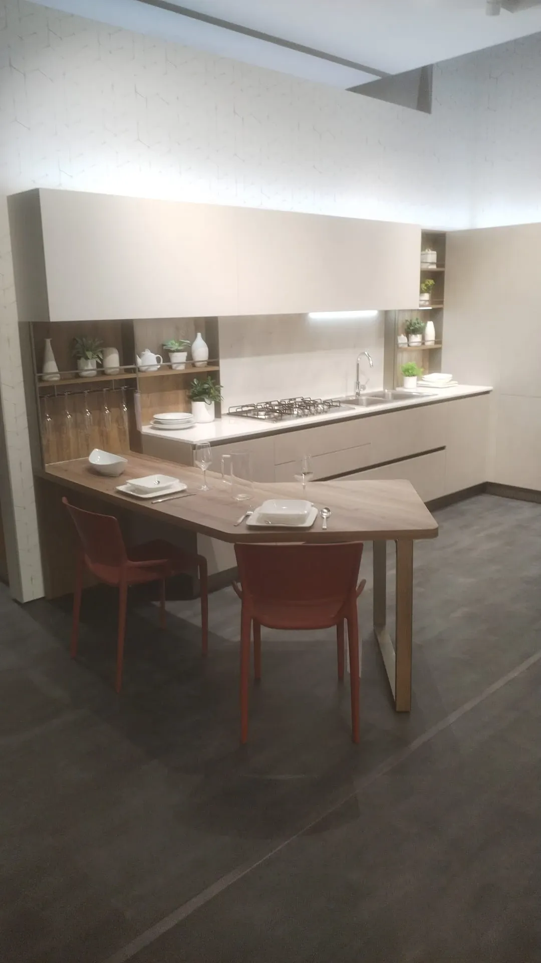 • In questa soluzione è imprescindibile un top cucina che si rispetti: è incluso nell'offerta Outlet un piano operativo in quarzo, perfetto per unire doti di praticità e design, resistendo nel tempo anche dal punto di vista estetico.