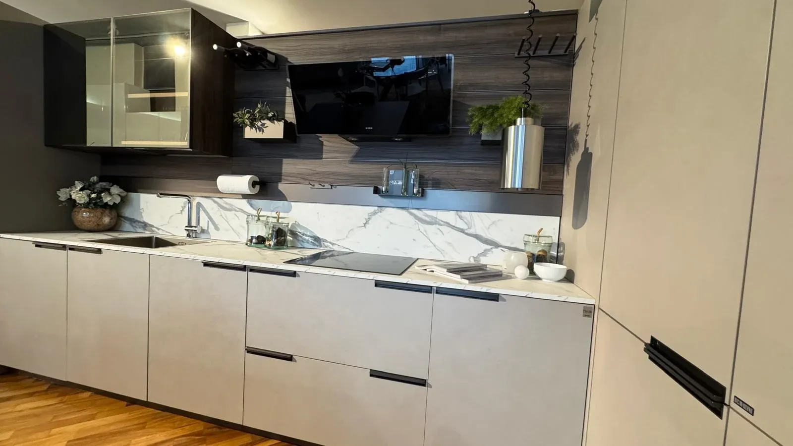 Scavolini ha scelto di realizzare in laminato materico la cucina Mia ora in offerta, materiale durevole negli anni ma anche bello e raffinato.