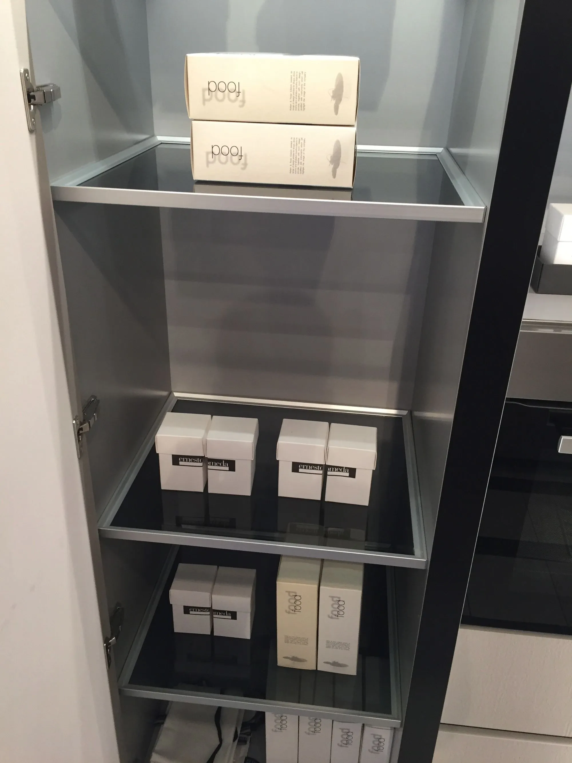Colonna dispensa con ripieni in vetro e illuminazione interna;