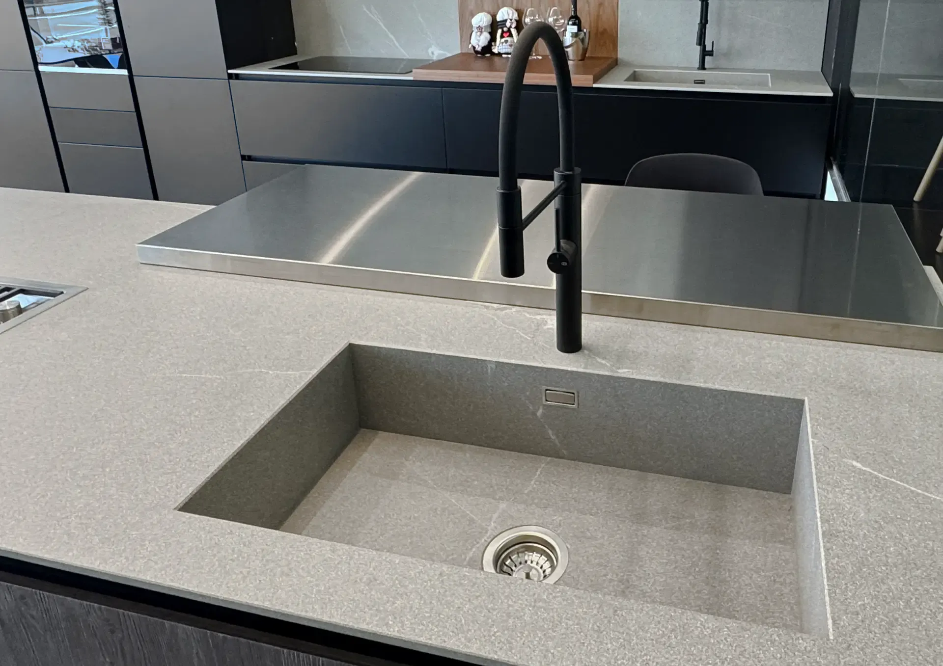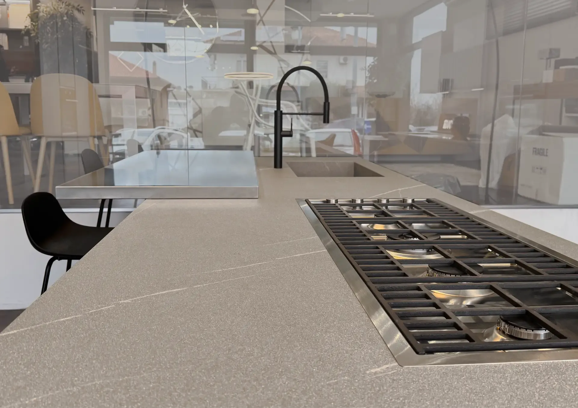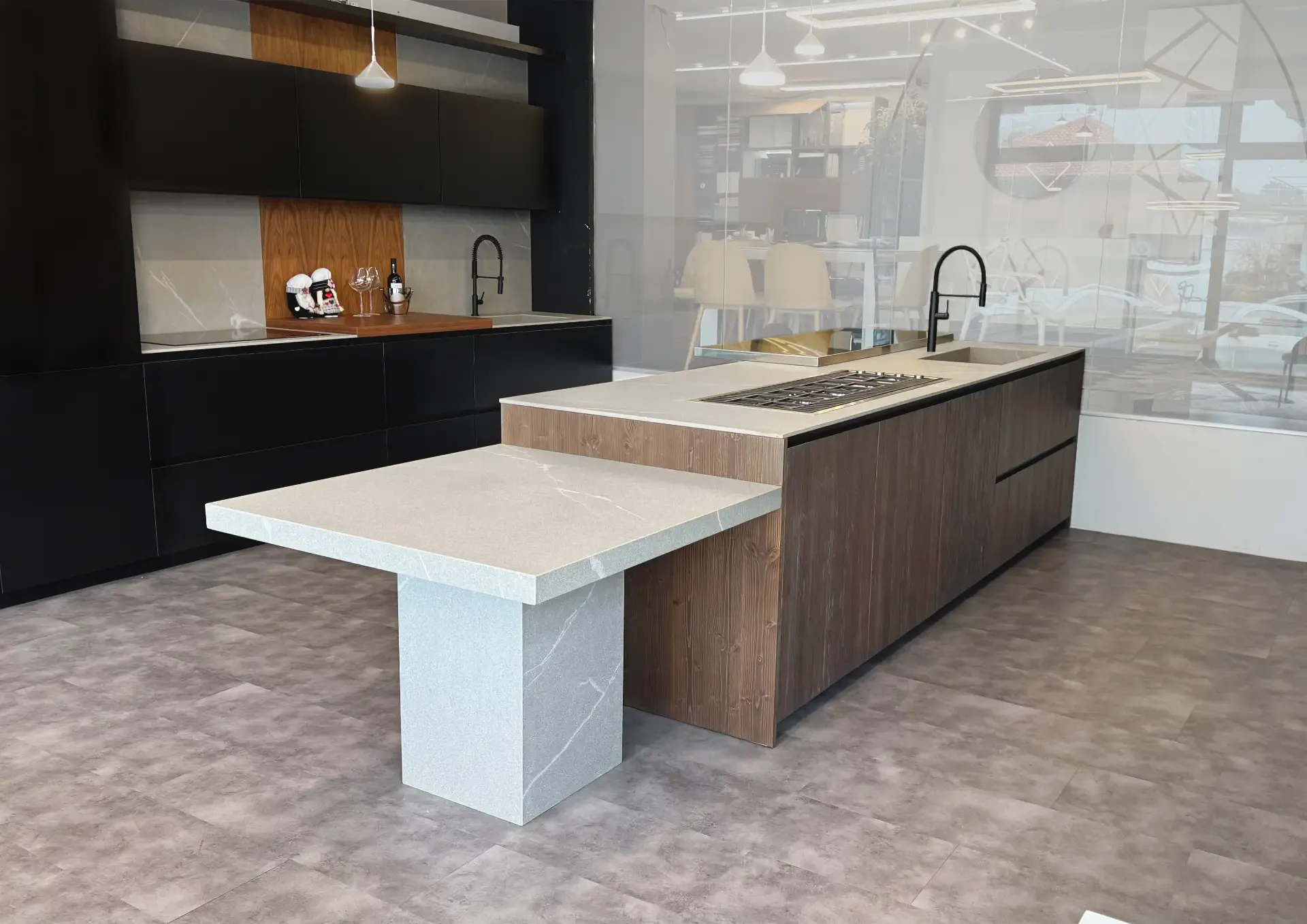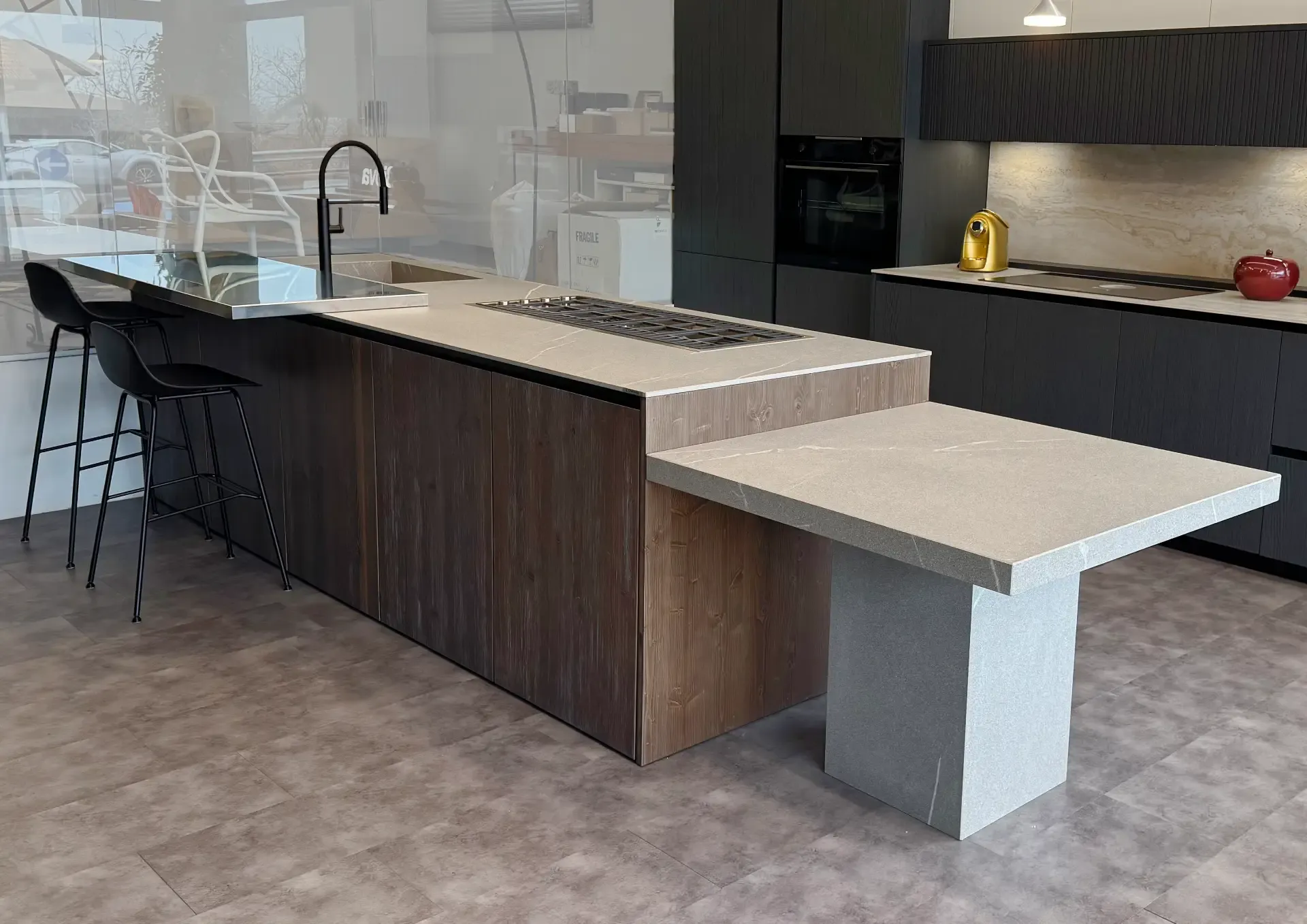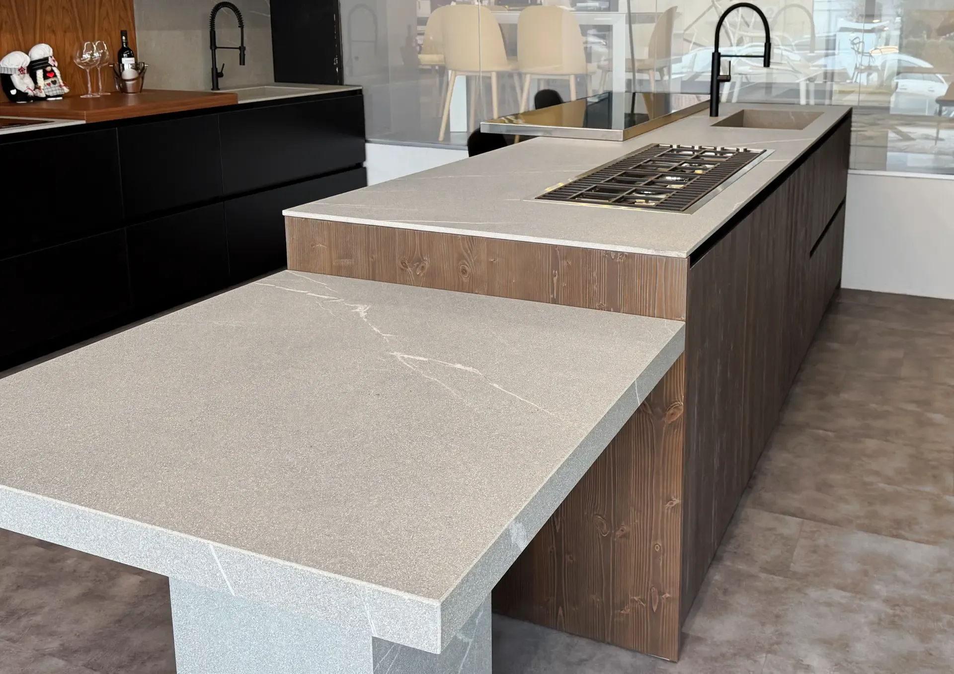 La cucina a isola artigianale, Atelier Wood Abete Tri-strato, si presenta come un blocco operativo multifunzionale che integra perfettamente le zone lavaggio e cottura. Oltre ad essere funzionale e pratica, la cucina è caratterizzata da una continuità visiva tra la zona di preparazione e quella conviviale, grazie alla presenza di un elegante piano snack in acciaio.
