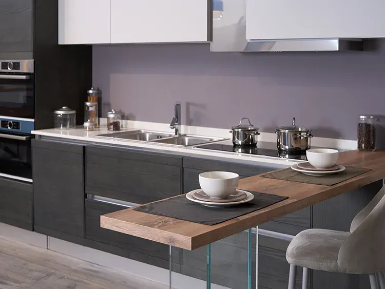 Piano penisola in laminato finitura rovere invecchiato e gambone in vetro