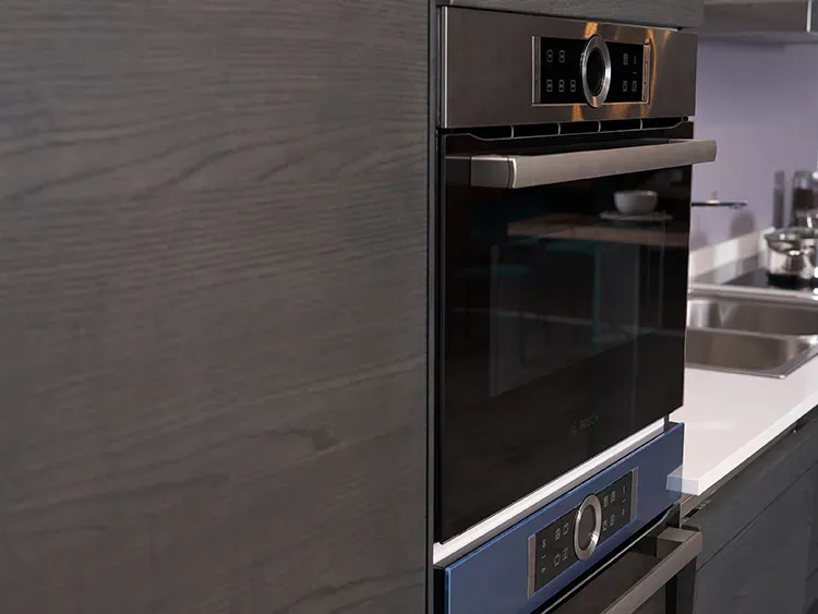 Finitura basi e colonne: impiallacciato rovere vulcano e pensili col. ghiaccio finitura soft.