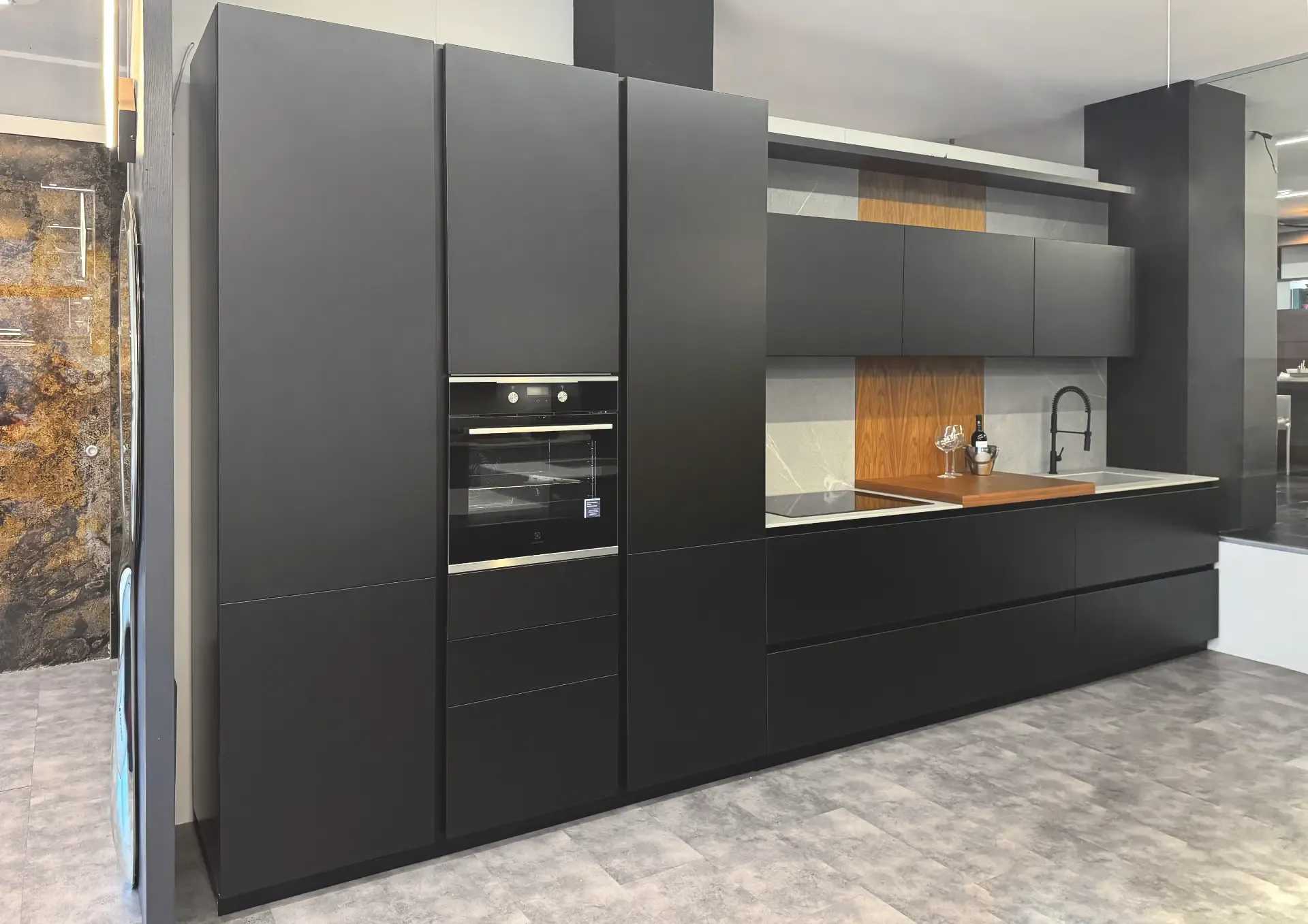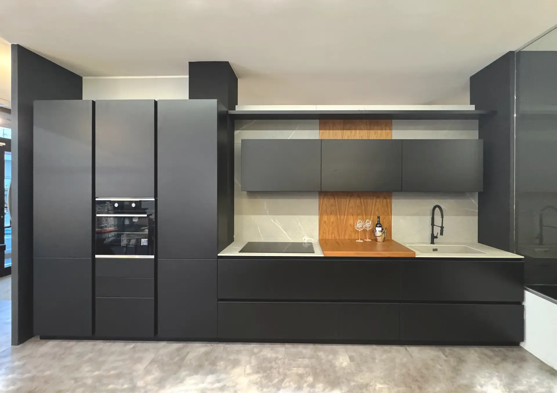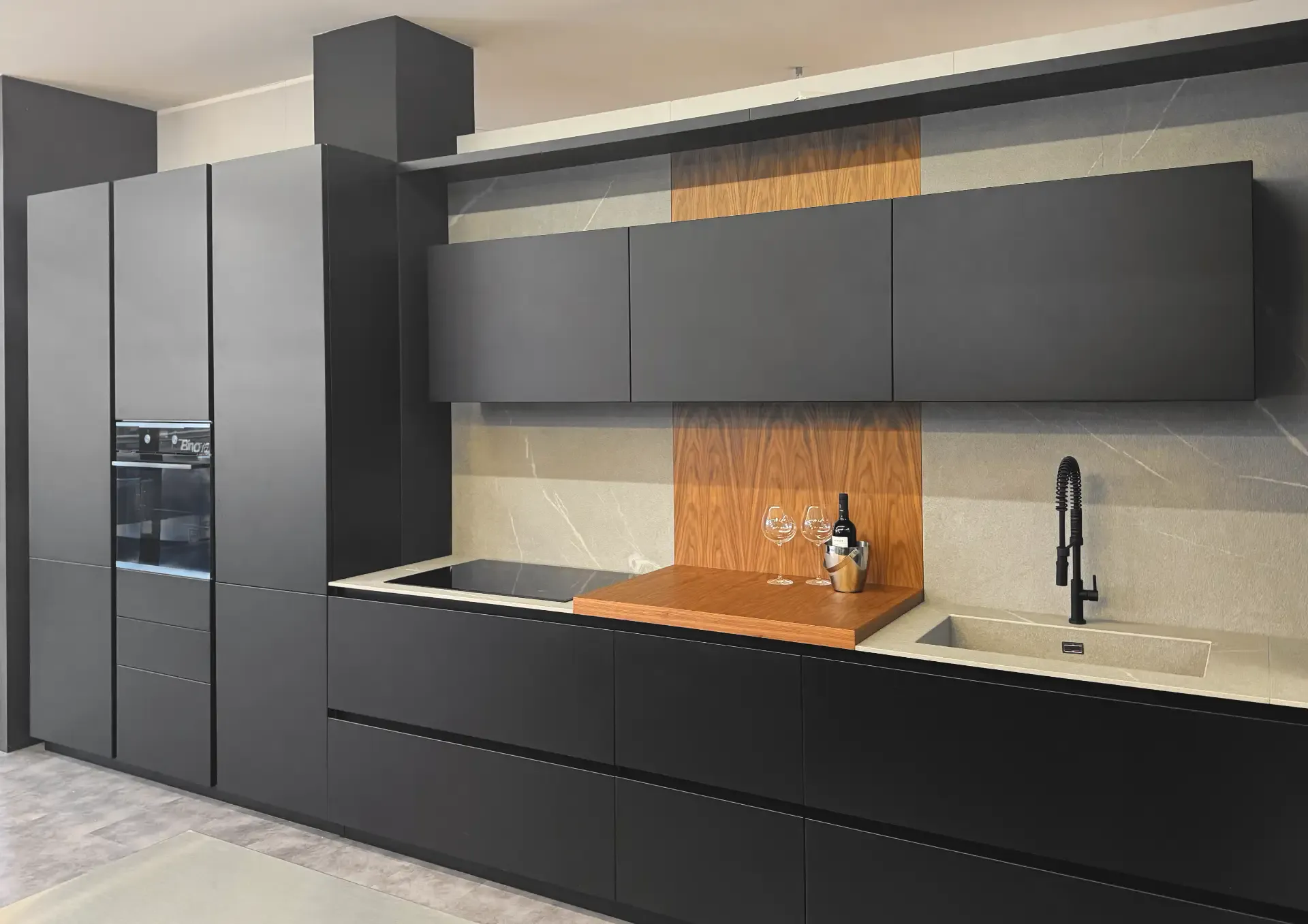 Cucina bluna black si presta a locali di molteplici conformazioni mixando funzionalità e stile, difatti questa soluzione Binova ora in Offerta Outlet è lineari.