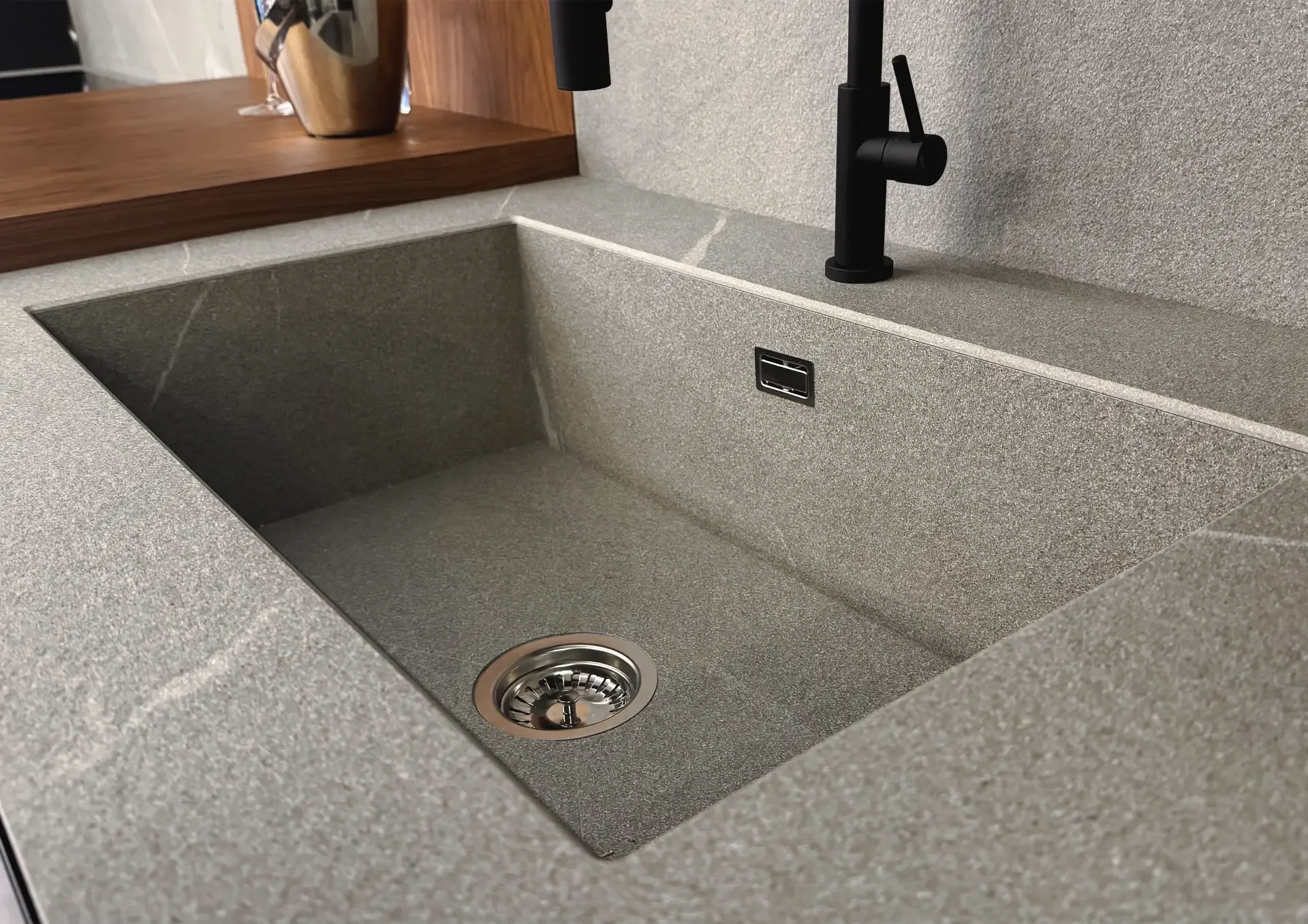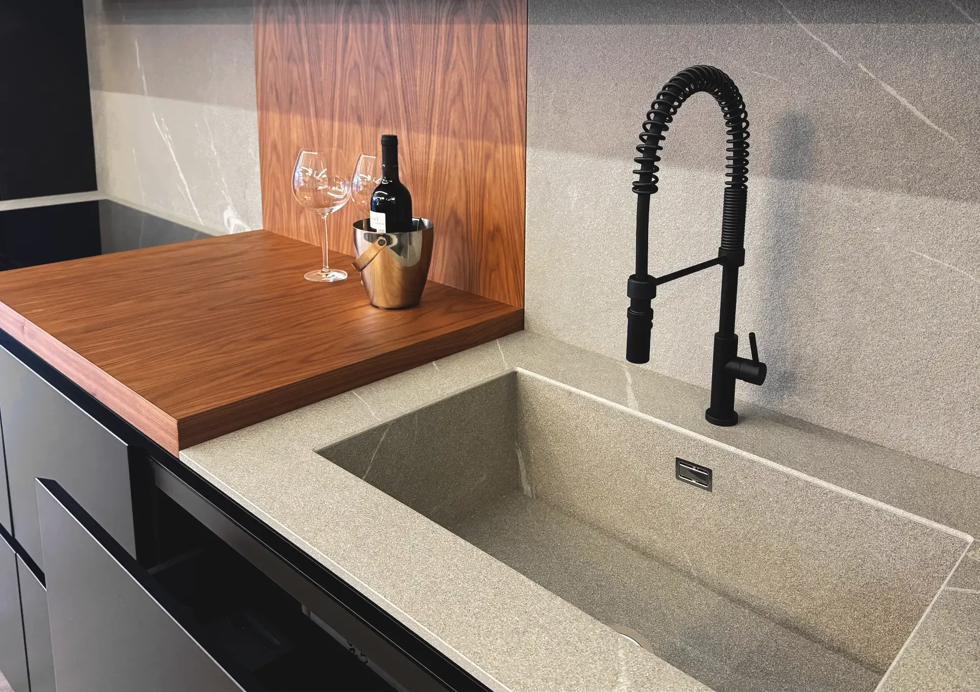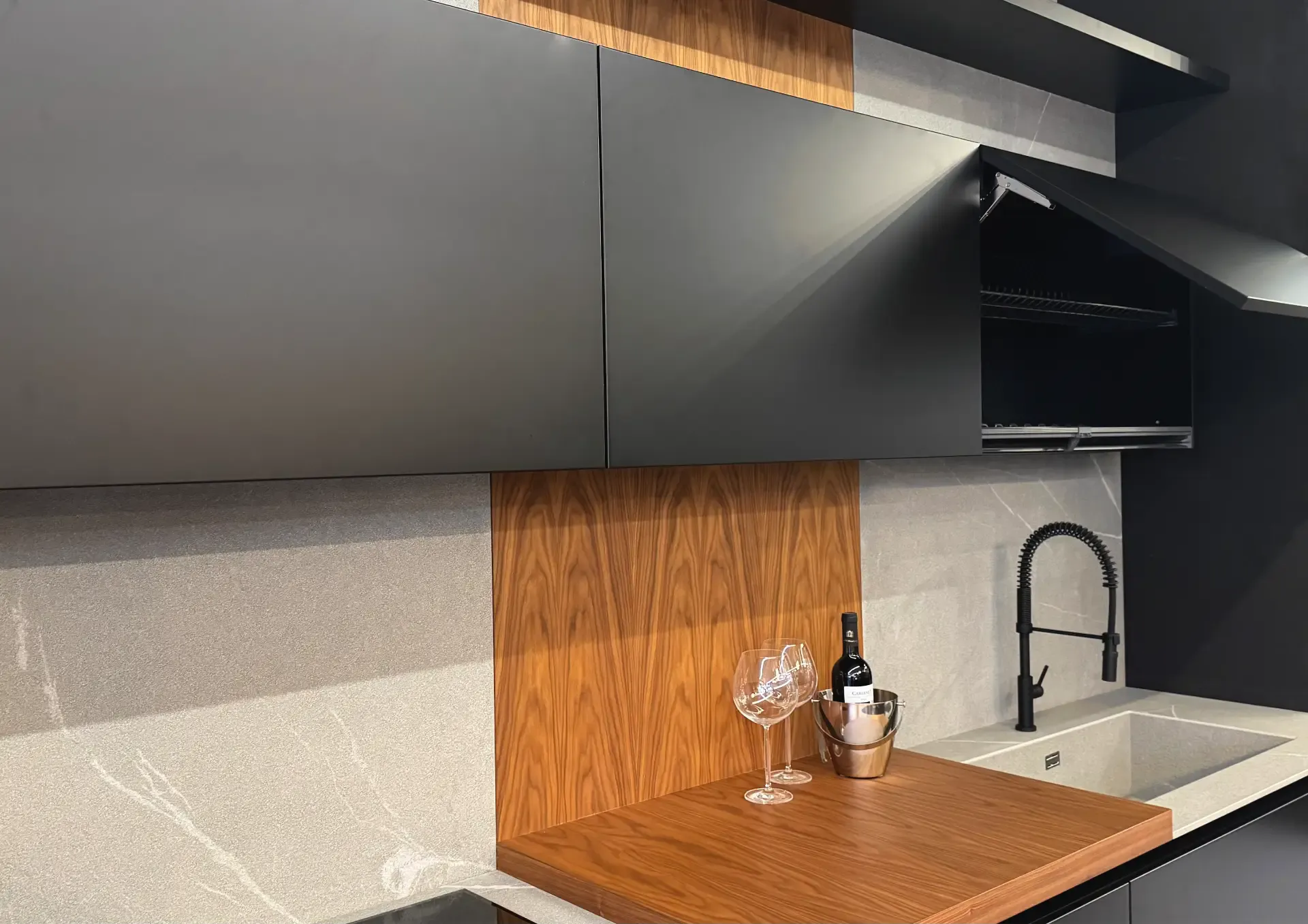 La cucina Bluna Black è un modello di eleganza moderna e design contemporaneo, caratterizzata da un'area operativa pratica e funzionale.