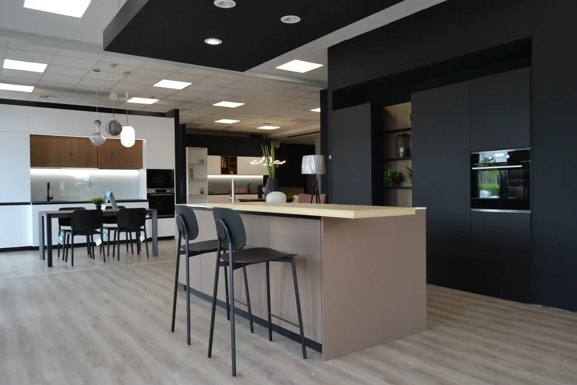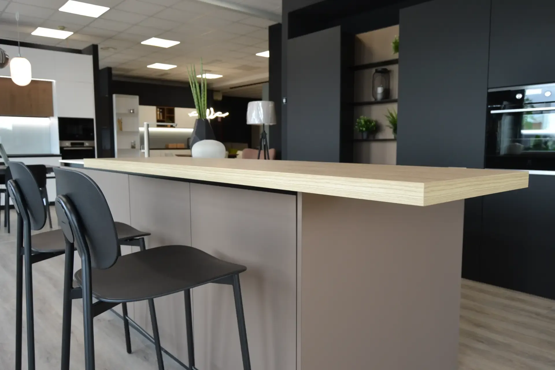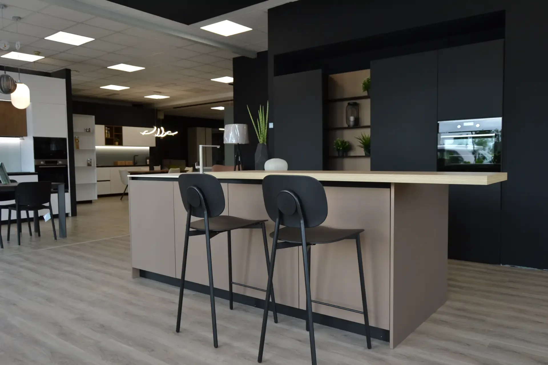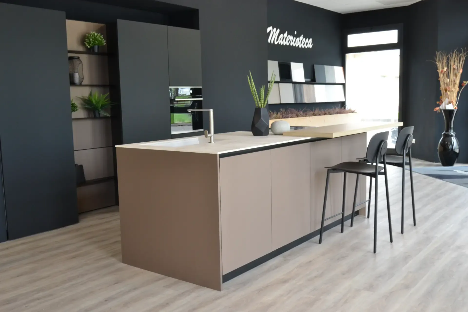 Cucina kalì nera con isola.