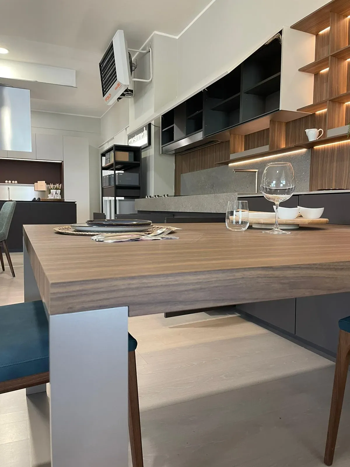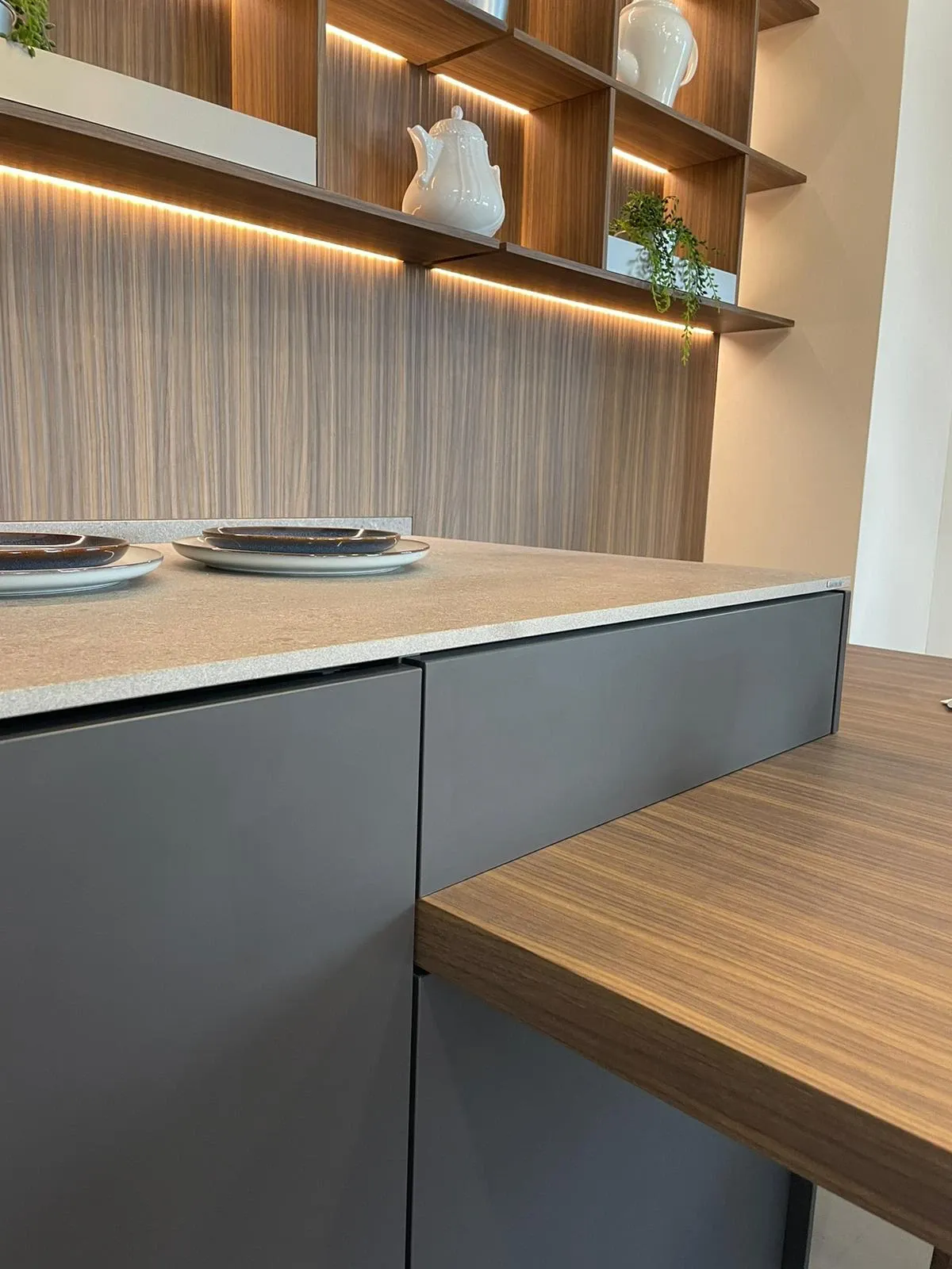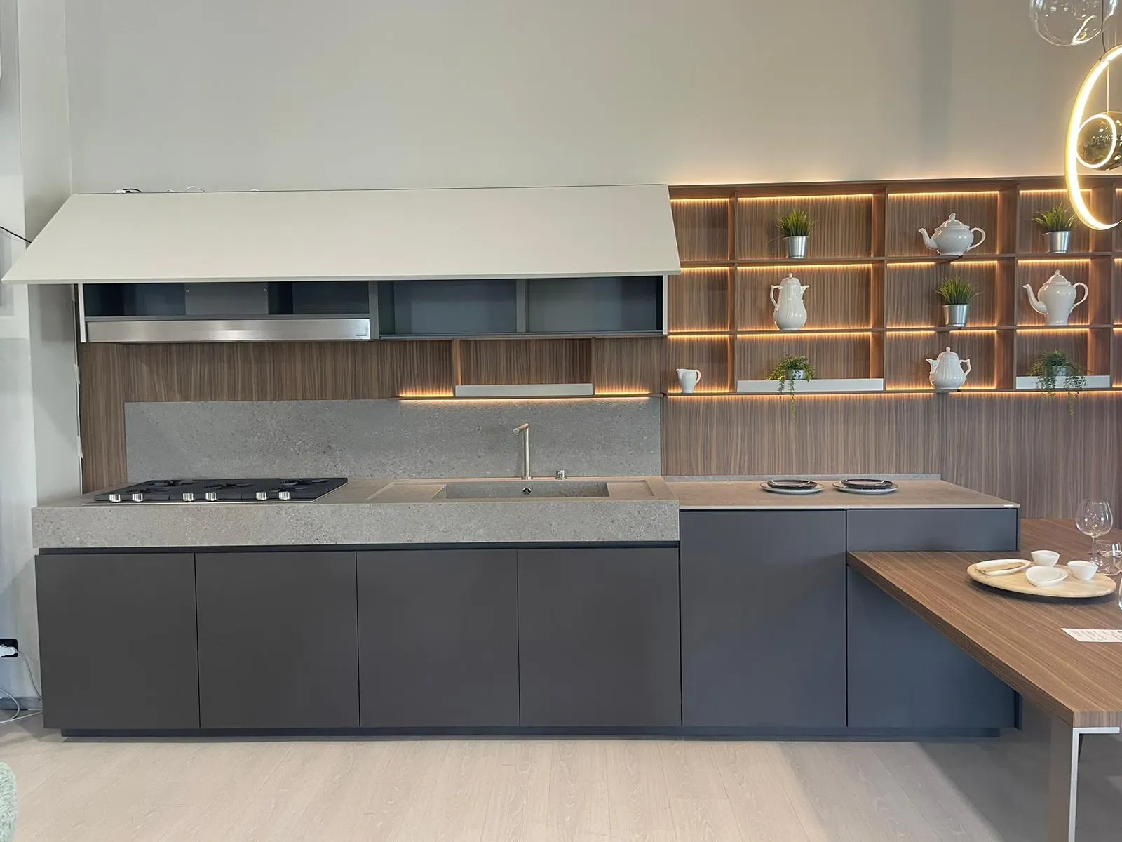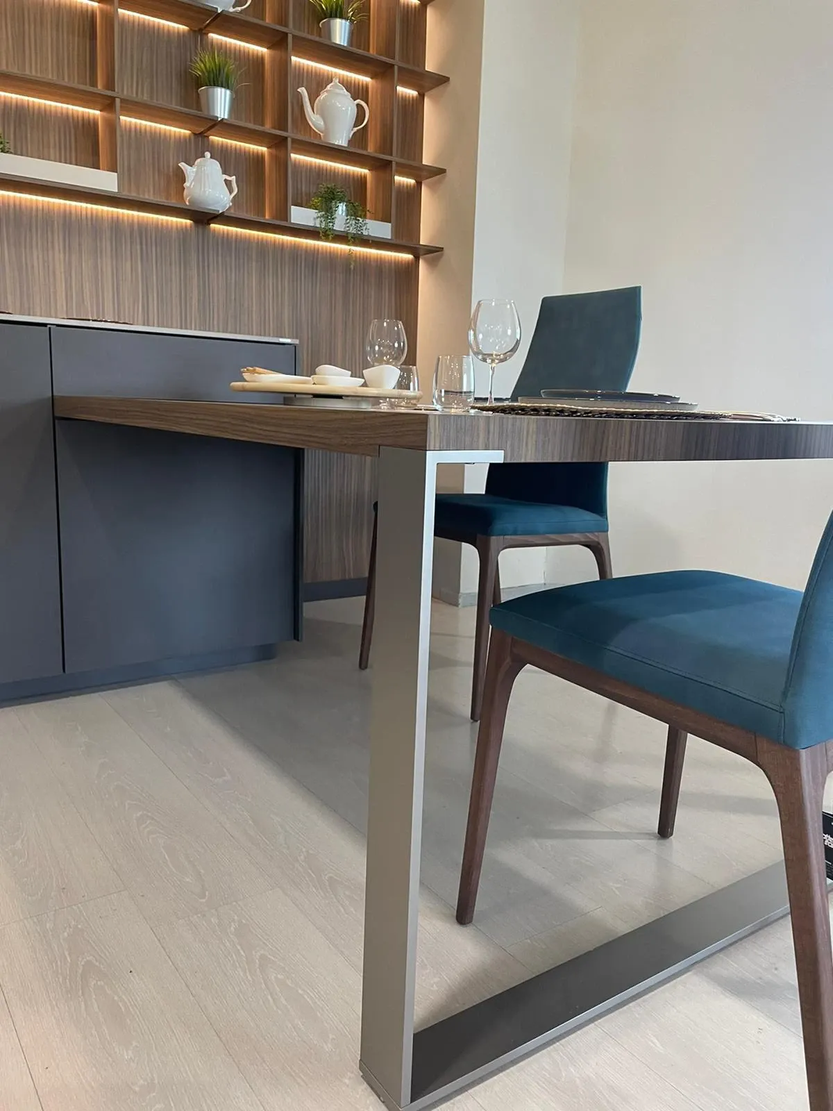 Cucina lineare con penisola, linea pulita caratterizzata da una grande attenzione per i materiali, in un mix di cromatismi che creano ambienti molto eleganti e dal forte impatto emotivo.