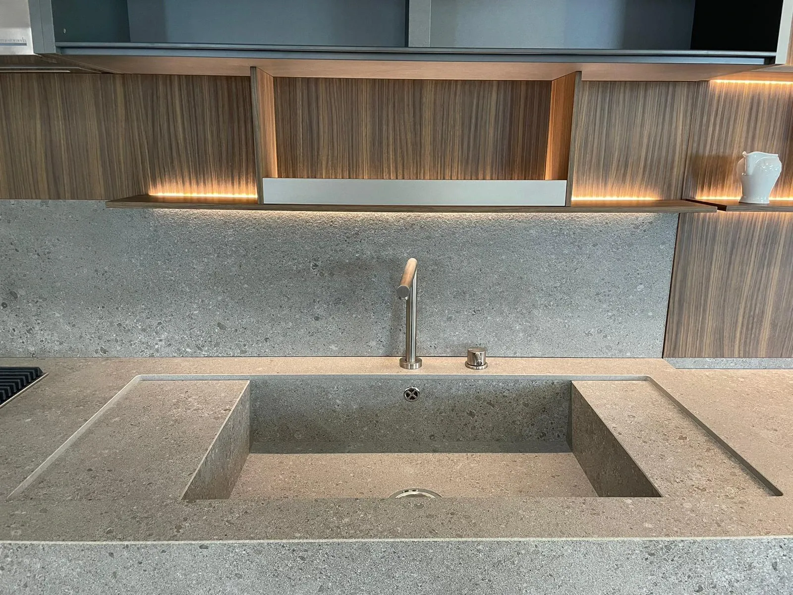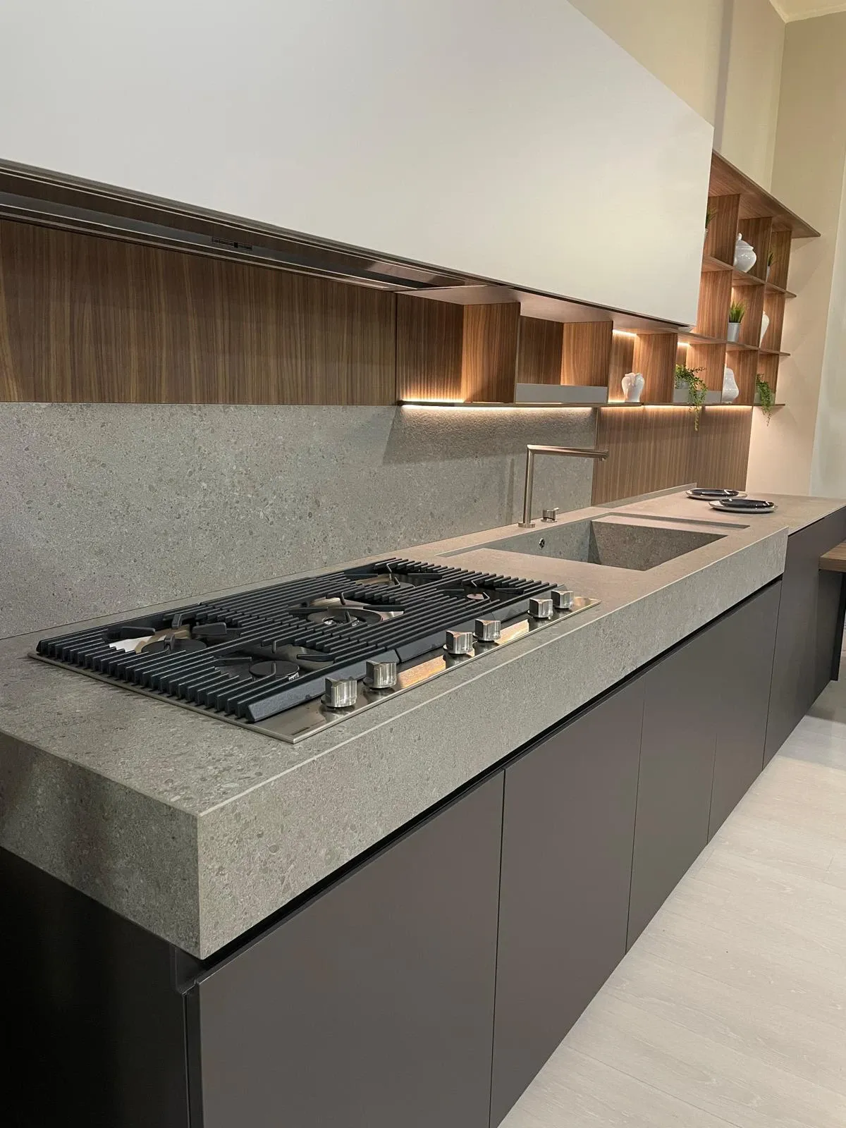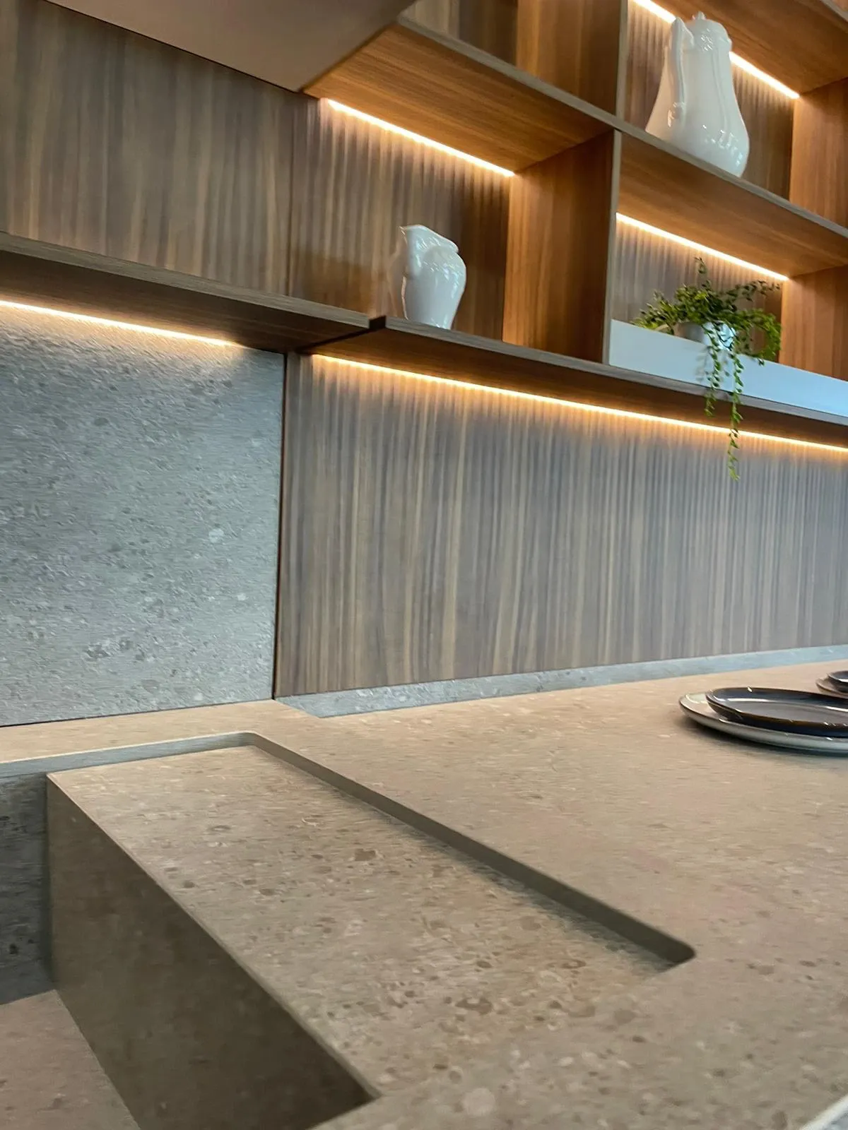 Cucina lineare con penisola, linea pulita caratterizzata da una grande attenzione per i materiali, in un mix di cromatismi che creano ambienti molto eleganti e dal forte impatto emotivo.
