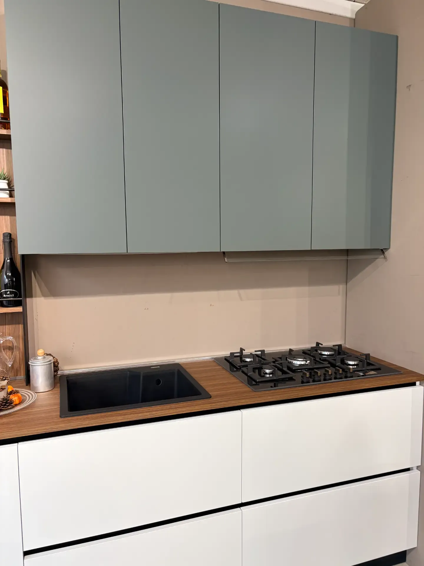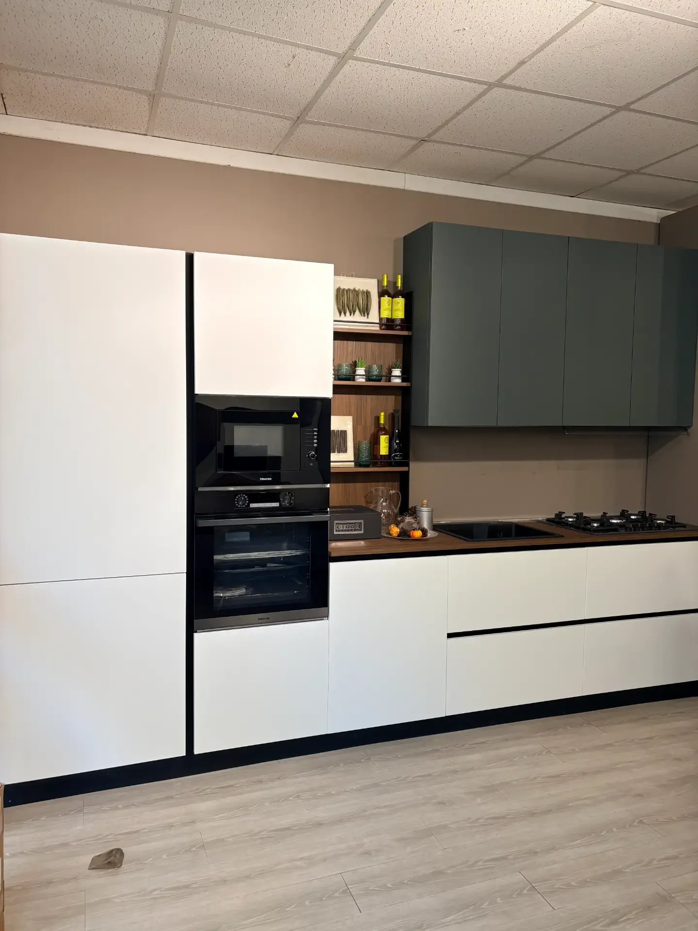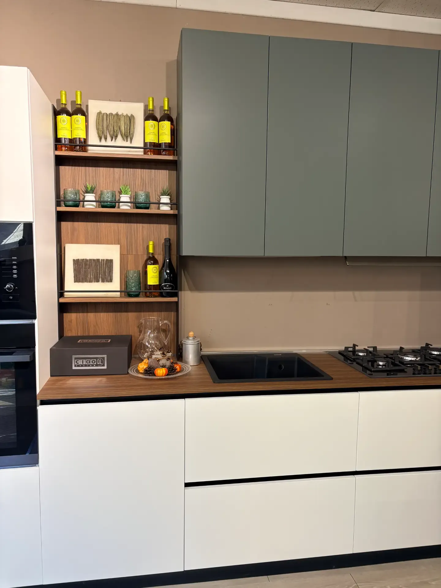 Cucina Ciao Cucine QL del marchio Aran World modello Ginevra in Pet , in finitura Bianco colonne e basi , in finitura Verde i pensili , zoccolo e gole nere , top sp2 cm laminato noce caracalla .
