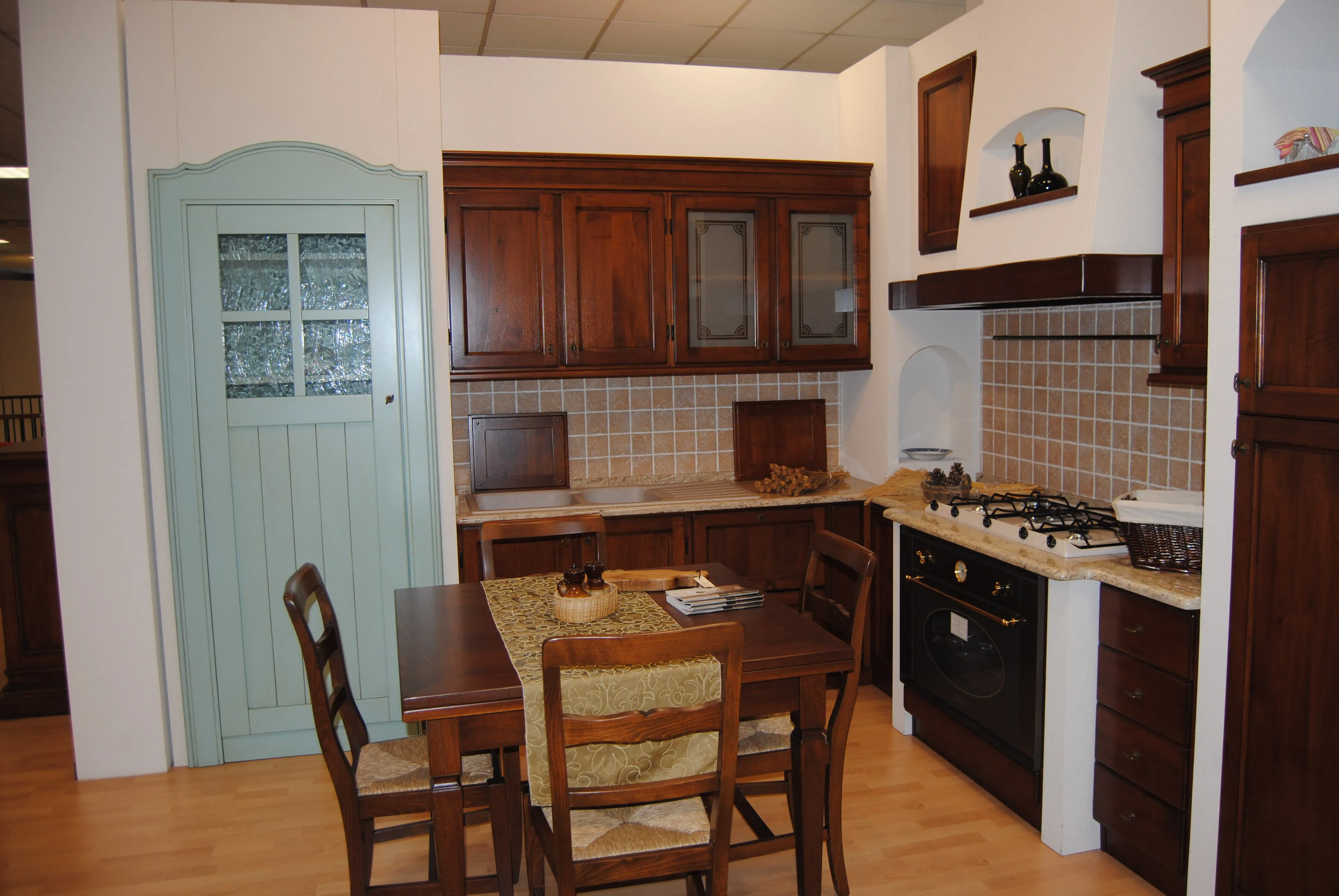 Presso la nostra esposizione potete trovare questa cucina in noce ad angolo 330,8x335,6. Un prodotto tutto legno per chi ama il calore dei materiali naturali. Uno stile di antica memoria riveste questa cucina artigianale estremamente curata in ogni singolo componente. La cerniera esterna é tipica del mobile bassanese. Gli ampi cestoni ci consentono di avere spazio per la miriade di oggetti che si accumulano in cucina nella vita di tutti i giorni. La particolare dispensa in finta muratura con portale in colore acquamarina patinato rende questa cucina ancor più spaziosa e originale La finta muratura può essere personalizzata nel colore per adattarlo agli ambienti della propria casa. Il top in granito Ivory Brown sp. 3 con finitura a 1/2 toro completa la cucina e le dona un aspetto ancor più prezioso . Il grande forno, il piano cottura largo 90 cm e il lavello in silgranit a 2 vasche con gocciolatoio la rendono particolarmente indicata per chi ama passare del tempo in cucina.