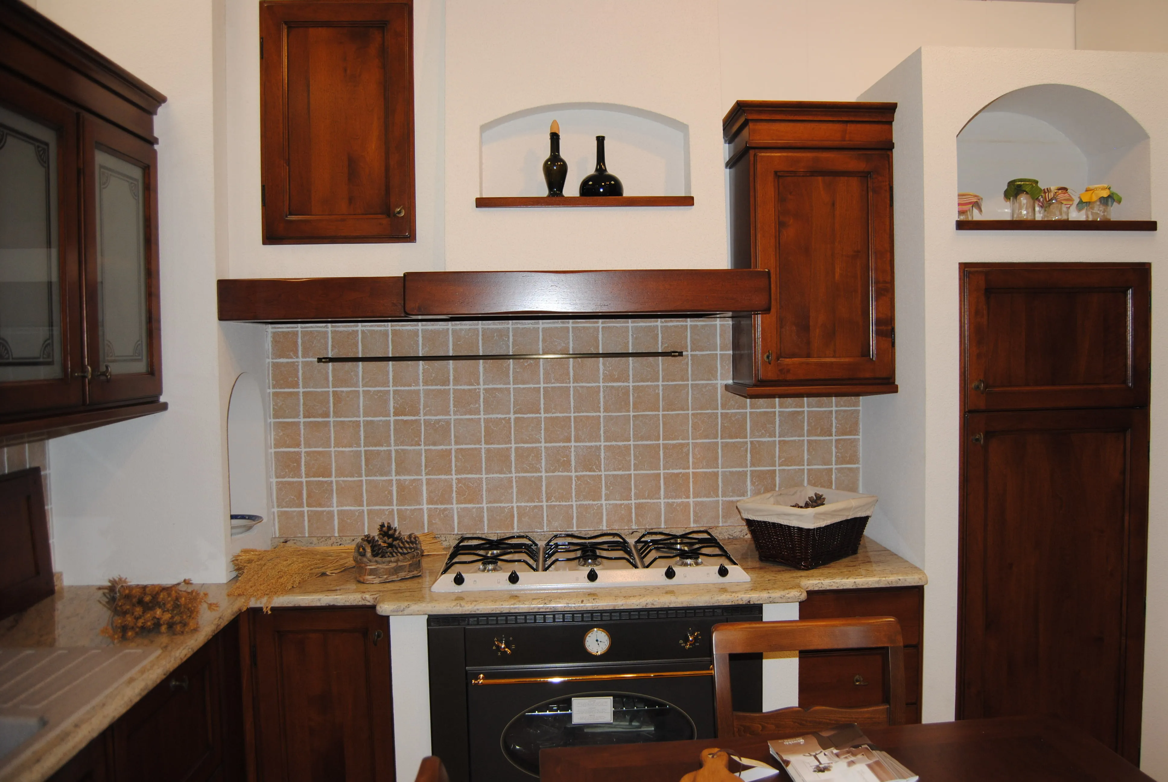 Puoi visitare l'esposizione di Ghirelli Arredamenti a Castellarano, dove potrai vedere dal vivo la cucina Arcadia in noce e ricevere consulenza personalizzata sulla personalizzazione della finta muratura.
