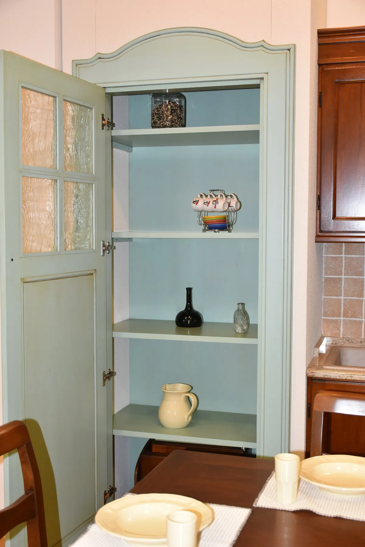 Sì, la dispensa in finta muratura con portale può essere personalizzata nel colore per adattarsi perfettamente all'ambiente della tua casa. Attualmente è disponibile in acquamarina patinato, ma sono possibili variazioni su richiesta.