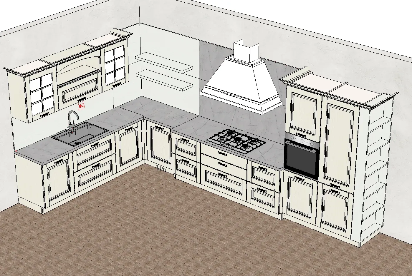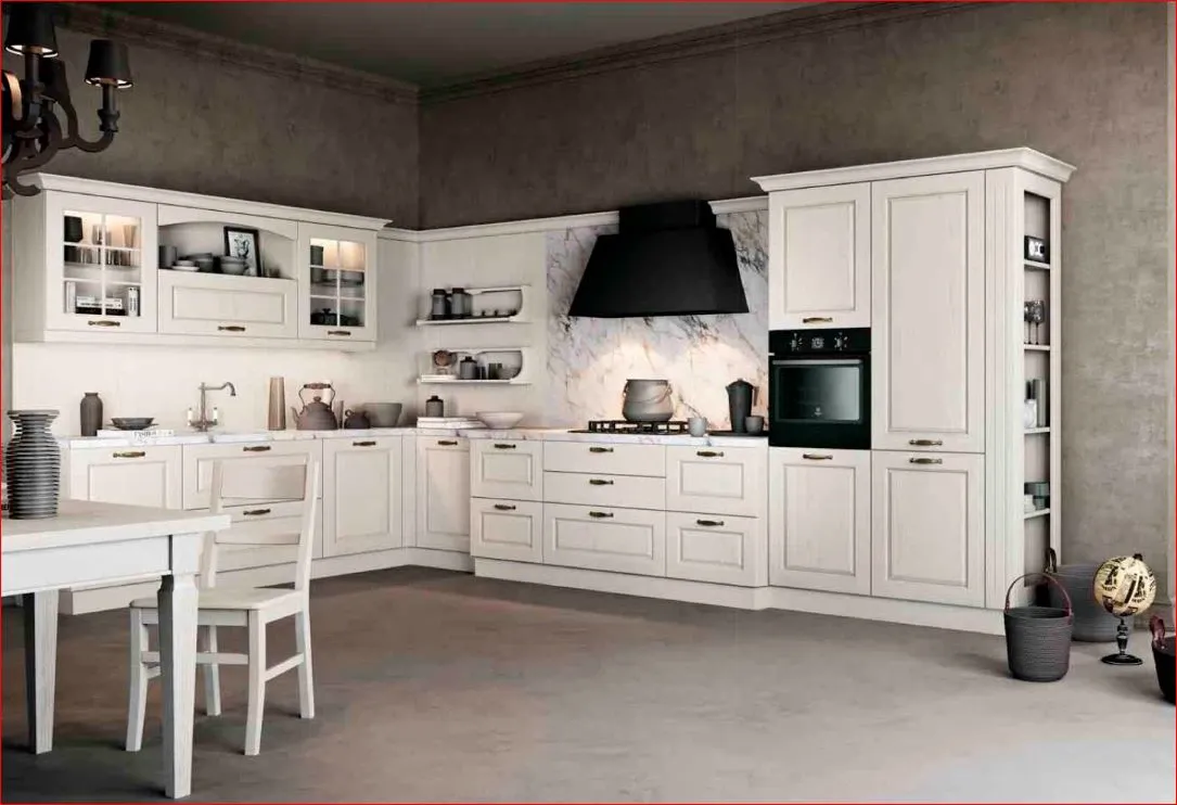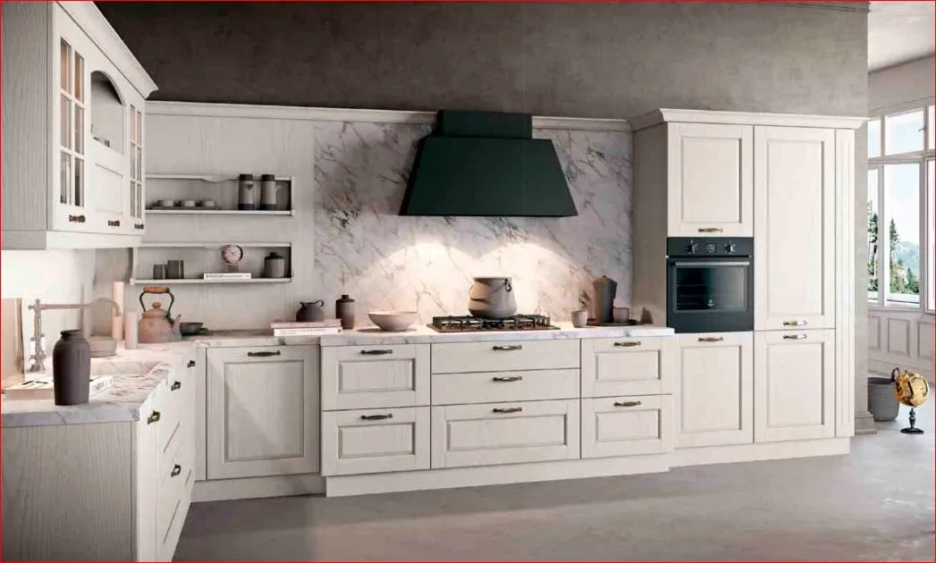 Cucina modello ASOLO 3 con ante in frassino Bianco Decapè e piano top in laminato sp.40 mm. in finitura grigio venato. Ricca di dettagli questa cucina si distingue per la grande zona cottura sovrastata dalla cappa da cm.120 e a lato la Boiseire sempre in legno con le 2 mensole. Boiserie che proseguono poi nel lato sinistro sia a fianco che sotto i pensili dove troviamo anche 2 pensili a vetro inglesina. Completa il tutto la colonna a giorno per spezzare il fianco liscio della colonna frigo. PIano top in profondità cm. 62 e nella zona cottura in profondità cm.70 per aver a disposizione più spazio per appoggiare ciò che serve durante le preparazioni. Proposta a Euro 9.700,00 compreso iva e trasporto.