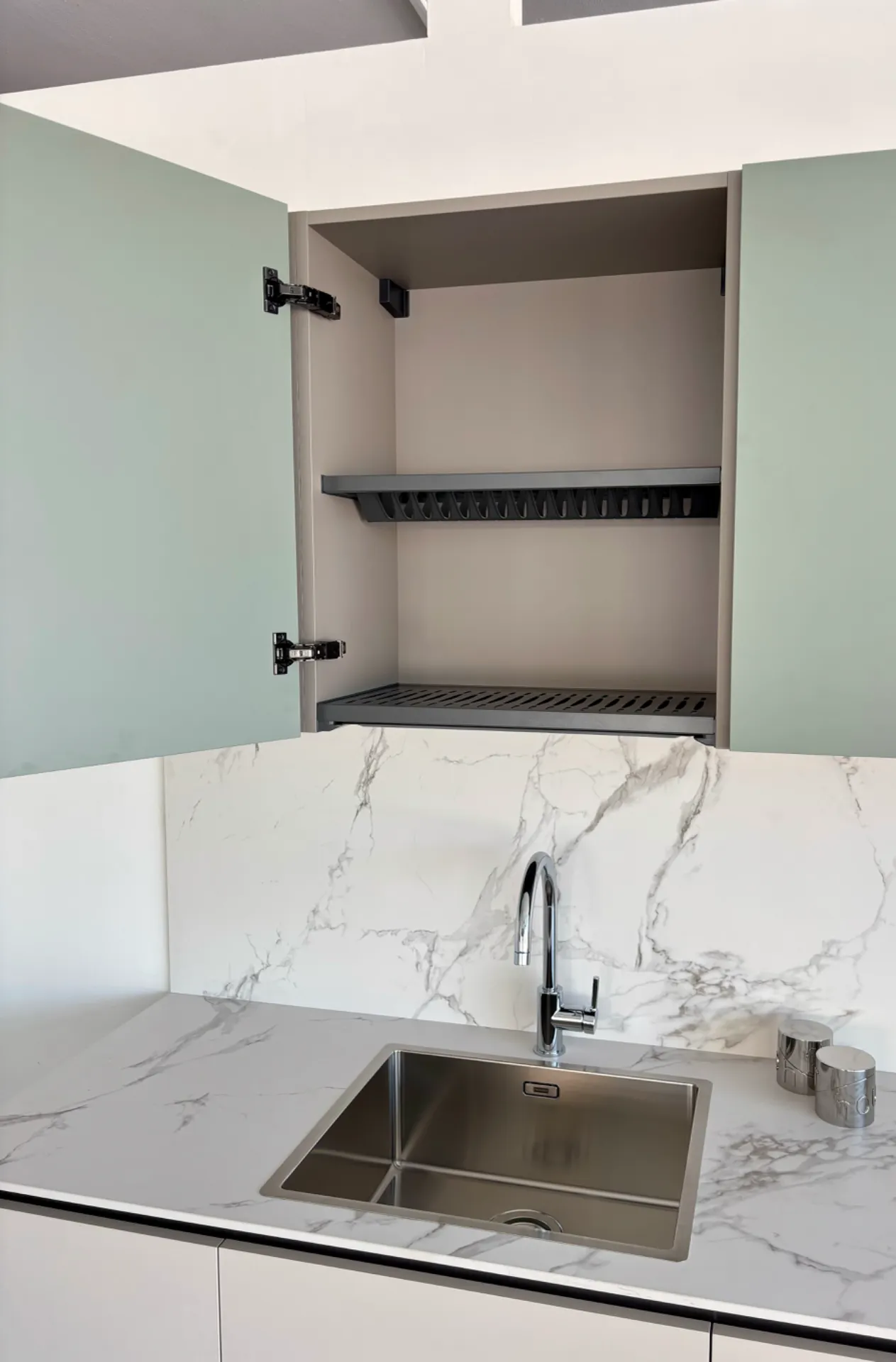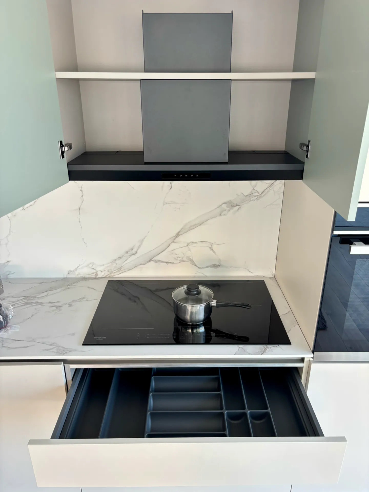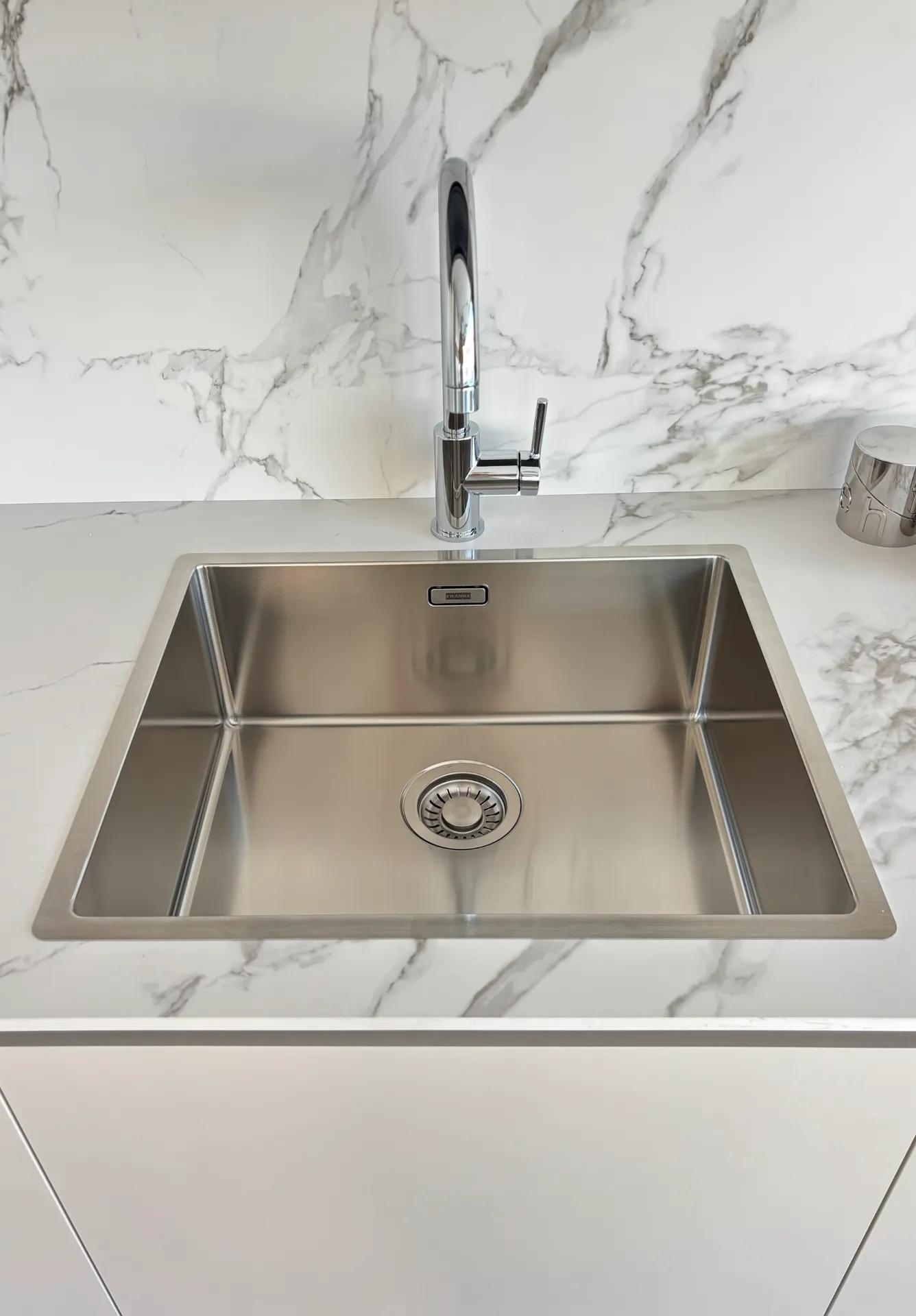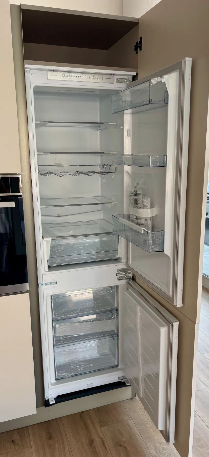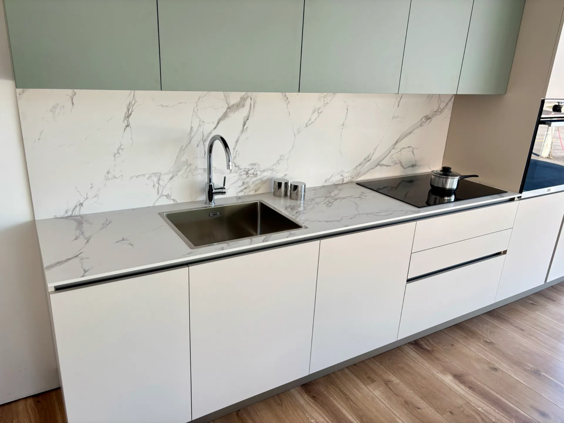 Completa di tutti gli elettrodomestici: Forno Franke multi funzione con porta rallentata finitura inox-nero. Lavastoviglie Franke 14 coperti 2 cestelli classe E, Frigorifero HiSense No Frost con cella sotto classe E, Piano cottura Induzione Hotpoint da 77 con zona Flexy, Lavello Franke mono vasca da 50 cm incasso a semi filo top, Miscelatore Franke Inox, Cappa Silverline incassata finitura nera opaca classe a con 600 metri cubi di aspirazione