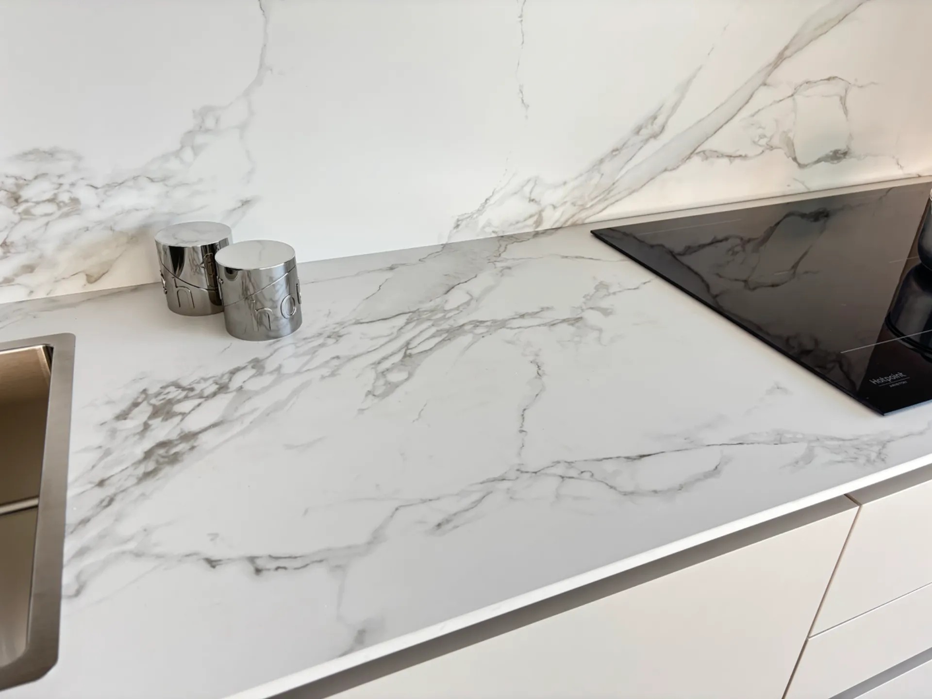 Top e schienale in gres Dekton Aura, colore bianco opaco con venature grigio chiaro.