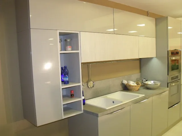 Cucina modello Duna di Arredo3, con basi e colonne in laminato lucido creta, con maniglia a profilo cromata lucido. Pensili con maniglia a gola in laminato rovere sabbia e lucido creta, con inserti a giorno in laminato rovere sabbia. Isola composta da 3 basi larghezza 60 cm altezza 72 cm, una base da 90 cm a cassetti H 60 cm, e tre basi da 45 cm H 60 cm. Top in laminato Portland spessore 4 cm, e top uso tavolo in rovere sabbia. Parete composta da; colonna frigorifero, colonna dispensa da 30 cm estraibile, colonna per forno più microonde, anta lavastoviglie e base lavello da 120 cm 2 ante. Completa la parete un gioco di pensili che si alternano tra colore, dimensioni ed elementi a giorno. Completa di elettrodomestici Electrolux; piano cottura 5 fuochi, lavastoviglie, forno + microonde, frigorifero. Lavello a 2 vasche e cappa isola quadrata Maxfire. Prezzo comprensivo dell'Iva. Trasporto e montaggio da computare a parte.