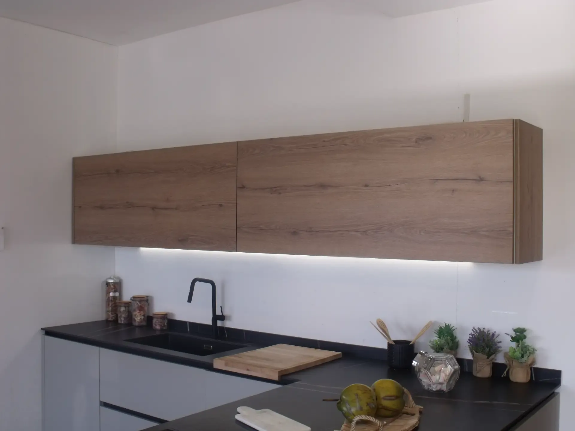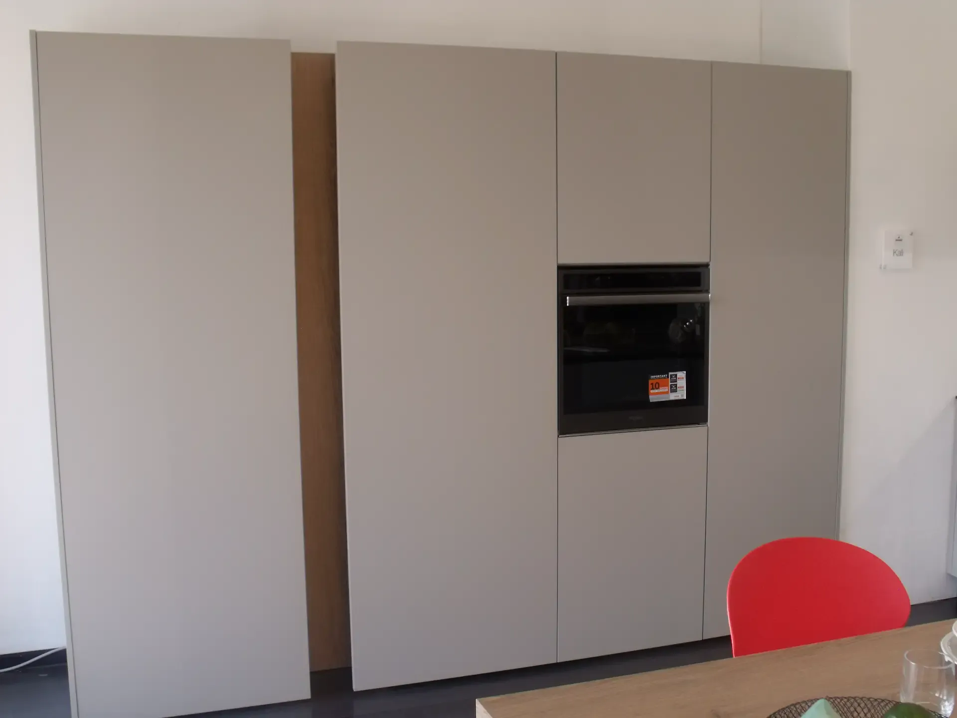 Parete composta da; colonna dispensa da 60 cm, colonna per incasso frigorifero da 60 cm, colonna dispensa da 60 cm con luce led interna a sensore volumetrico.