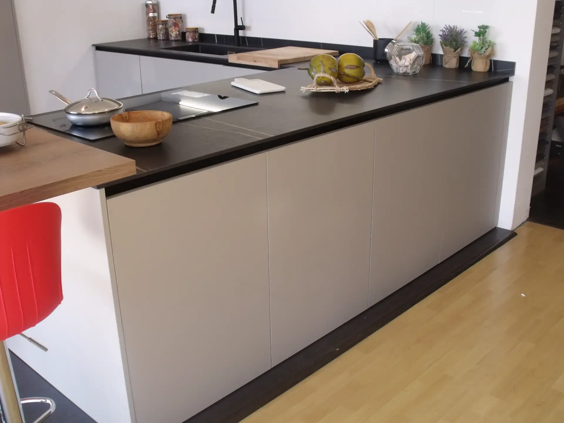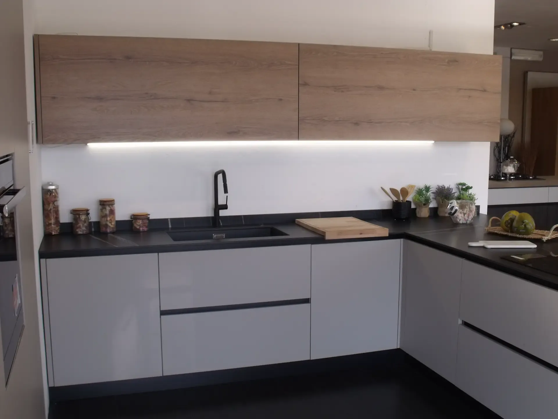 Cucina modello Kali con ante basi e colonne in pet opaco Pechino, pensili in laminato rovere nodato cuoio, zoccolo e gola alluminio anodizzato nero. Top in laminam Sahara Noir bocciardato.