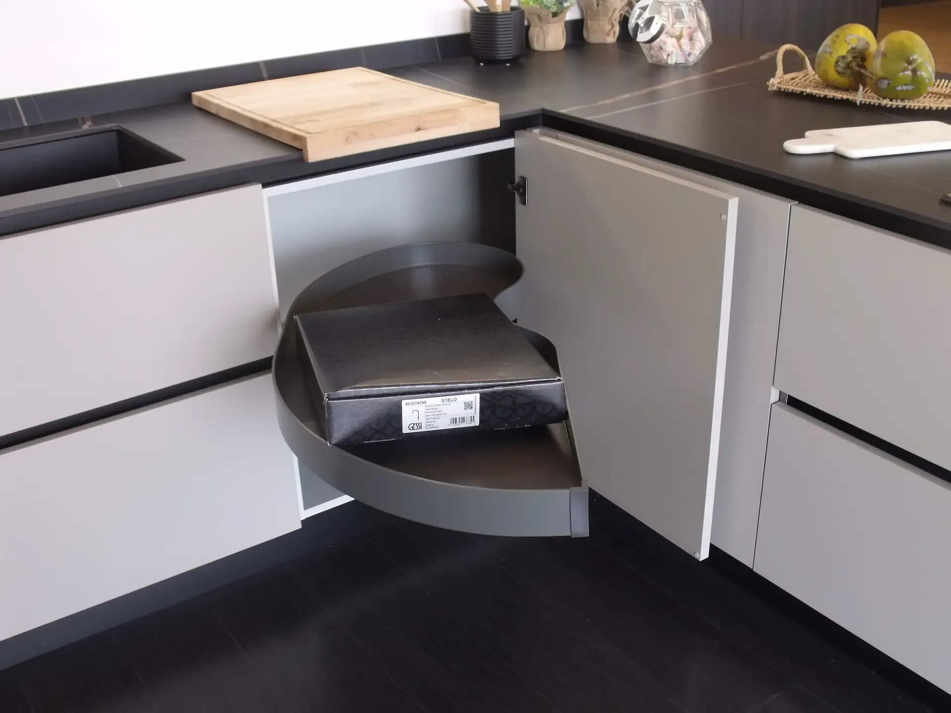 Cucina composta da; base 60 cm con cassetti interni, base lavello 90 cm 2 cestoni con raccolta differenziata, base angolo con cestelli ad estrazione totale, anta con lavastoviglie a scomparsa totale, base 120 cm 2 cestoni per incasso piano cottura ( adatti anche quelli induzione con cappa integrata).