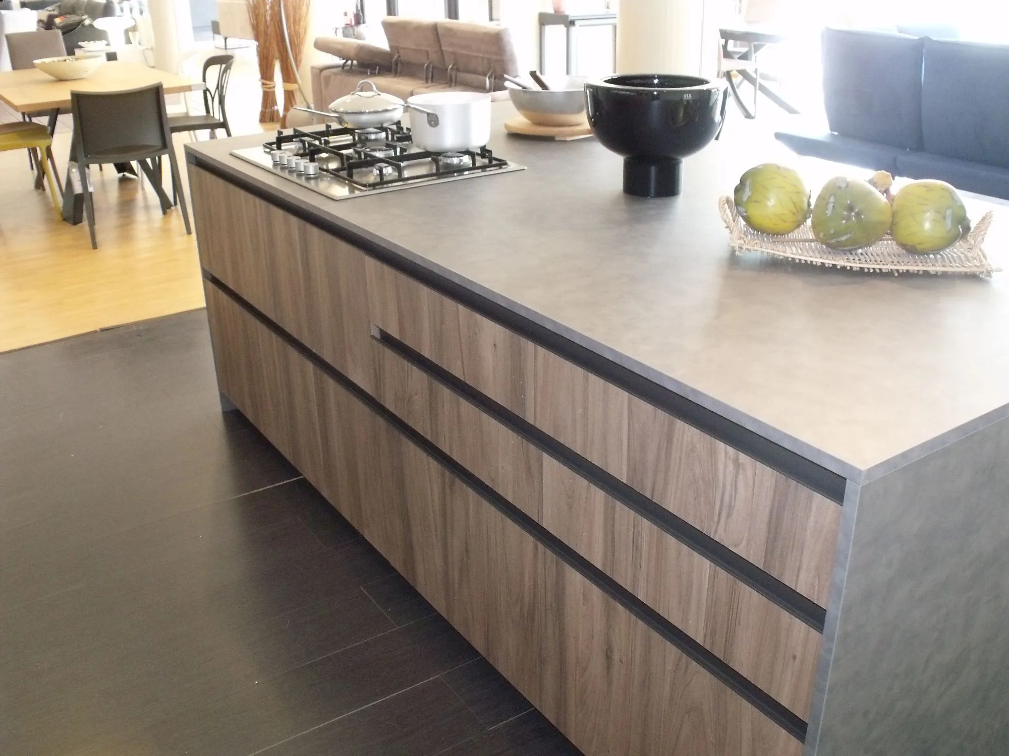 Cucina modello Z6, con maniglia ad incasso profilo brunita, ante basi laminato materico noce americano, colonne in resina grigia. Zoccolo brunito. La cucina è composta da una parete con anta per incasso lavastoviglie totalmente a scomparsa, base lavello da 120 cm ed una base ad una anta da 60 cm. L'isola comprende una base da 120 cm con 2 cassetti ed un cestone per incasso piano cottura, una base da 120 cm con 2 cestoni, e da 2 basi da 120 cm a due ante. Il gruppo colonne è composto da due colonne dispensa da 60 cm, una colonna forno da 60 cm e da una colonna frigorifero. Il top della cucina è in laminato effetto pietra, mentre il piano snack in laminato noce americano. Lavello semifilo in acciaio inox con miscelatore. La cucina è completa di elettrodomestici Whirlpool; piano cottura a 5 fuochi, lavastoviglie a comandi a scomparsa, forno termoventilato , frigorifero linea Everest. Il costo è comprensivo di Iva. Trasporto gratuito entro 100 Km. Da computare a parte il montaggio.