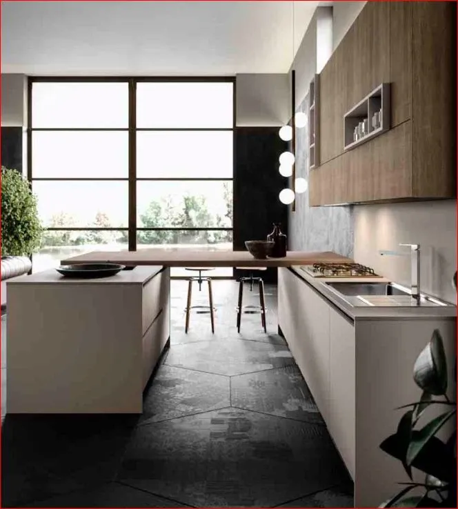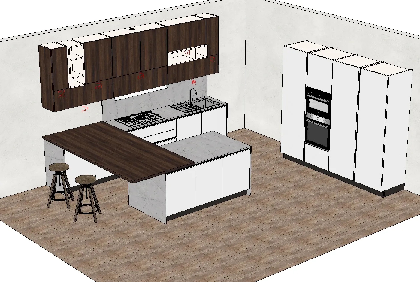 Composizione ROUND 5 funzionale ed elegante sia nell'utilizzo dei materiale che nell'accostamento dei colori. Le linee decise disegnate da gole e zoccoli in metallo brunito conferiscono un tono deciso e contemporaneo. Finitura in laminato bianco a poro registro e laminato Noce America per pensili e bancone snack. Colonne in altezza cm.216 mentre i pensili in altezza cm. 240 - cucina scontata con iva e trasporto a Euro 9.300,00
