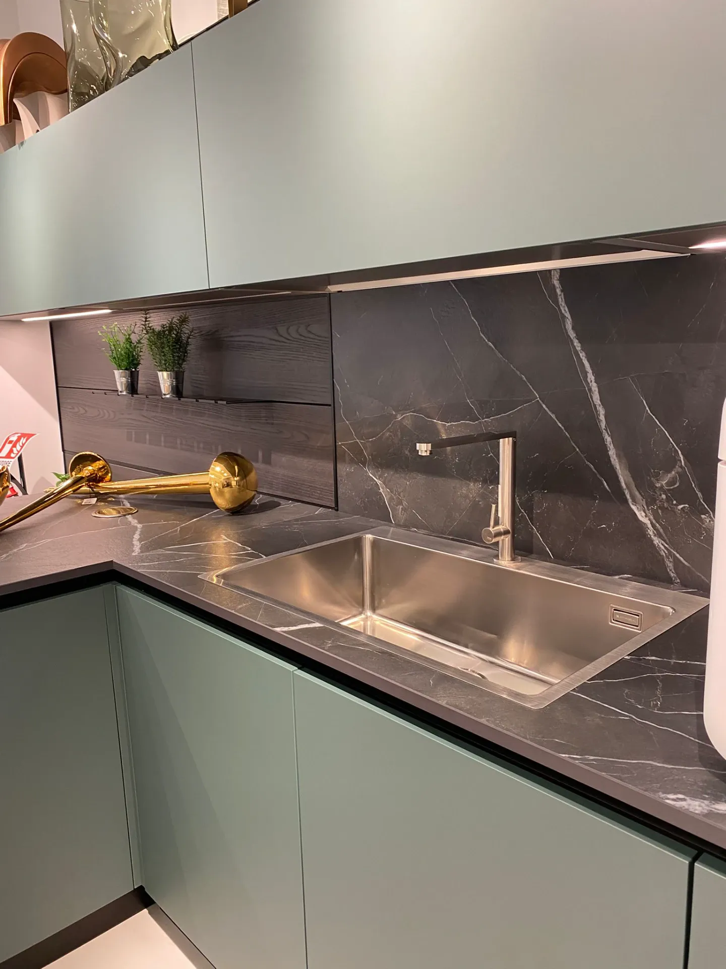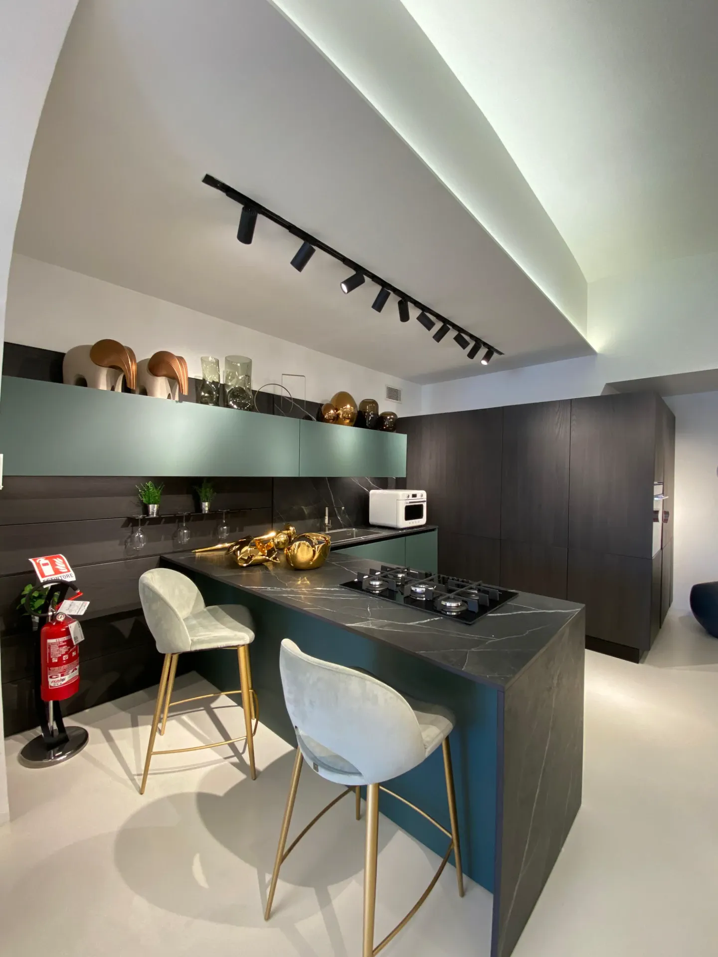 Le ante in Kalì Amazonia 1373 si combinano con il laminato Rovere Fumé in un contrasto caldo e contemporaneo. La gola e lo zoccolo nero aggiungono un dettaglio grafico elegante, mentre il top in quarzo Cava Black Matt 1509 (spessore 2 cm) dona robustezza e matericità, oltre a un impatto visivo deciso.