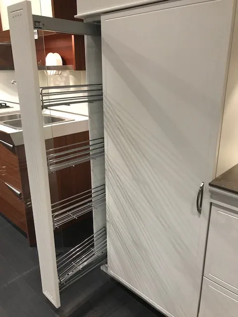 Elegante e raffinata cucina angolare, con vetrinetta illuminata. La Florence di Snaidero in legno laccato rovere white a poro aperto, prende ispirazione dai canoni architettonici del rinascimento. Misure: L.305x305 H.170P. Accessoriata con meccanismi estraibili agli estremi della composizione (vedi foto) L'angolo è fornito di cestello girevole estremamente comodo e pratico. Top e schienale in marmo Caesar Brown. Gruppo elettrodomestici electrolux: piano cottura 5 fuochi inox e griglie in ghisa, forno ventilato, lavello 2 vasche inox con miscelatore incluso. NO LAVASTOVIGLIE. ESCLUSO MONTAGGIO