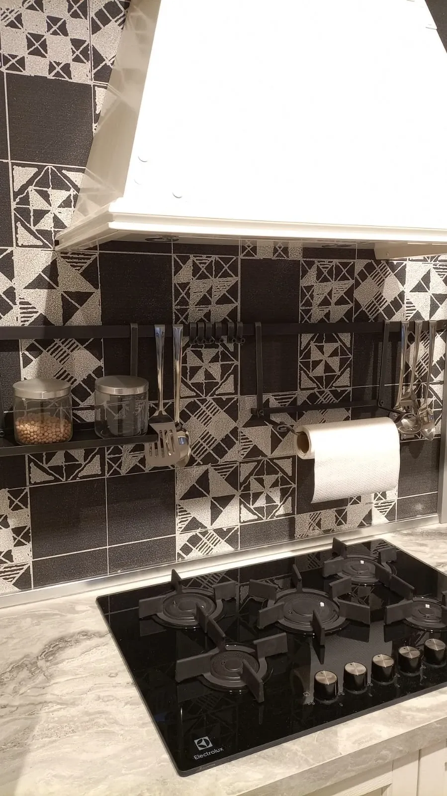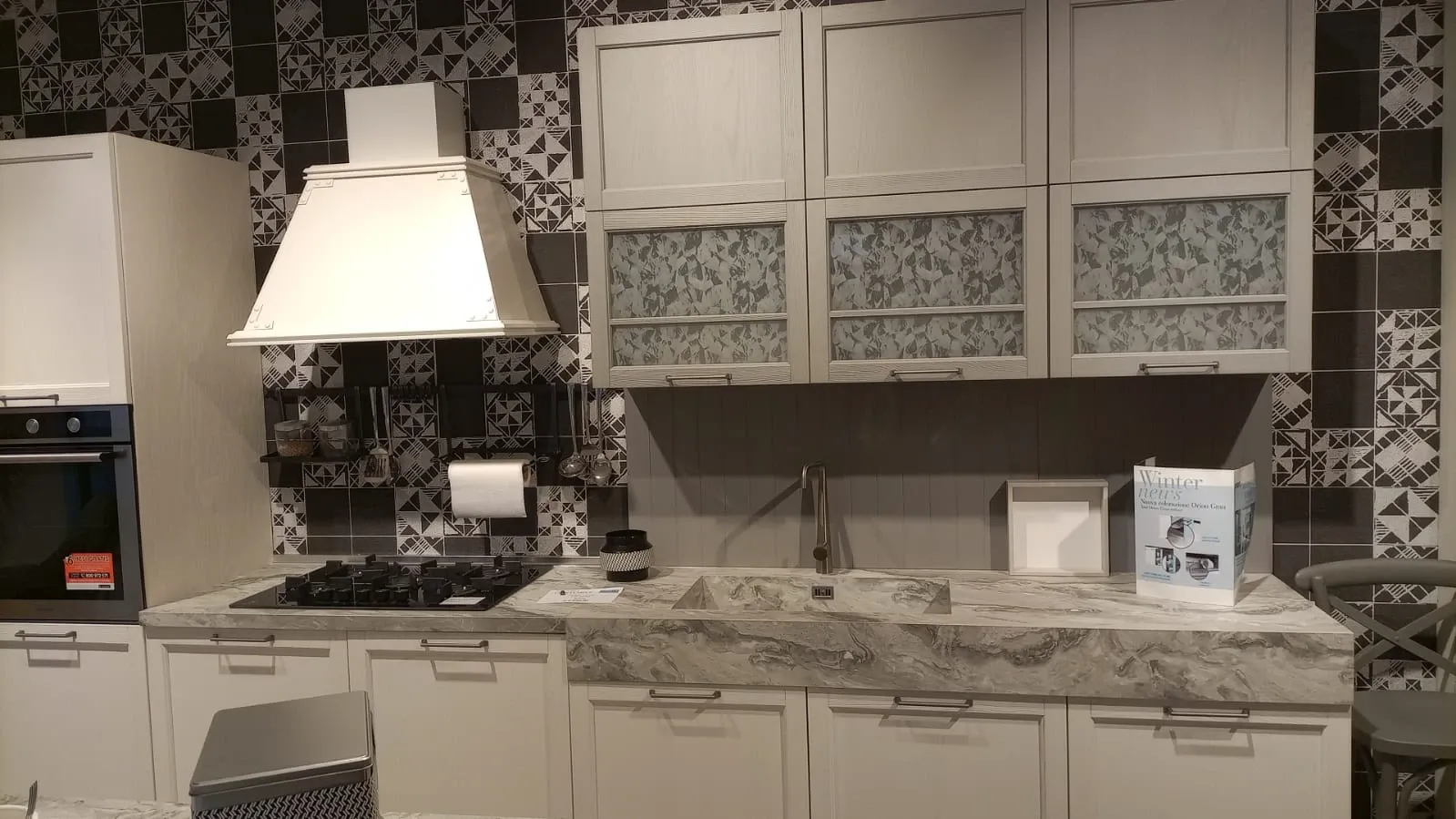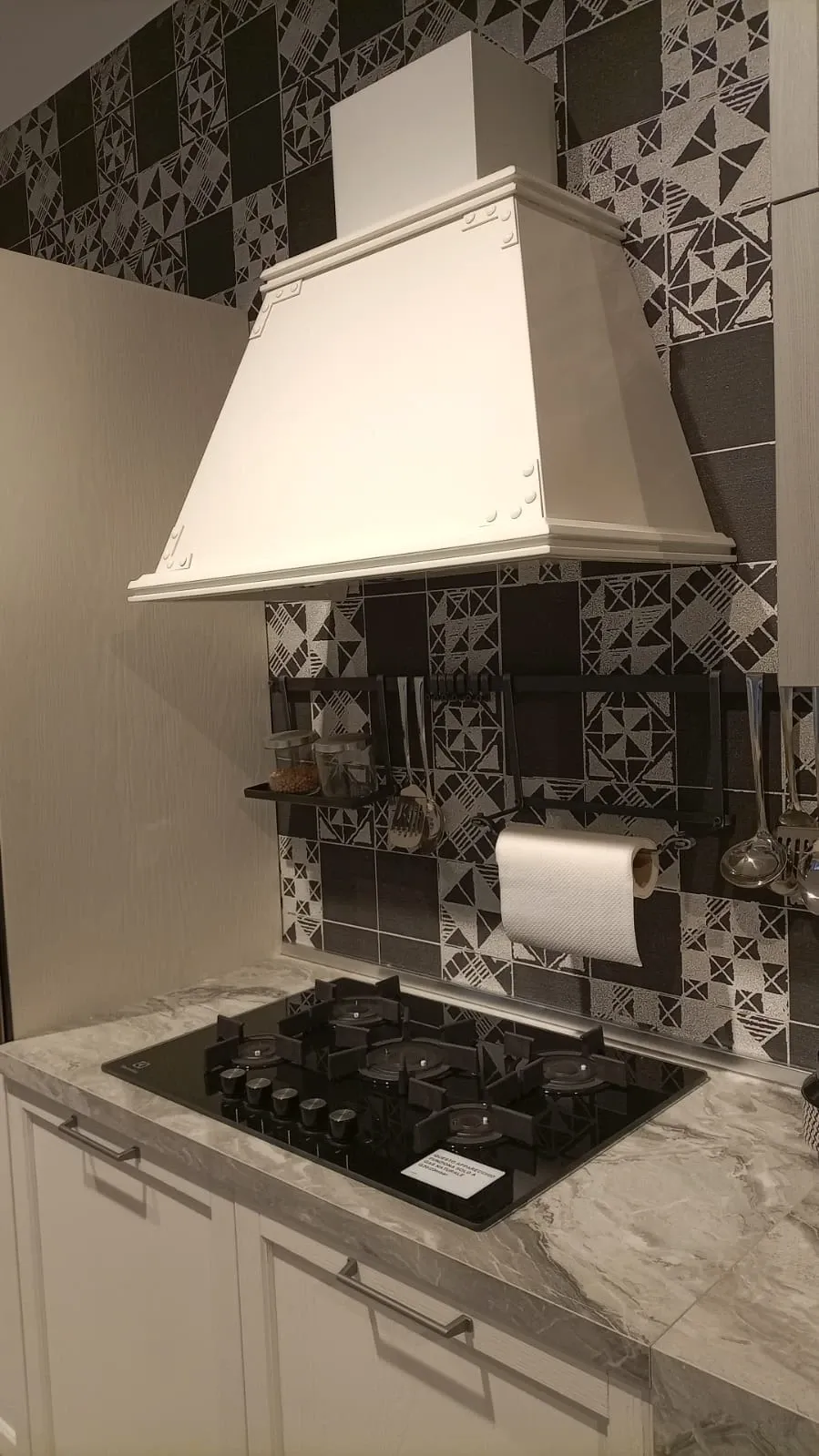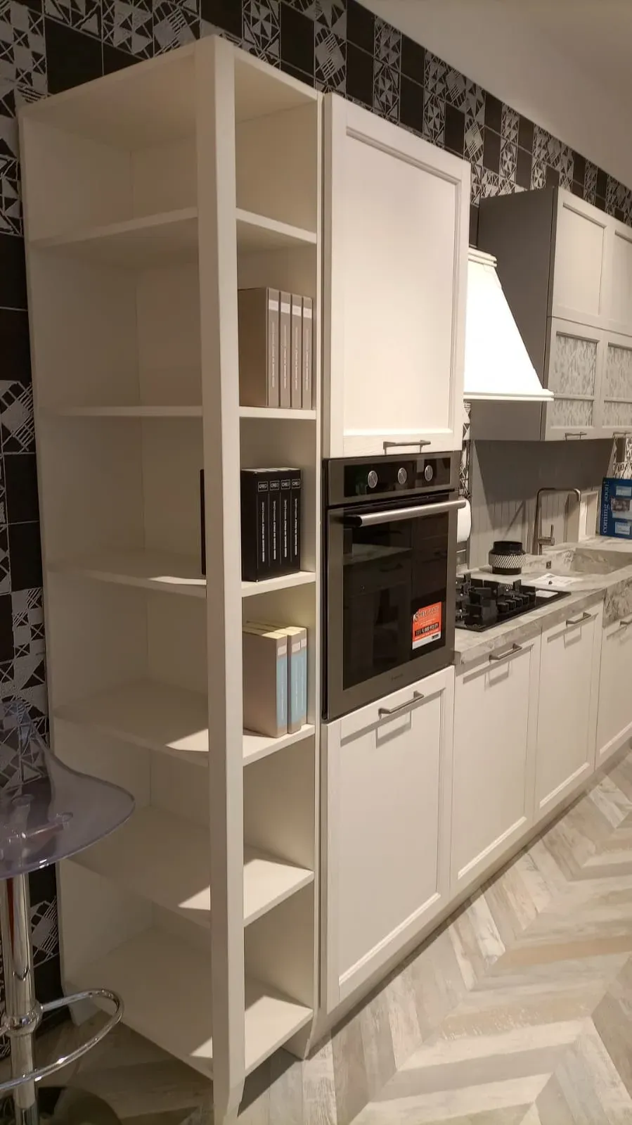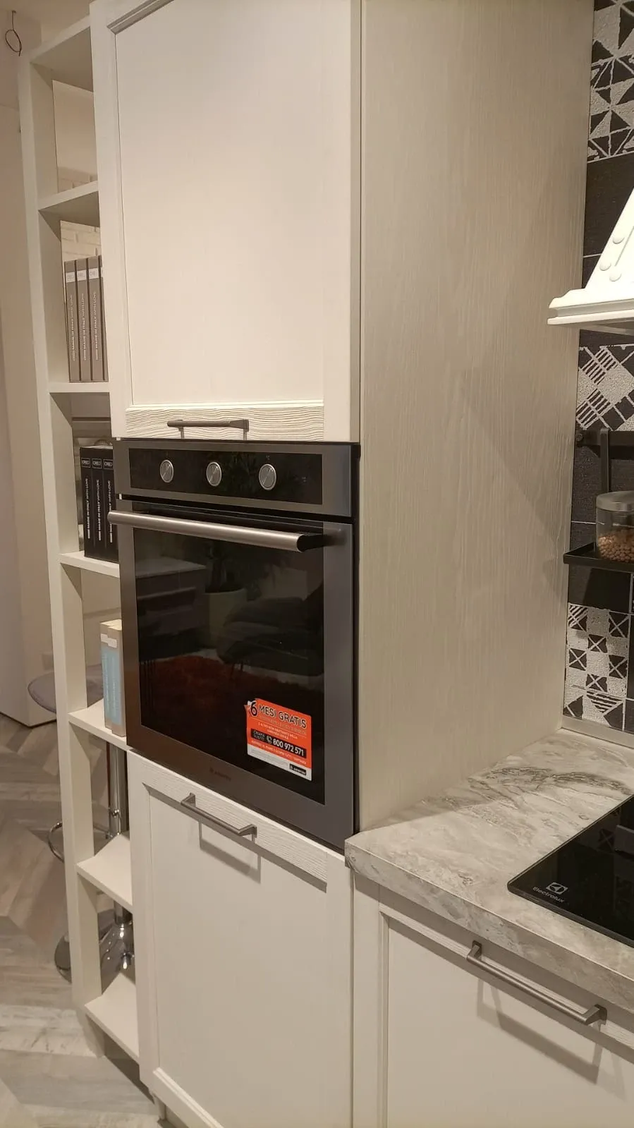 ELETTRODOMESTICI: forno multifunzione HOTPOINT nero; lavastoviglie a scomparsa HOTPOINT; piano cottura a gas HOTPOINT linea premium con griglie in ghisa; lavello come top monovasca ; miscelatore CROLLA monocomando inox; cappa camino da 80 cm filtrante KDESIGN in metallo verniciato colore bianco; kit barra accessori colore nero + 1 porta rotolo e 1 mensola.