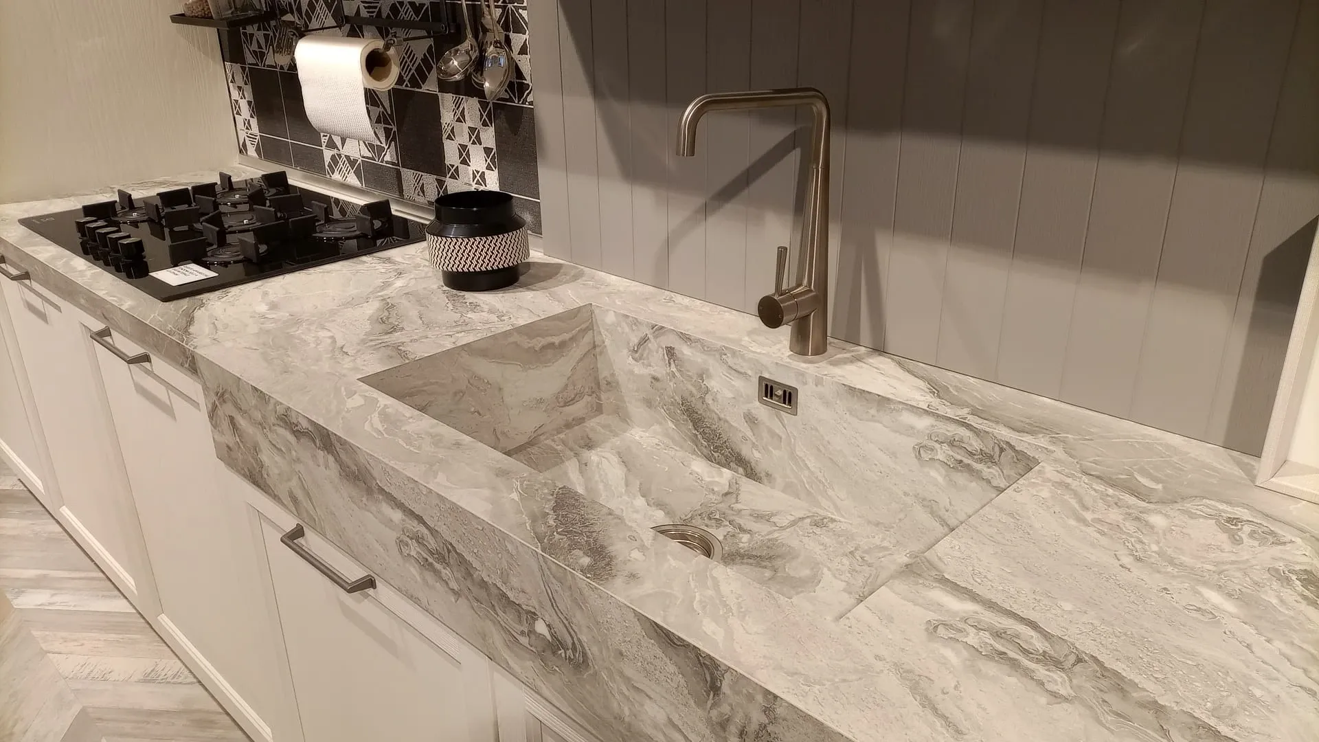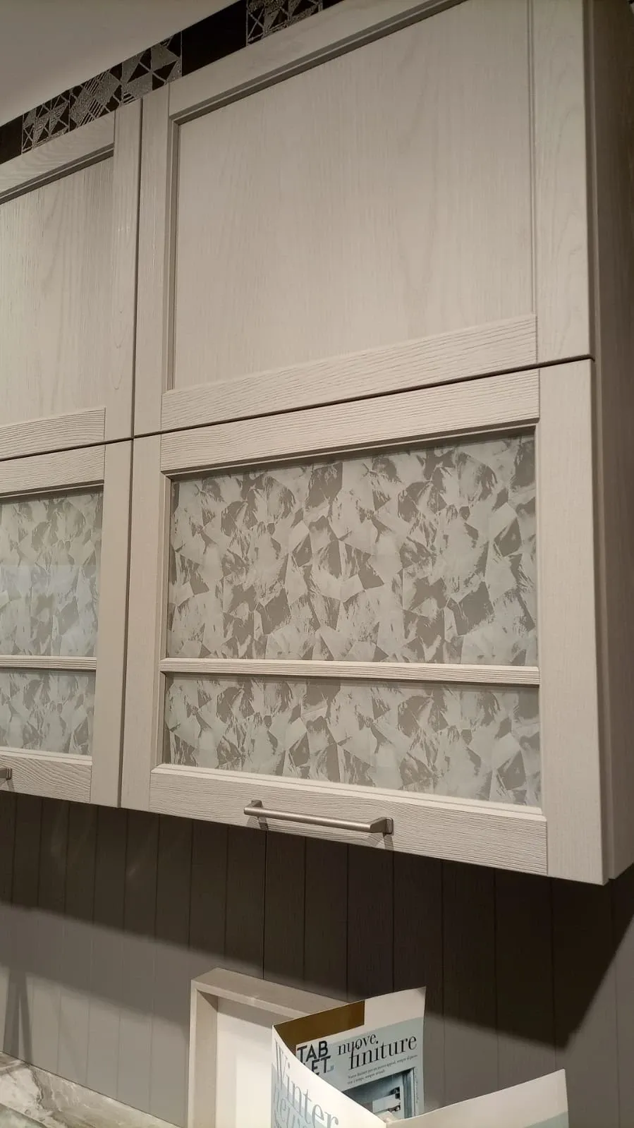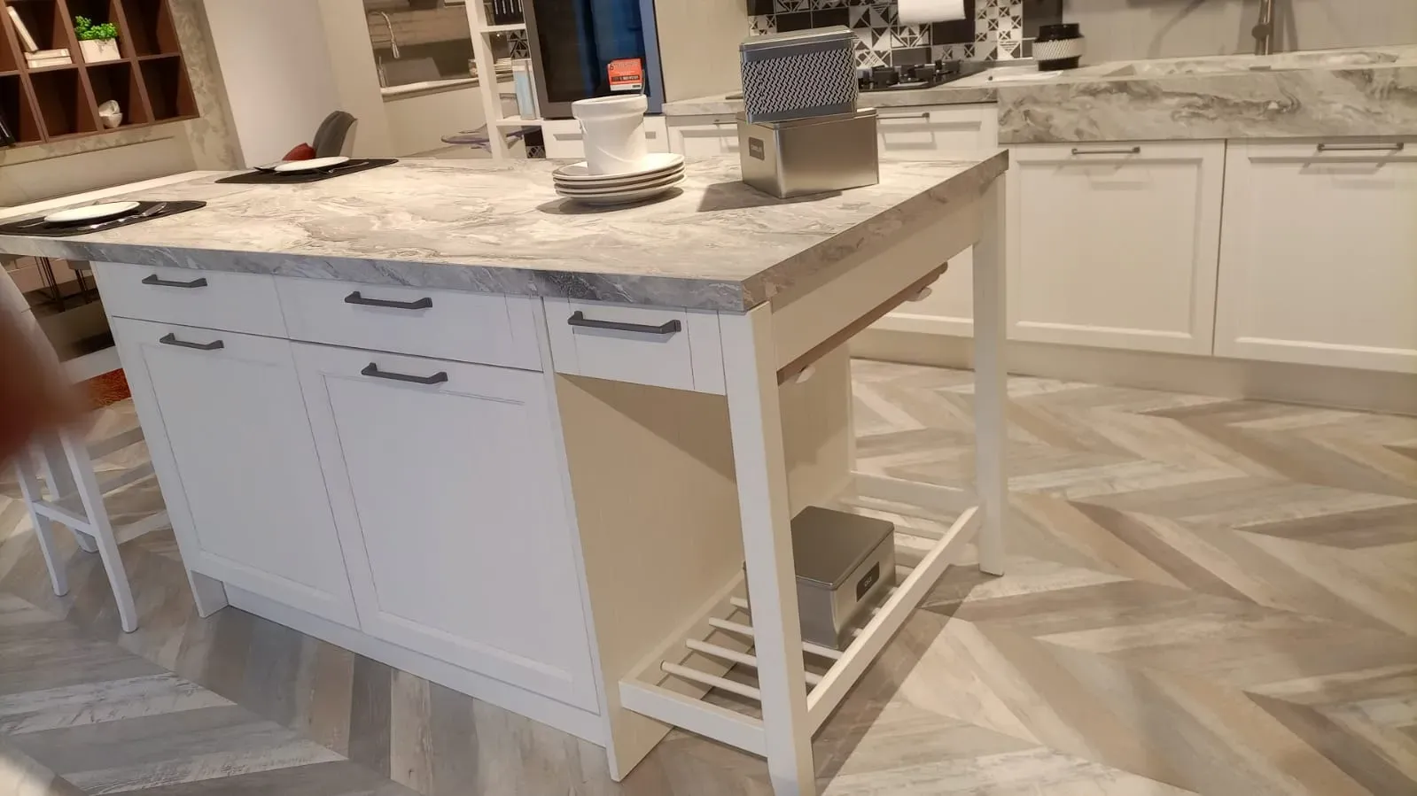 SCHEDA TECNICA: basi, colonne e isola impiallacciati, ante con telaio frassino bianco; ante pensili in frassino a poro aperto colore argilla + ante con telaio inglesina e vetro fume; top in laminato H 16 Cm lato lavello e 4 cm lateralmente, finitura bardiglio grigio opaco plamky; schienale impiallacciato fresato sp. 19 mm finitura frassino argilla; zoccolo H 13 cm finitura come basi; maniglie verniciate finitura antracite.