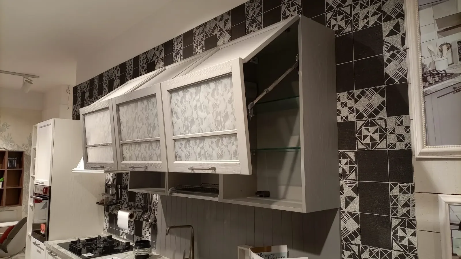 Base per piano cottura con anta battente e 2 cassetti + 1 cestone estraibili; pensile colapiatti anta a ribalta in vetro; 2 pensili anta ribalta in vetro con mensole intere in vetro; colonna terminale a giorno con 6 vani H 217 cm.