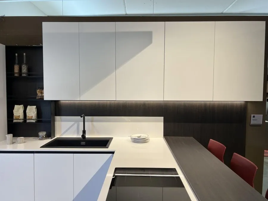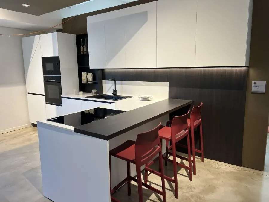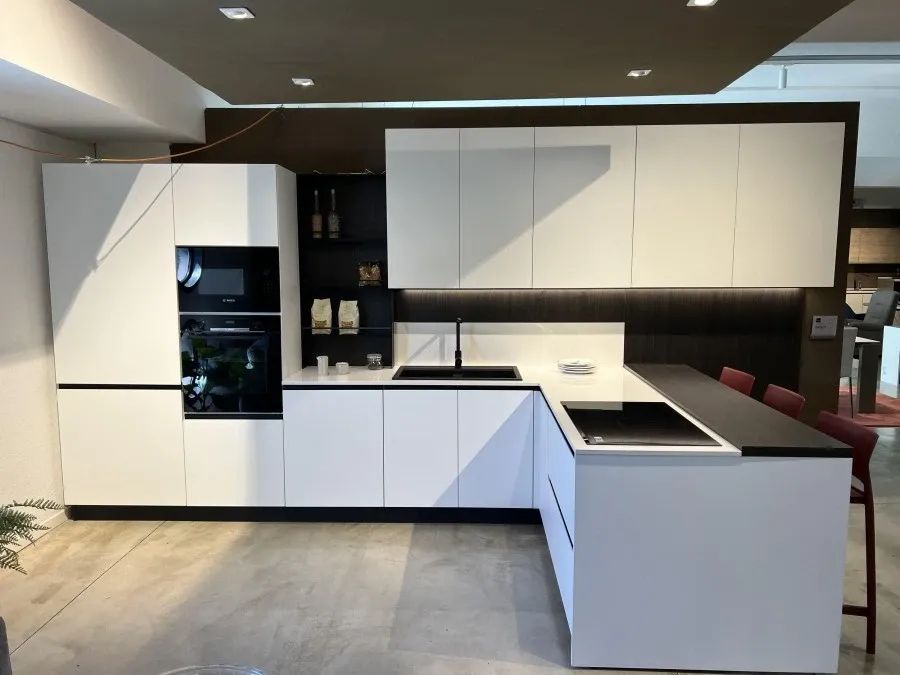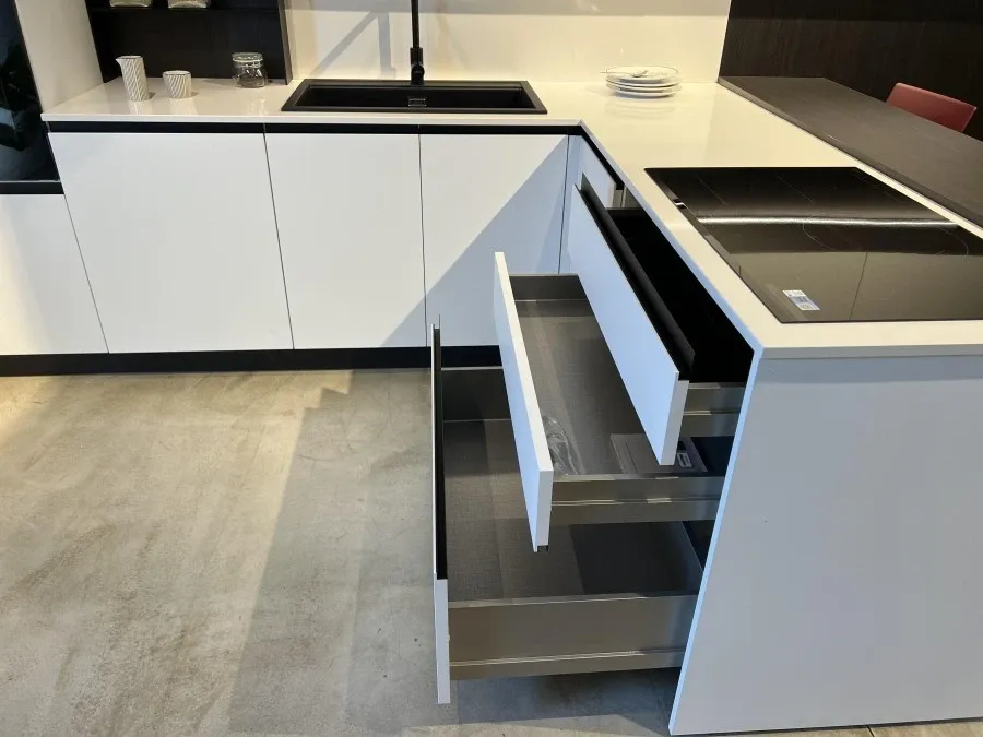 La Cucina angolare Stosa Cucine Infinity rappresenta l'equilibrio perfetto tra eleganza e funzionalità, ideale per chi desidera un ambiente moderno e raffinato. Le ante in bianco opaco conferiscono un aspetto pulito e luminoso, creando un'atmosfera accogliente e contemporanea. Questo design minimalista è ulteriormente esaltato dal top in quarzo, che non solo aggiunge un tocco di lusso, ma garantisce anche resistenza e durata nel tempo.