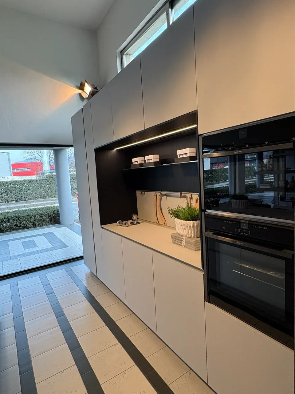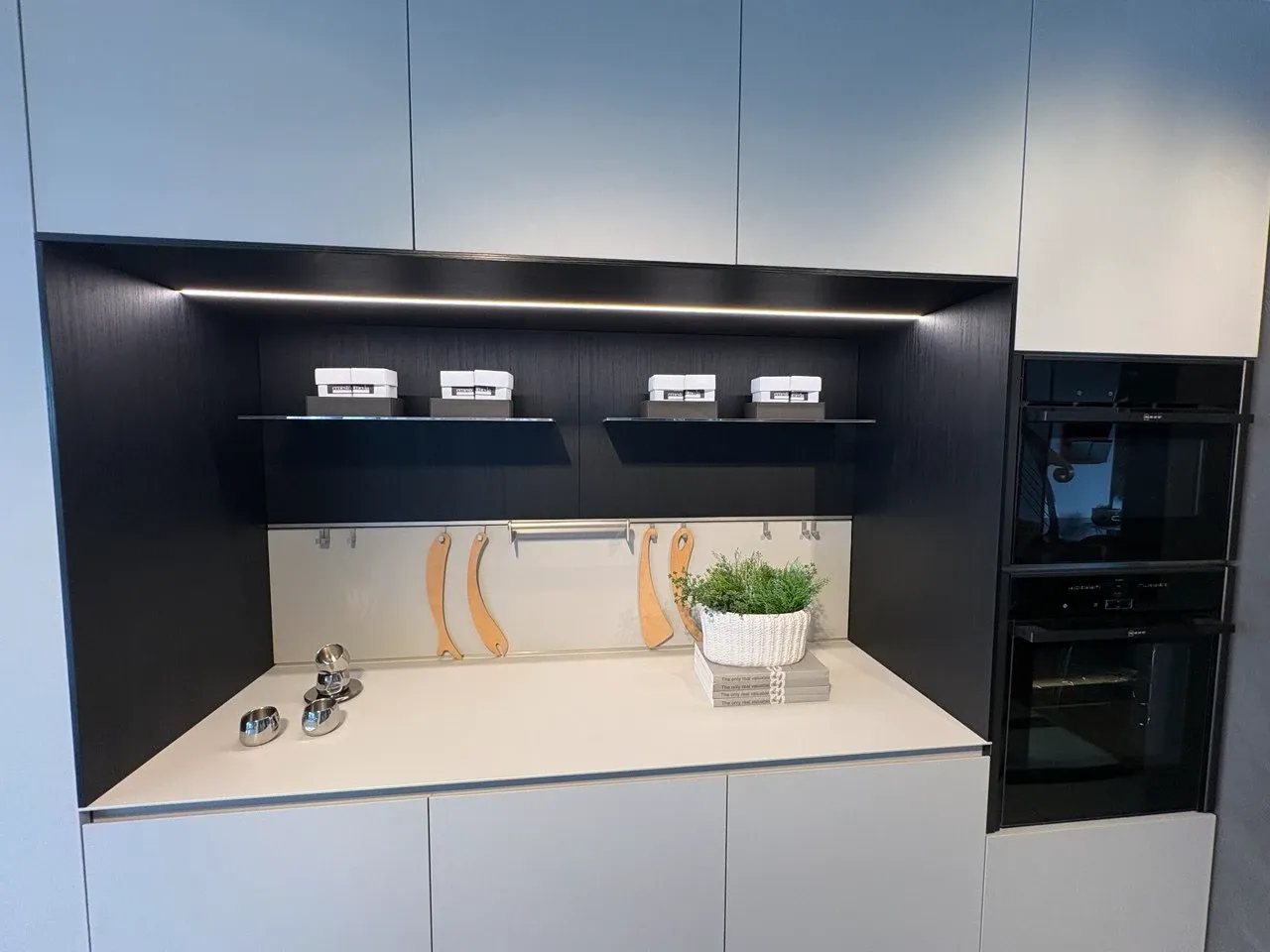 - La cucina modello Obliqua qui visibile non prevede nessuna cappa: se ne desideri una, potrà essere richiesta con un supplemento sul prezzo iniziale.