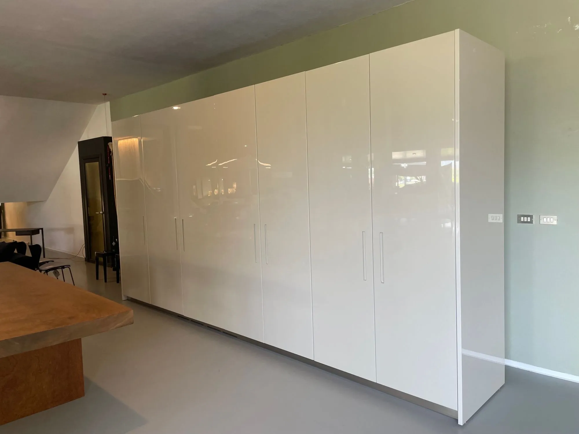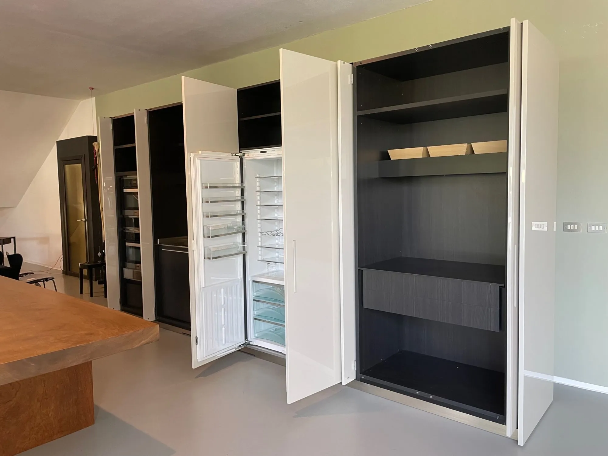 Colonne con cucina a scomparsa, capiente e funzionale, disegnata per Boffi da Piero Lissoni, la cucina HIDE in poliestere Ciottolo è molto elegante, perfetta quando si desidera mascherare la zona operativa. Due forni Miele, il cassetto termico scaldavivande di Gaggenau, lavello a una vasca con rubinetto inox e saltarello, piano cottura a induzione, frigorifero e congelatore a colonna Miele completano in modo ottimale lo spazio dedicato al contenimento e allo stivaggio di stoviglie e dispensa, le ante scorrevoli e rientranti permettono di cucinare in modo pratico e di schermare la cucina in modo veloce per il living più ordinato ed elegante!