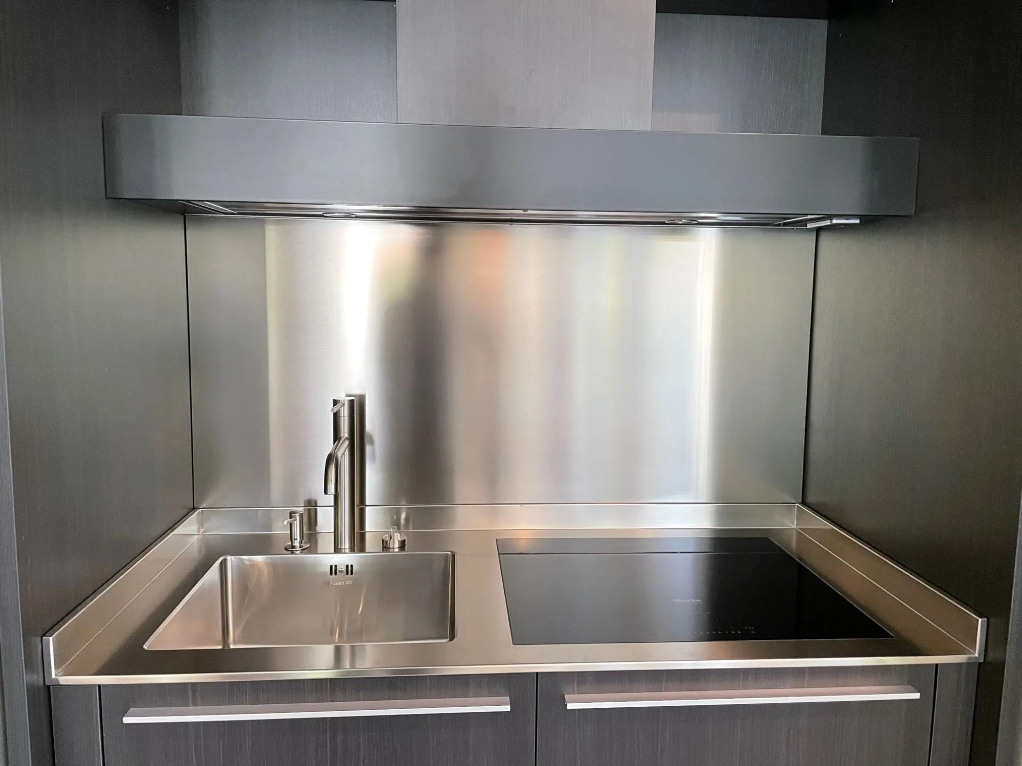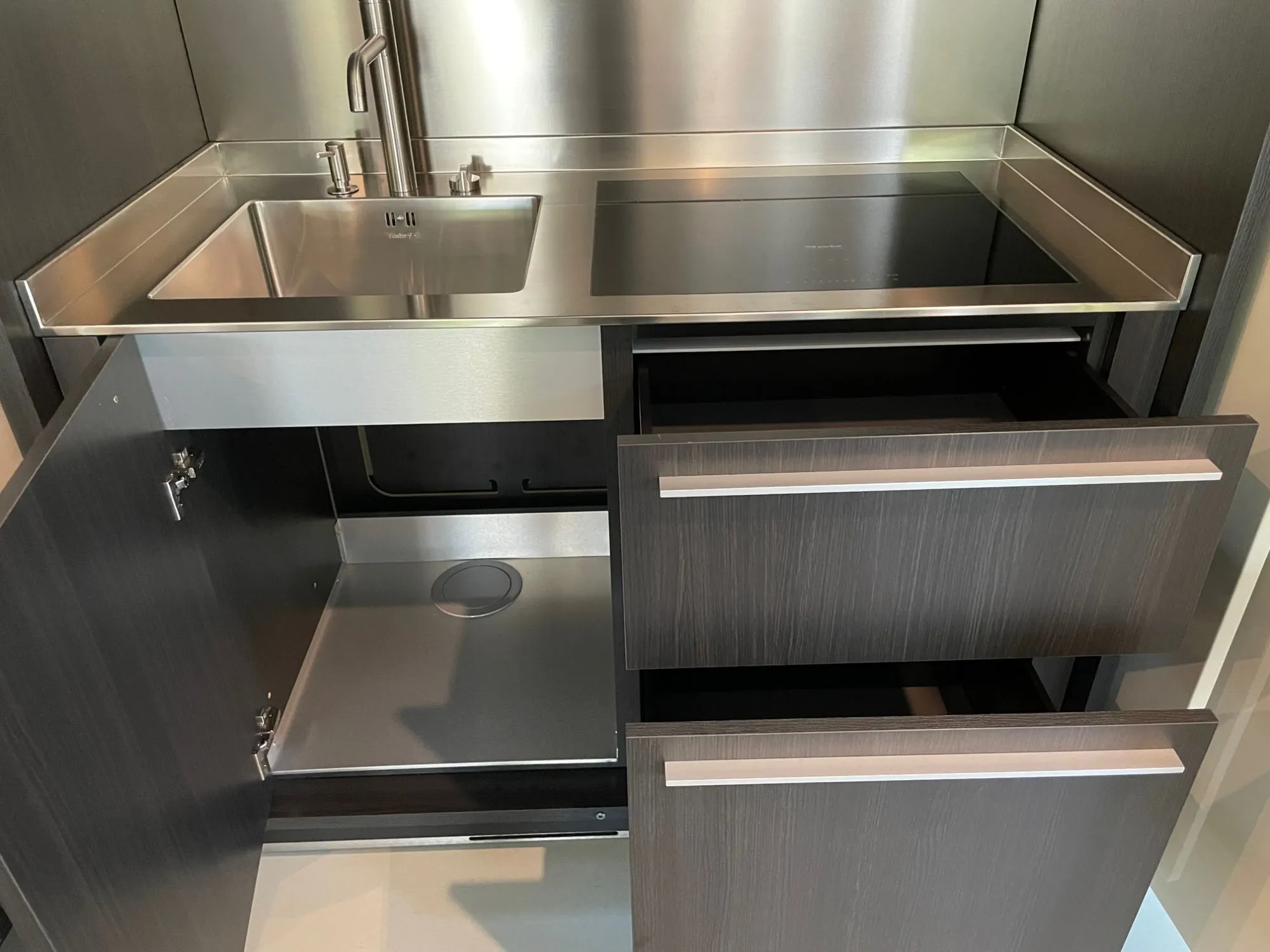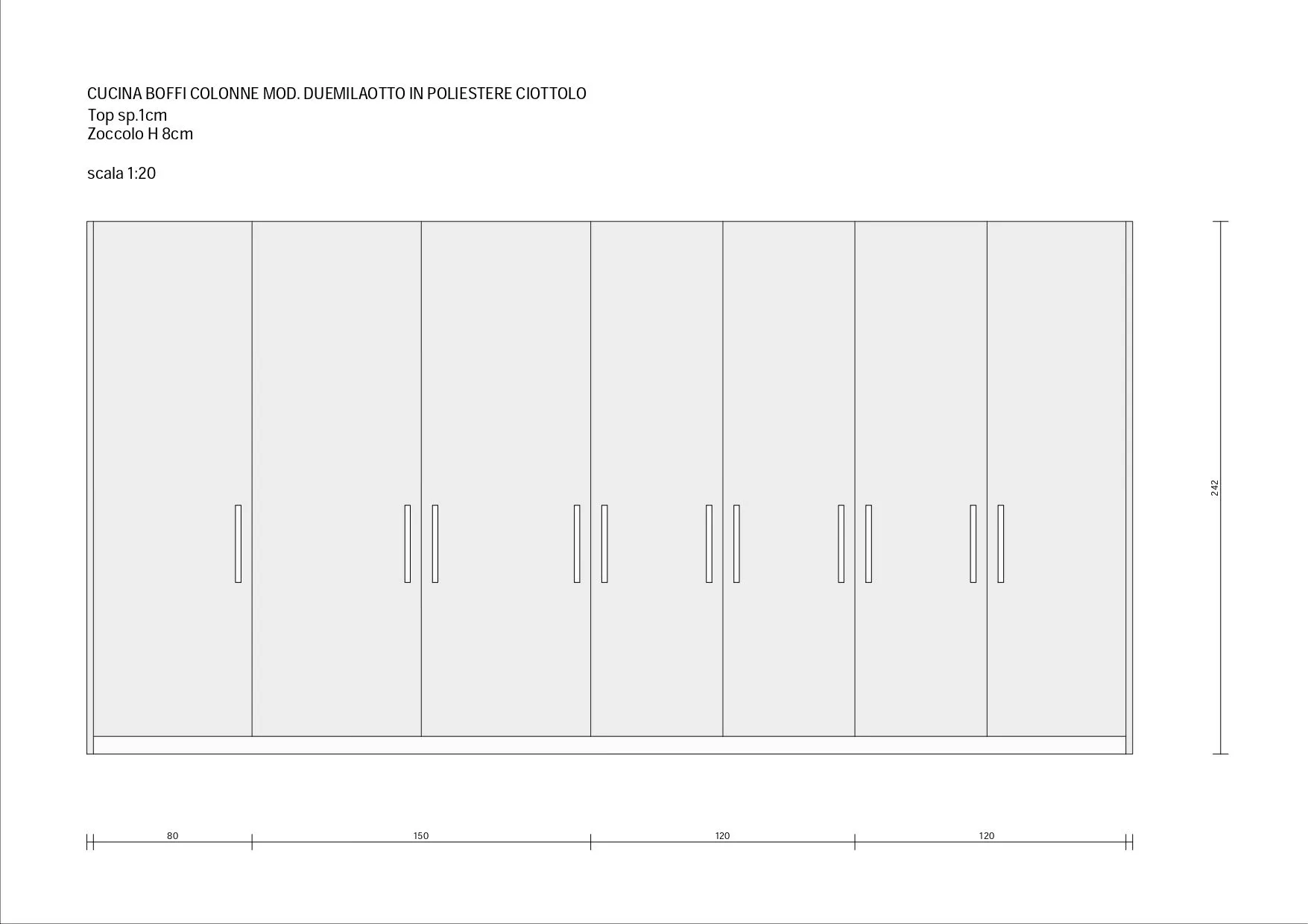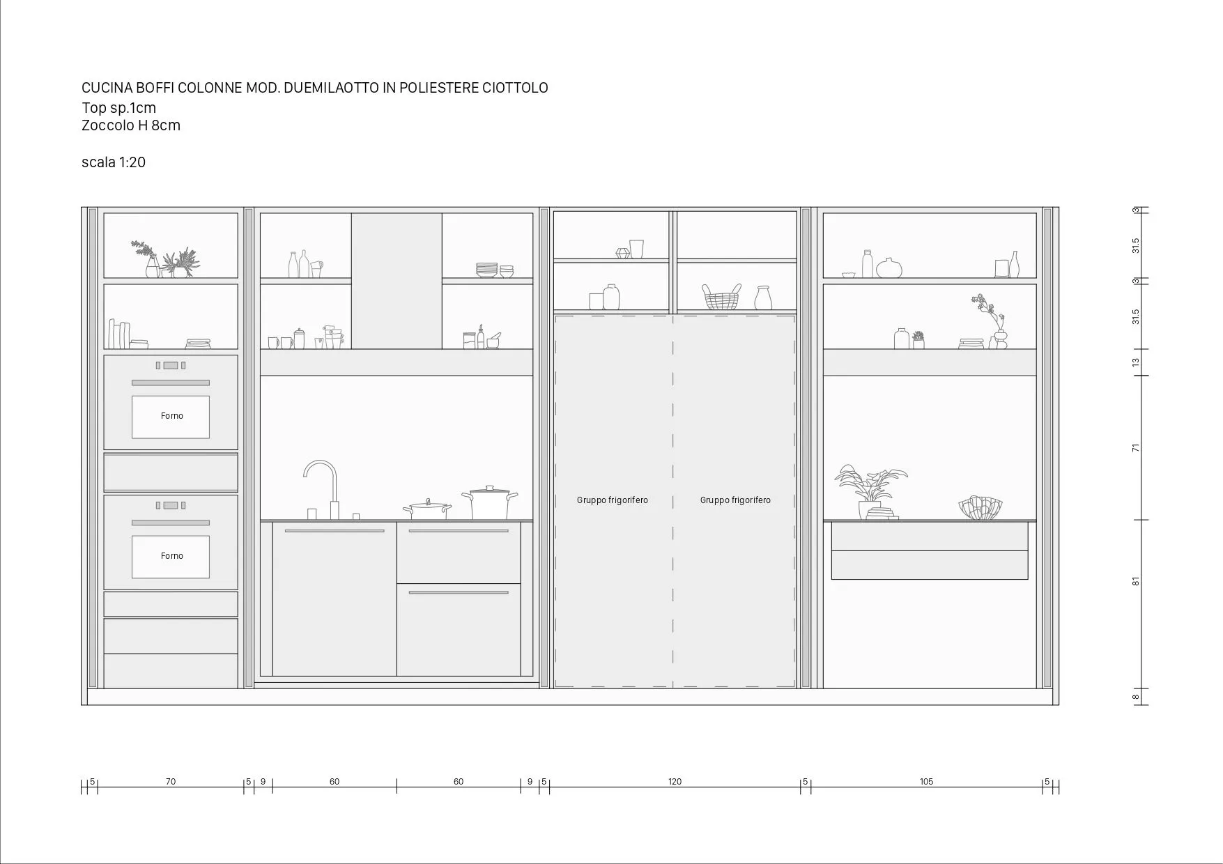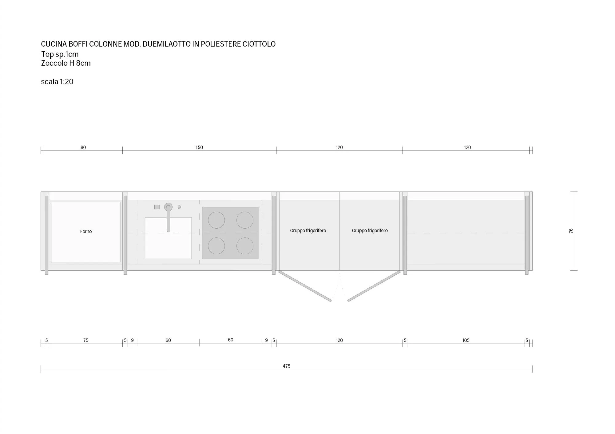 • Struttura laminato rovere grafite • Frontali e fianchi laccato poliestere ciottolo • CM. 475x76x242h • Elettrodomestici Miele e Gaggenau • 2 forni • Cassetto termico • Frigocongelatore • Congelatore • Piano cottura induzione • cappa • piano estraibile 105 • Profondità maggiorata • Ante scorrevoli e rientranti • Top acciaio lavaggio e cottura • Top nobilitato piano ribaltabile