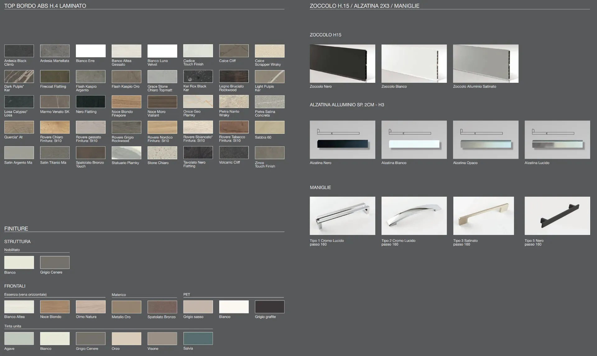 COME FUNZIONA? SCEGLIERE LE FINITURE TRA QUELLE PRESENTI NELLA TABELLA ALLEGATA ; ANTE ,TOP ZOCCOLI E ALZATINE. INFINE SCEGLIERE LA MANIGLIA.