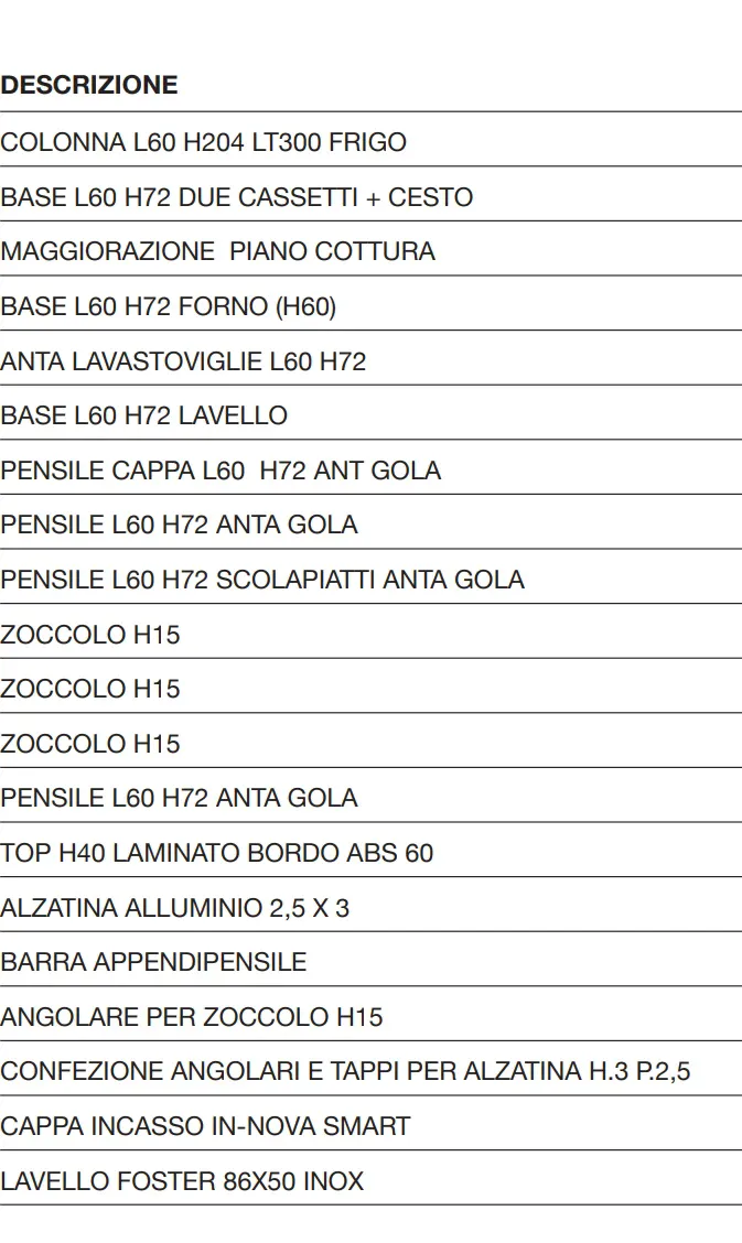LA CUCINA CAPRI DI IMAB VIENE FORNITA COMPLETA DI LETTRODOMESTICI RIPORTATI NELLA DESCRIZIONE, UNICA POSSIBILITA DI CAMBIO E IL PIANO COTTURA IN QUANTO LO SI PUO RICHIEDERE A GAS SU QUOTAZUIONE A PARTE. IL MISCELATORE E COMPRESO.
