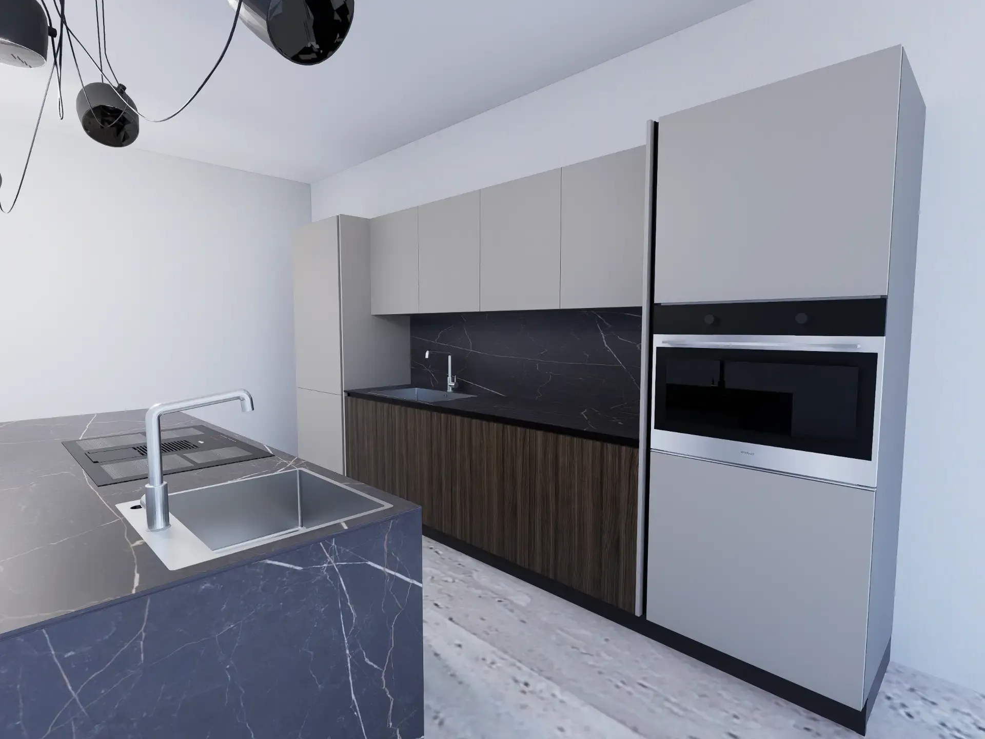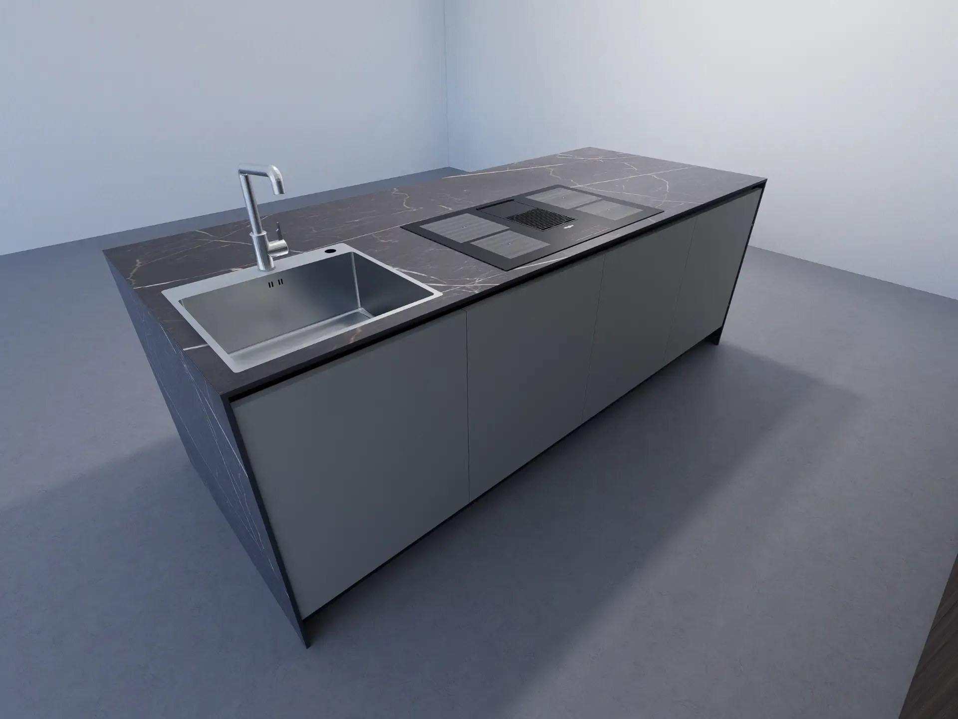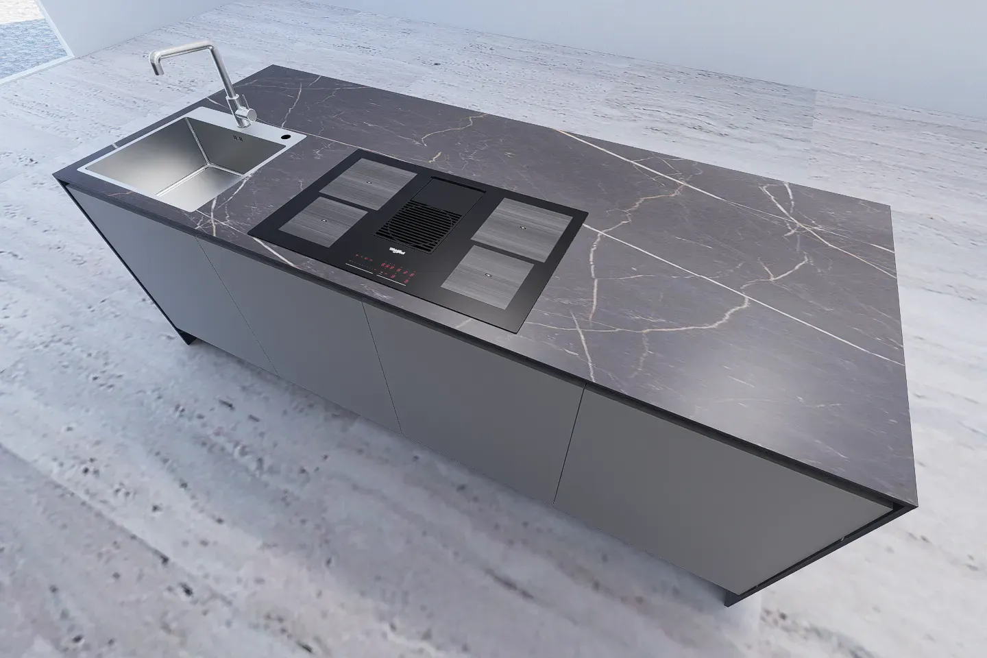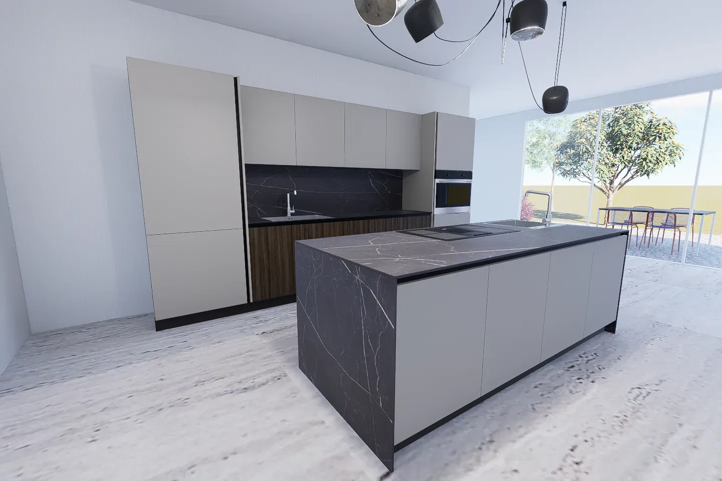 Mottes mobili propone questa cucina mod. Kali lineare di cm.400 e isola centrale da cm.242 p.100 con piano cottura induzione con cappa integrata, frigo cm.75, lavastoviglie a scomparsa e forno a colonna da cm.75 Tutta in finitura laminato PET con piano, schienale e fianchi isola in laminato HPL sp.1.2. Essendo una cucina su progettazione è completamente personalizzabile nelle misure e nelle finiture. La proponiamo compreso Iva e trasporto a Euro 11.700,00