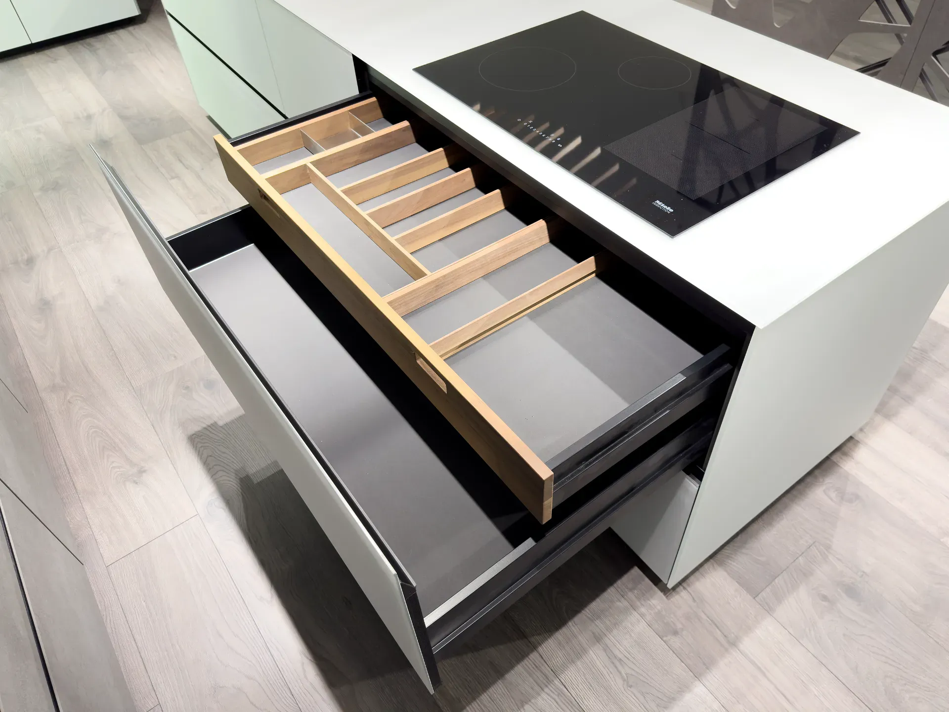 Set accessori cassetto portaposate in noce canaletto e sistema raccolta differenziata;