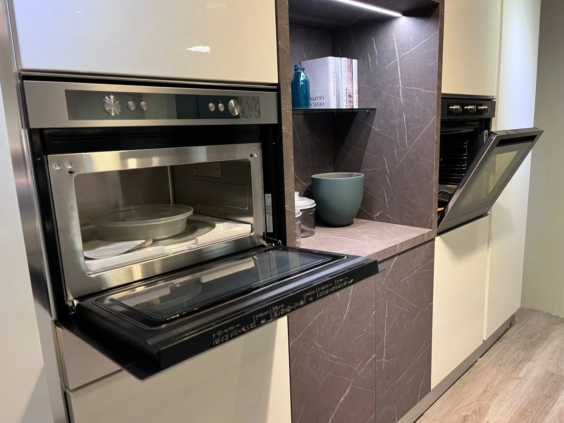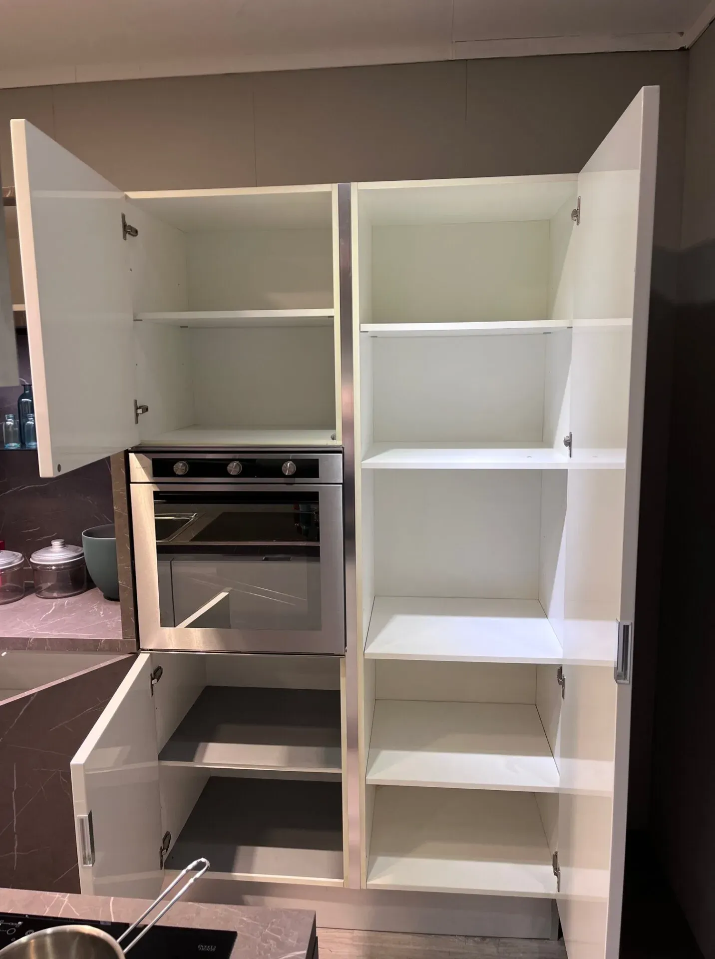 Parete colonne con elettrodomestici, dispensa e ampio vano a giorno centrale con illuminazione LED