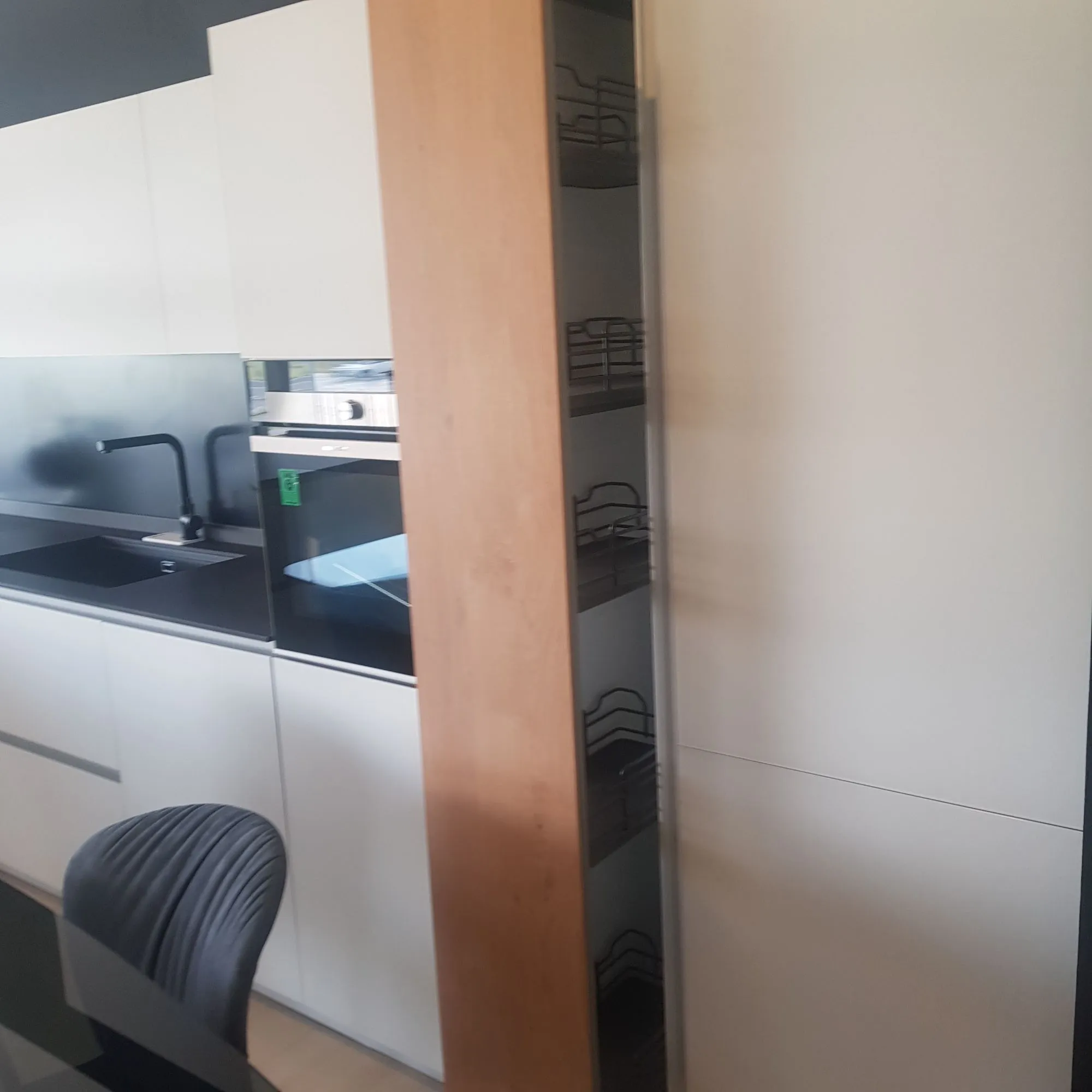 CUCINA DOIMO ASPE TELAIO ALLUMINIO CRISTALLO LACCATO BIANCO OPACO CON TOP IN GRES LAMINAN SP. 1.2 CON PARTI IN TELAIO ALLUMINIO E LEGNO ROVERE SBIANCATO, DIMENSIONI CM. 272X97 PENISOLA E 430X60 FRONTE H. 206 CON ZOCCOLO H. 8 PENSILI RIALZA CON SCOLAPIATTI COLONNA CON CESTI ESTRAIBILI