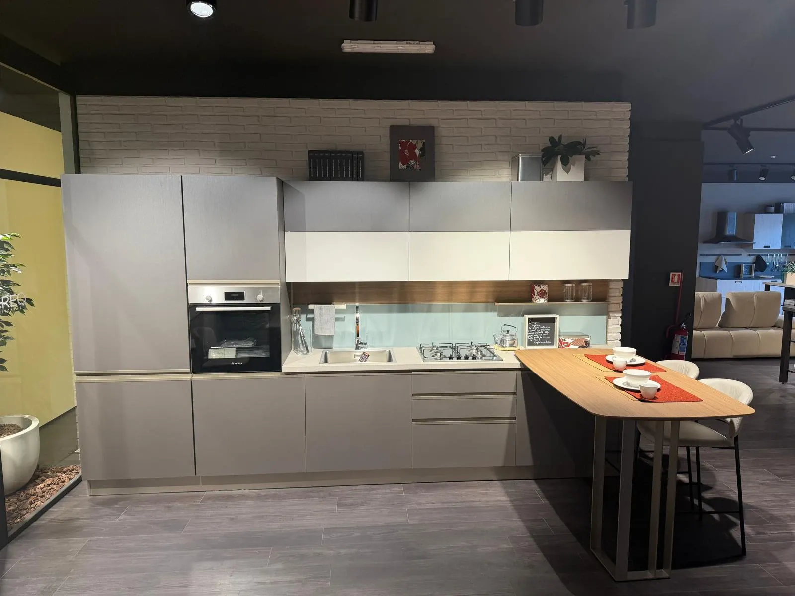 Le tonalità neutre e le superfici materiche creano un atmosfera sofisticata e rilassante, mentre il piano snack in legno introduce un elemento di convivialità, ideale per vivere la cucina non solo come area operativa, ma anche come luogo di incontro e condivisione.