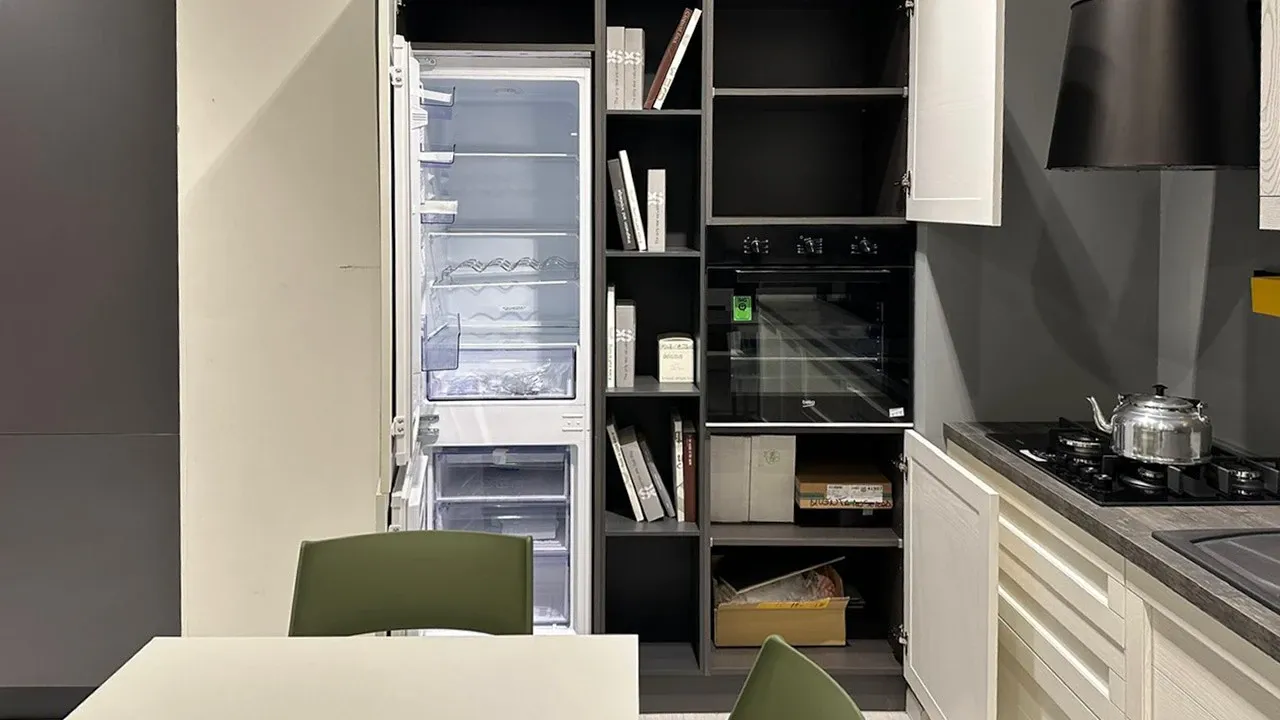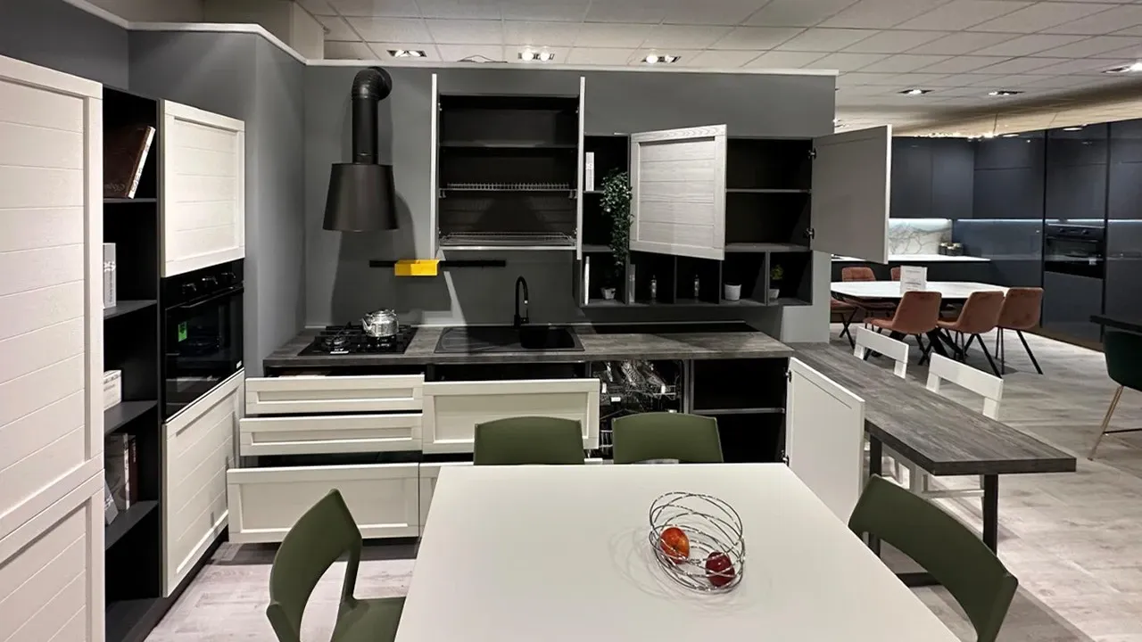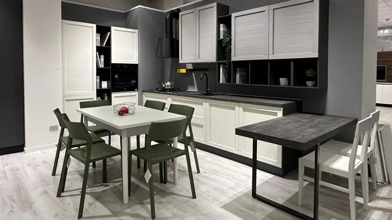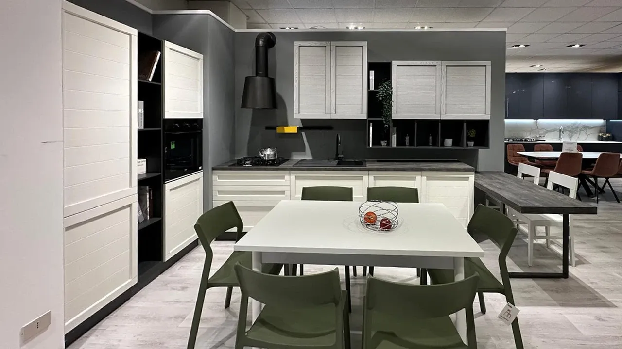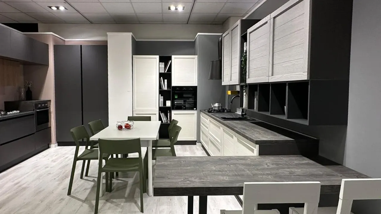 Cucina Elsa in promozione all'interno dello Store di Modugno (BA) nelle finiture bianco e grigio fumo con presa maniglia integrata nel telaio in massello di frassino.